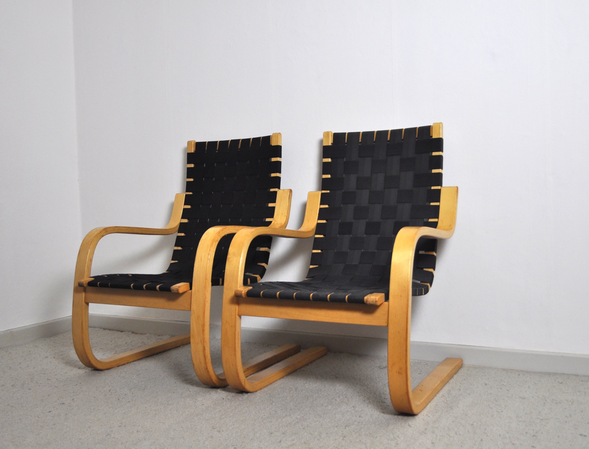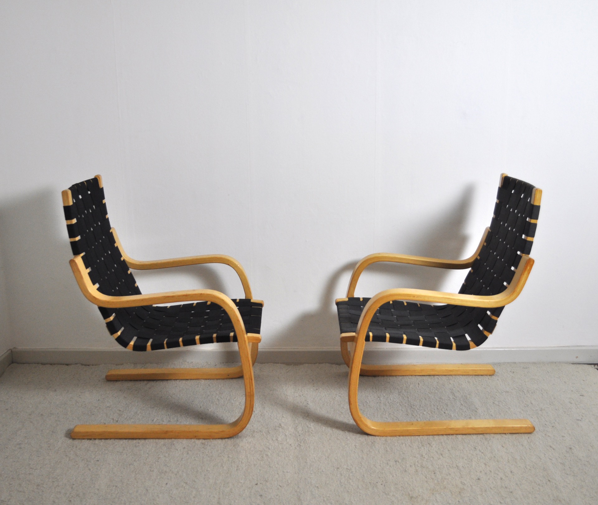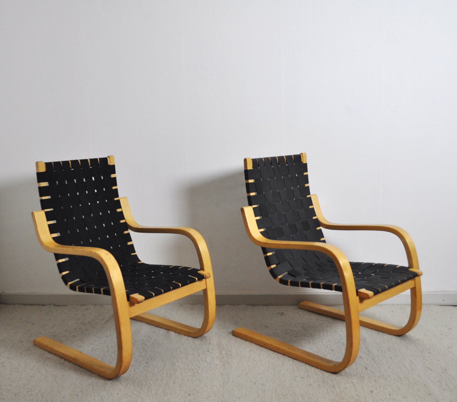 Cantilevered lounge chairs model 406 designed by Alvar Aalto for Artek. Bent laminated birch wood frames with woven canvas strapped seating.