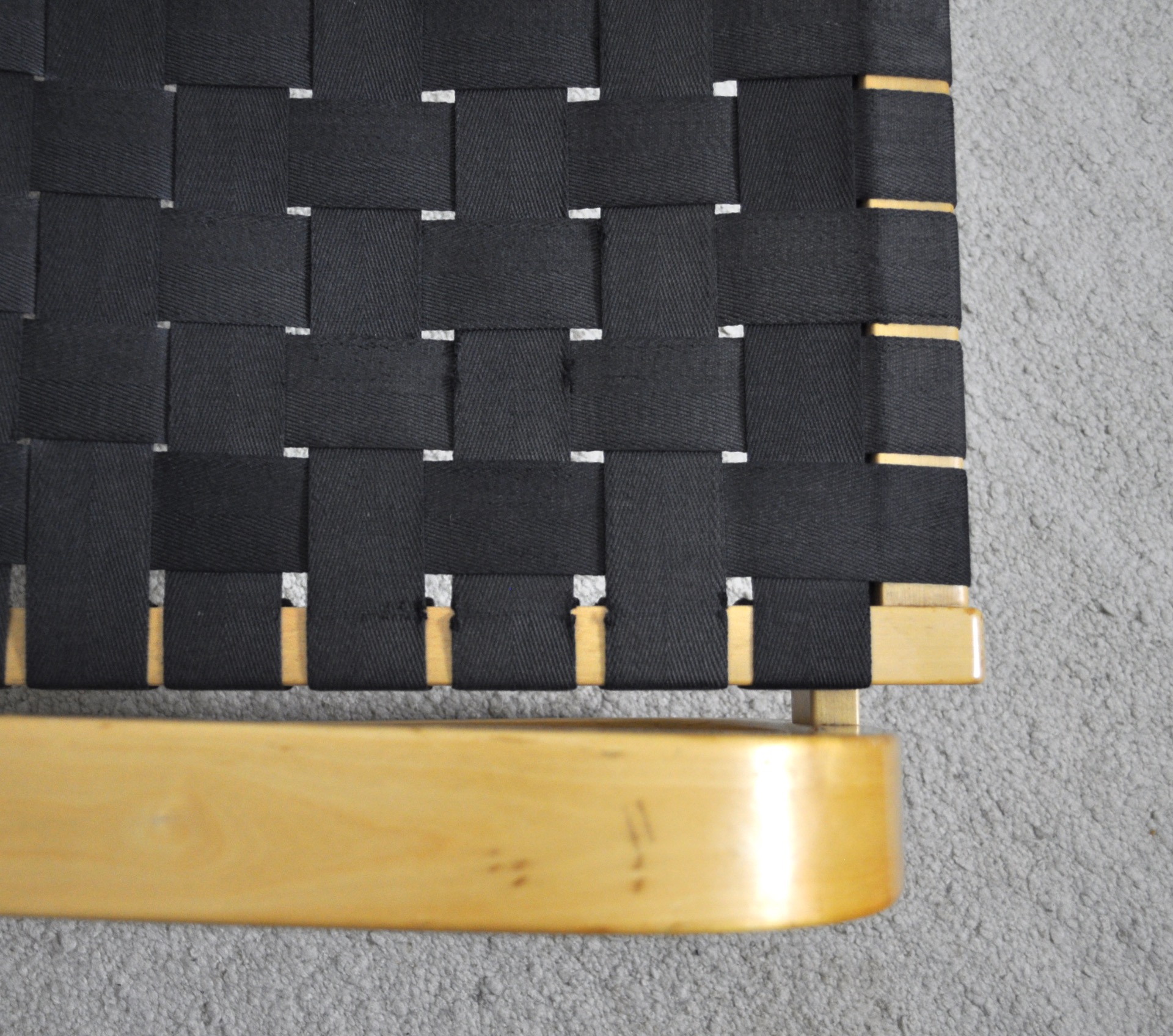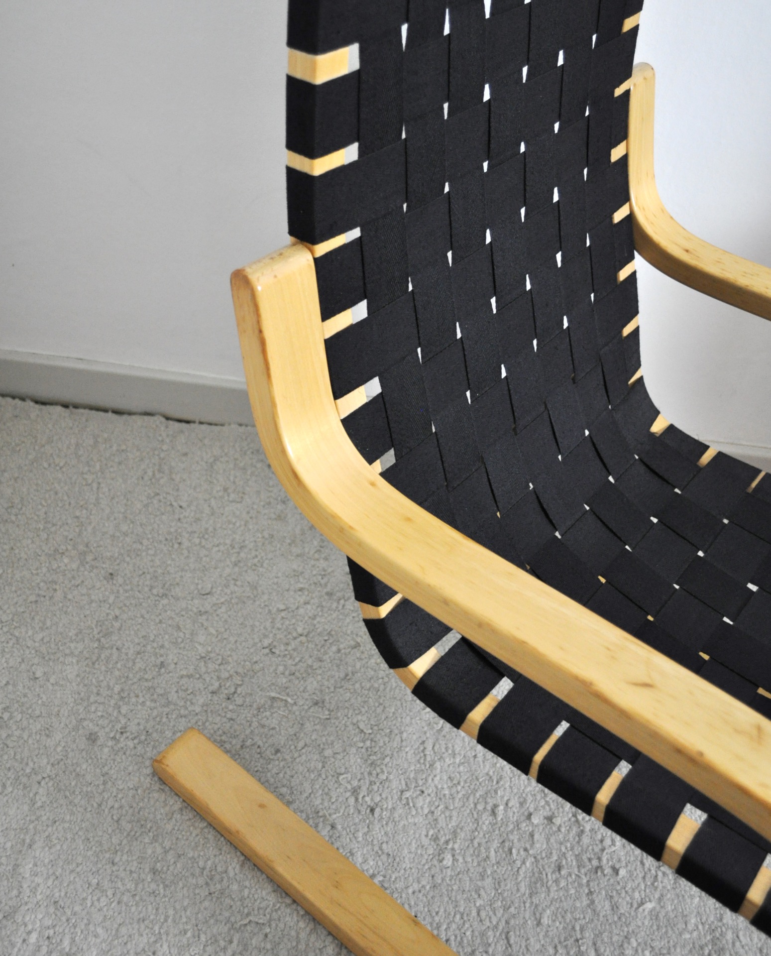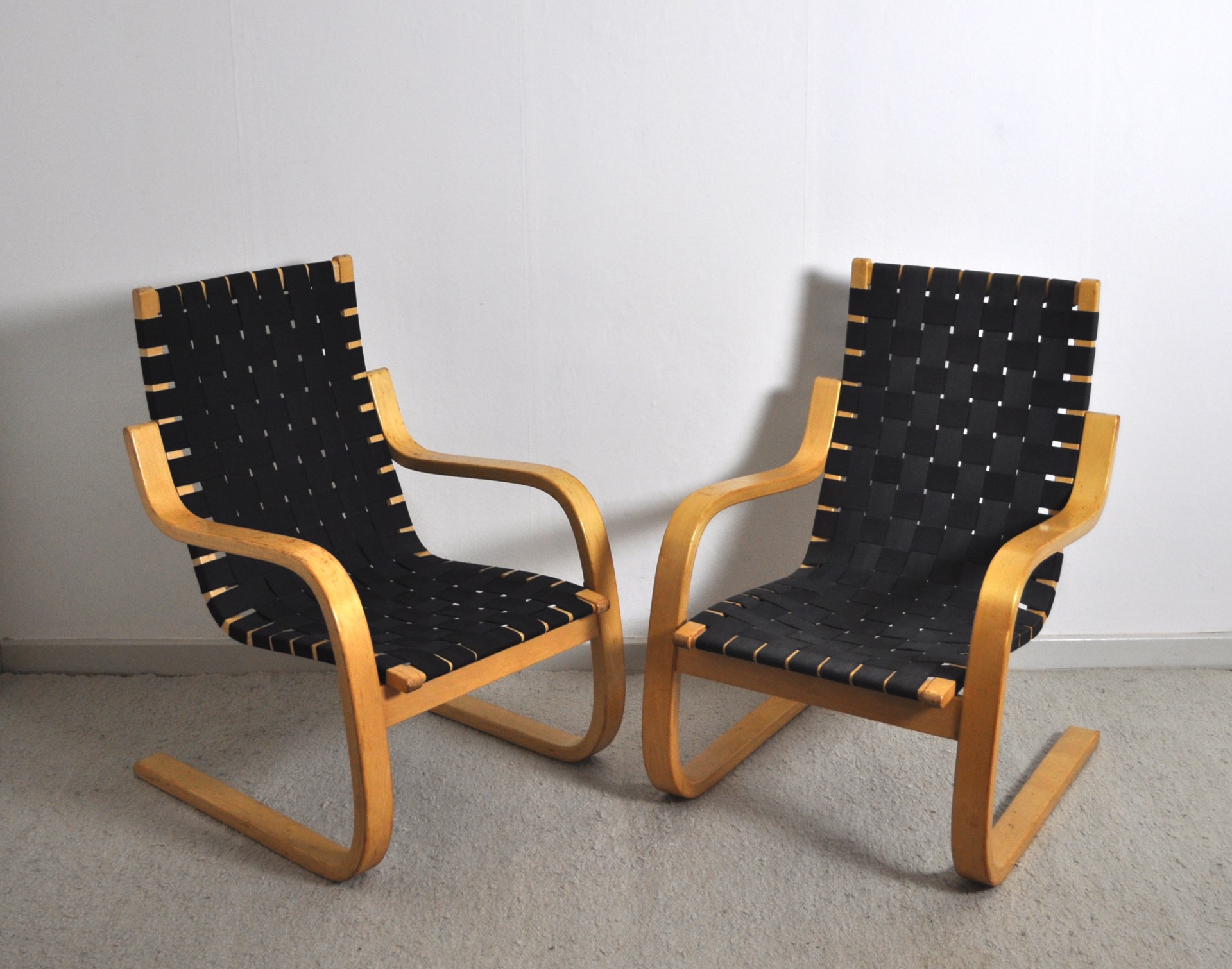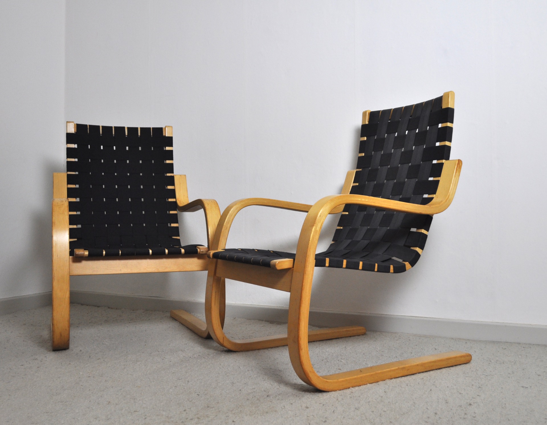 Cantilevered lounge chairs model 406 designed by Alvar Aalto for Artek. Bent laminated birch wood frames with woven canvas strapped seating.
