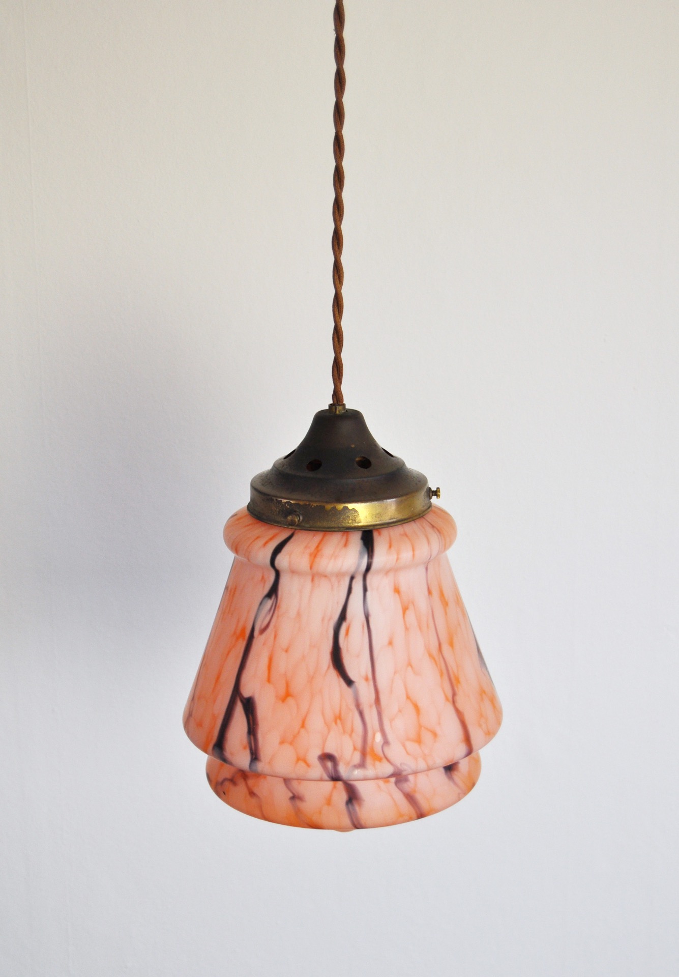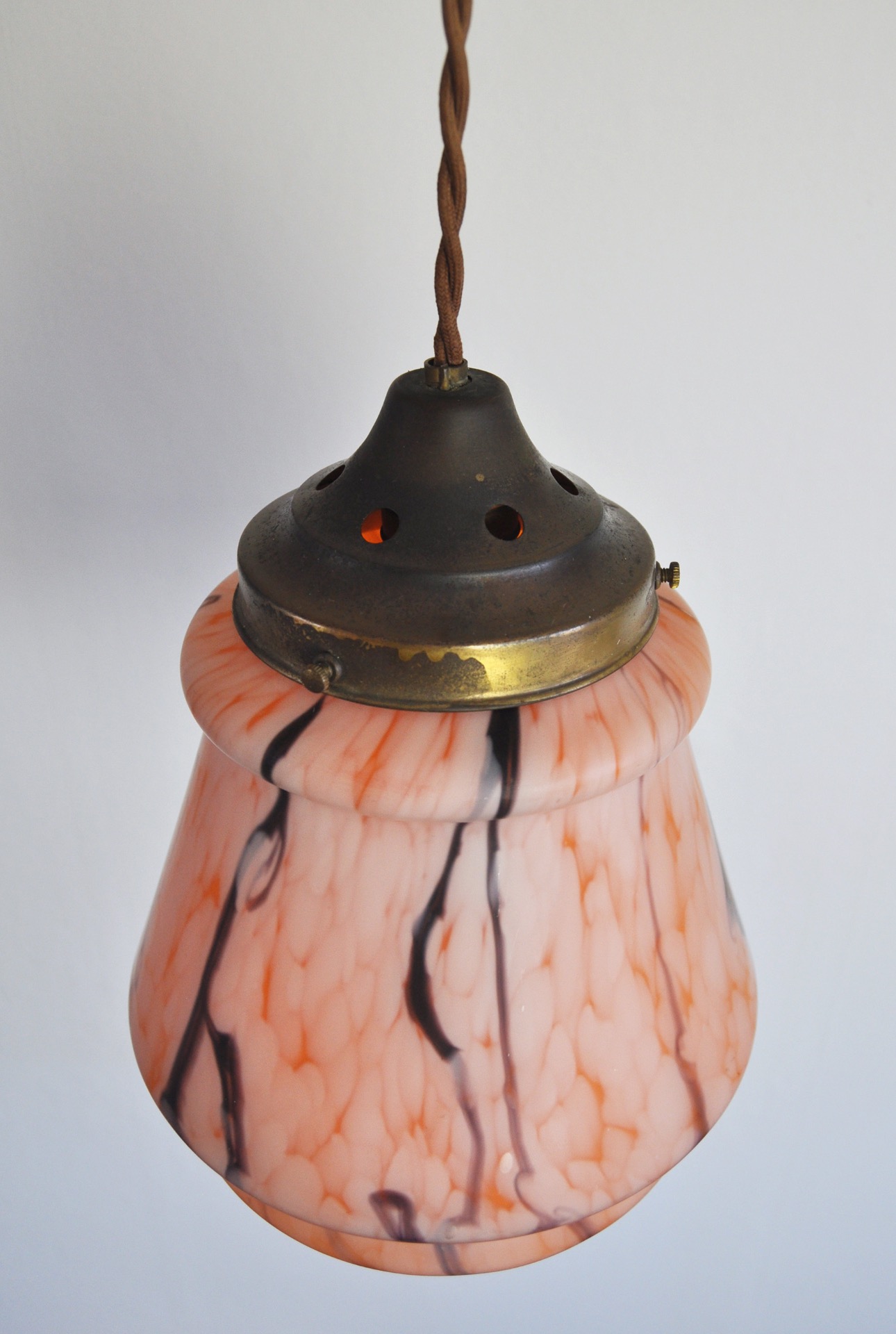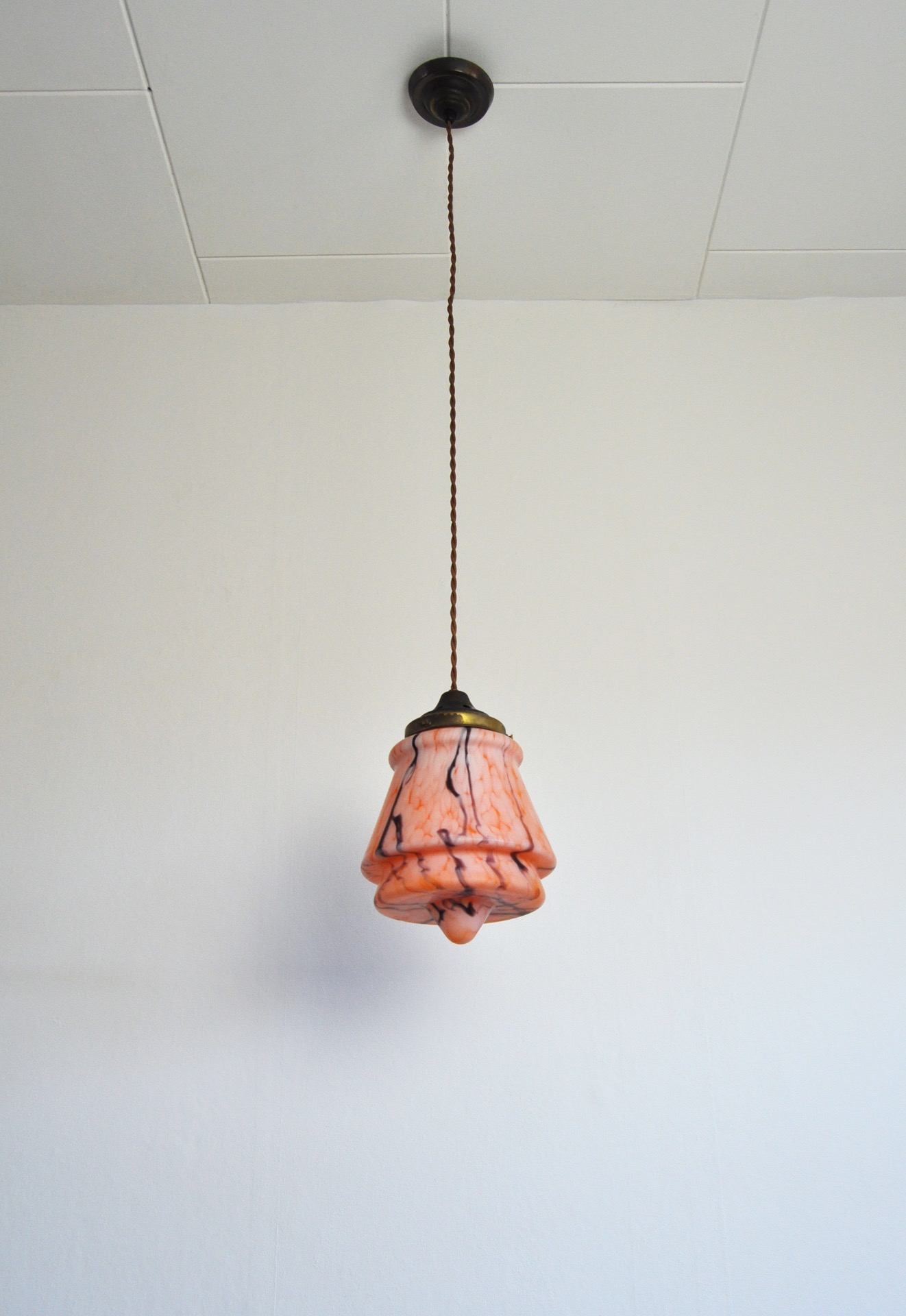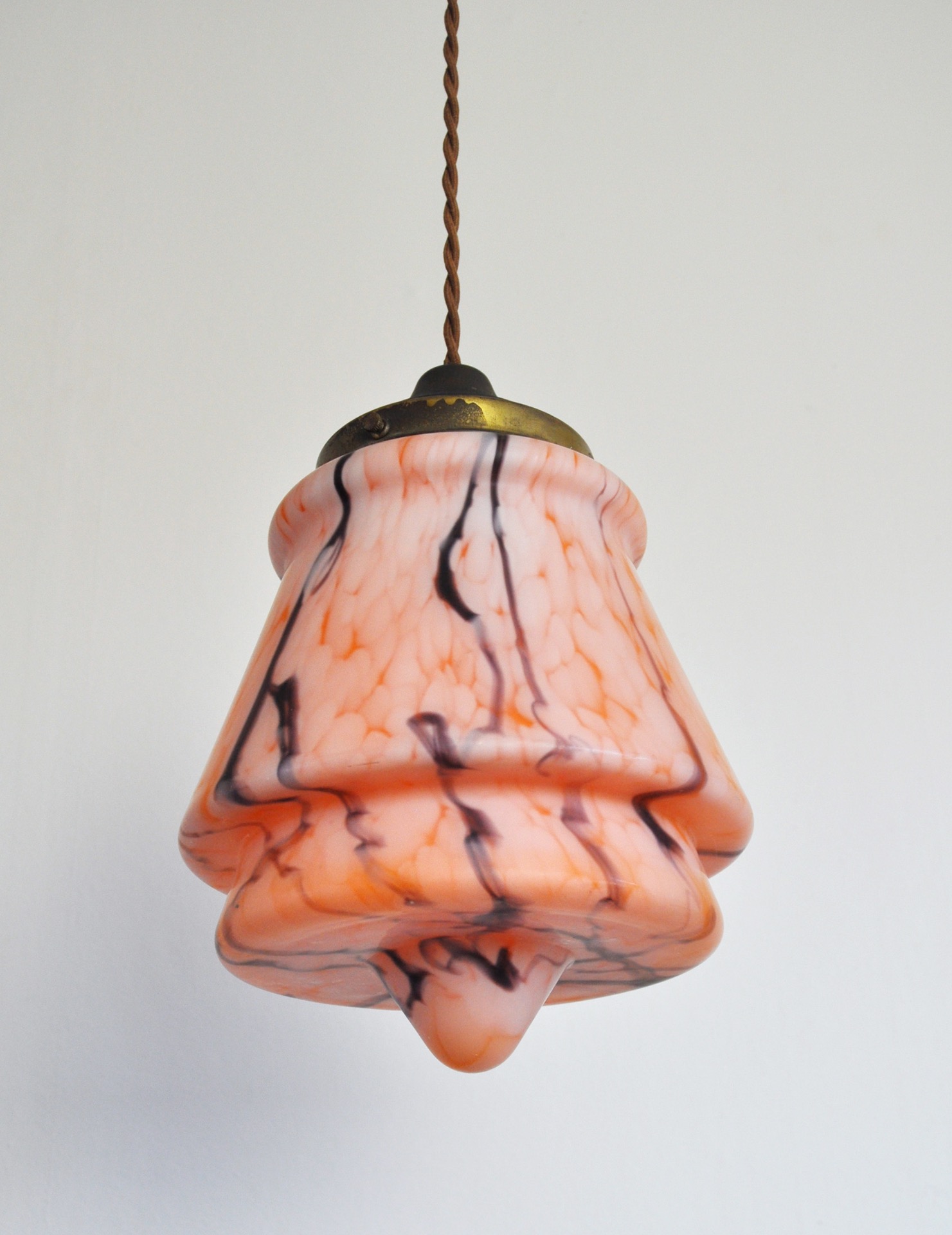 ART DECO ROSE MARBLED OPALINE & BRAS PENDANT, 1930s