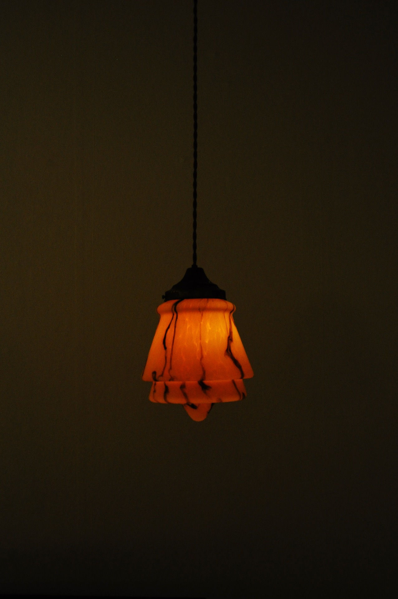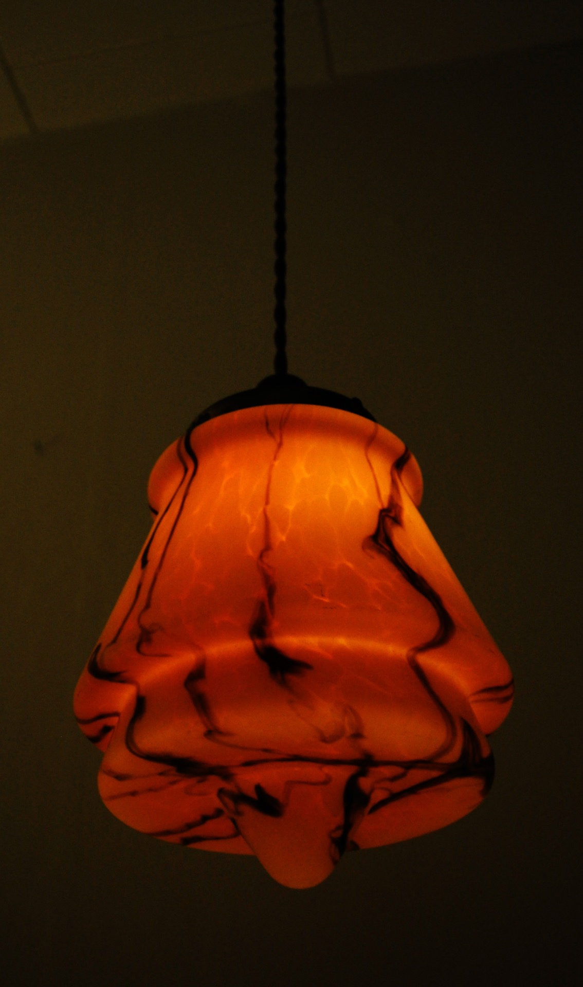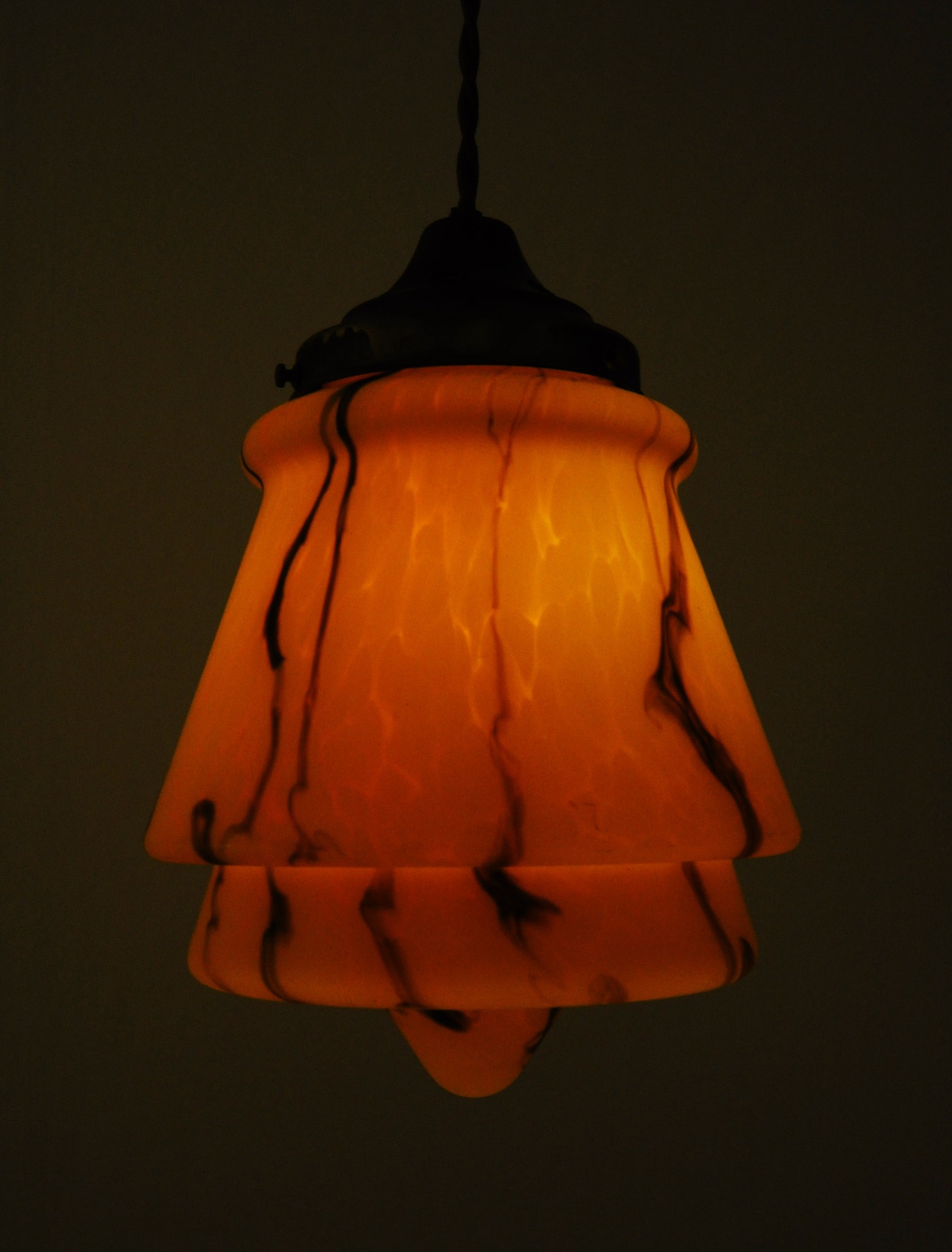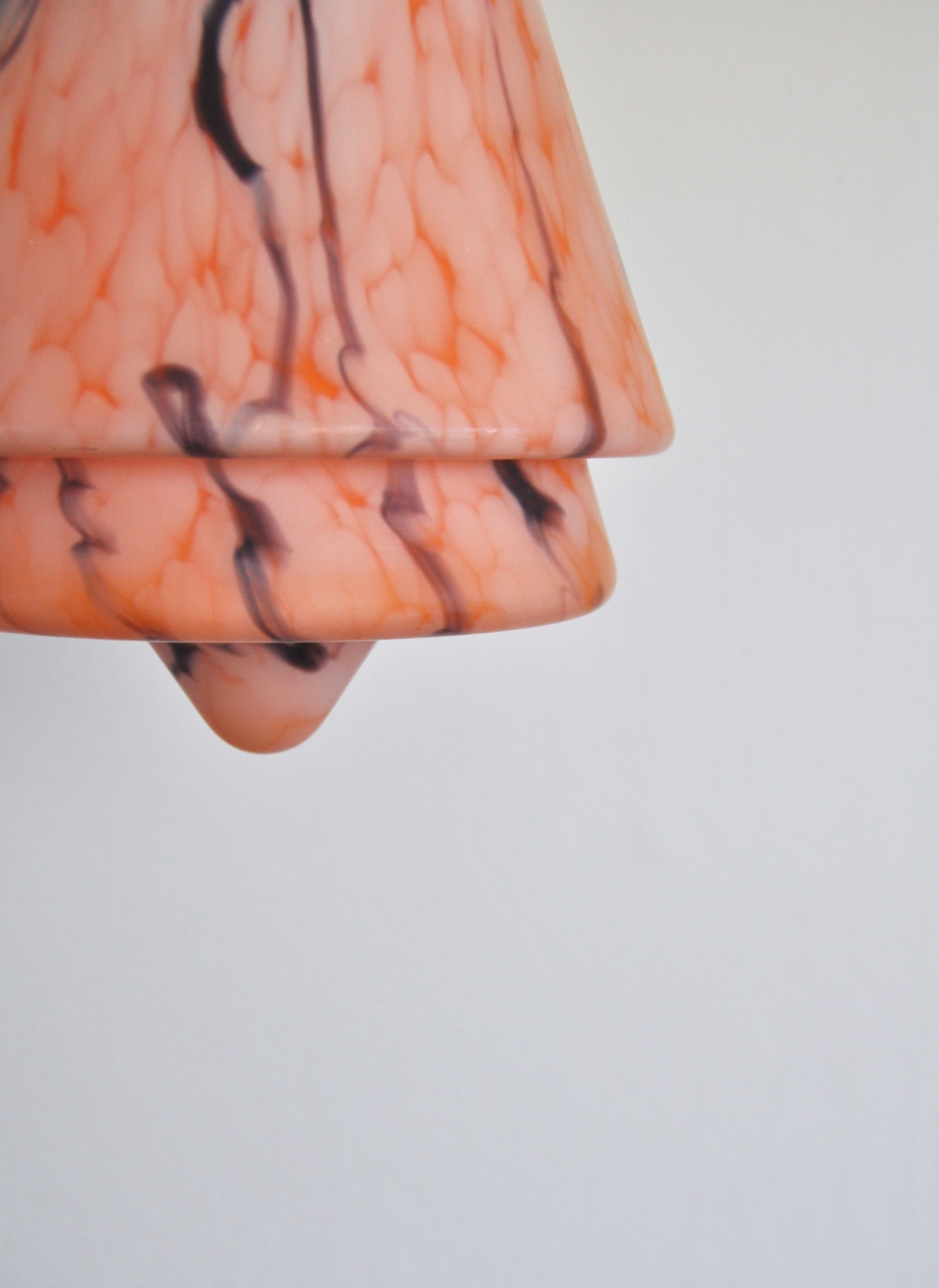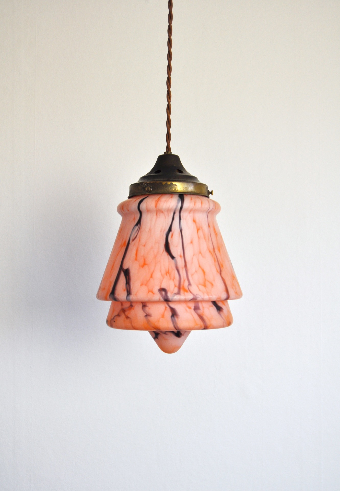 ART DECO ROSE MARBLED OPALINE & BRAS PENDANT, 1930s