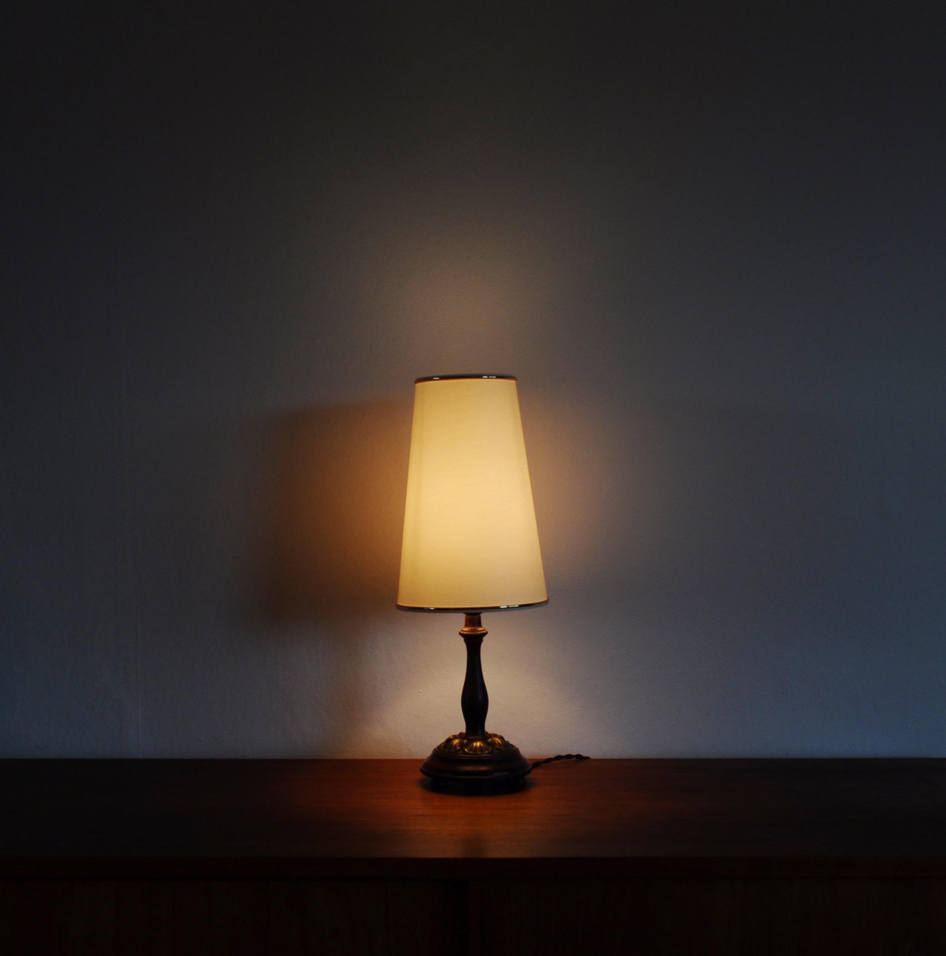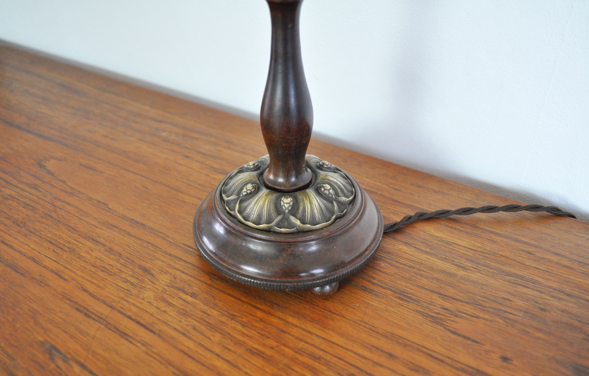 Art Nouveau table lamp in wood and brass. Early 20th century, probably Danish.