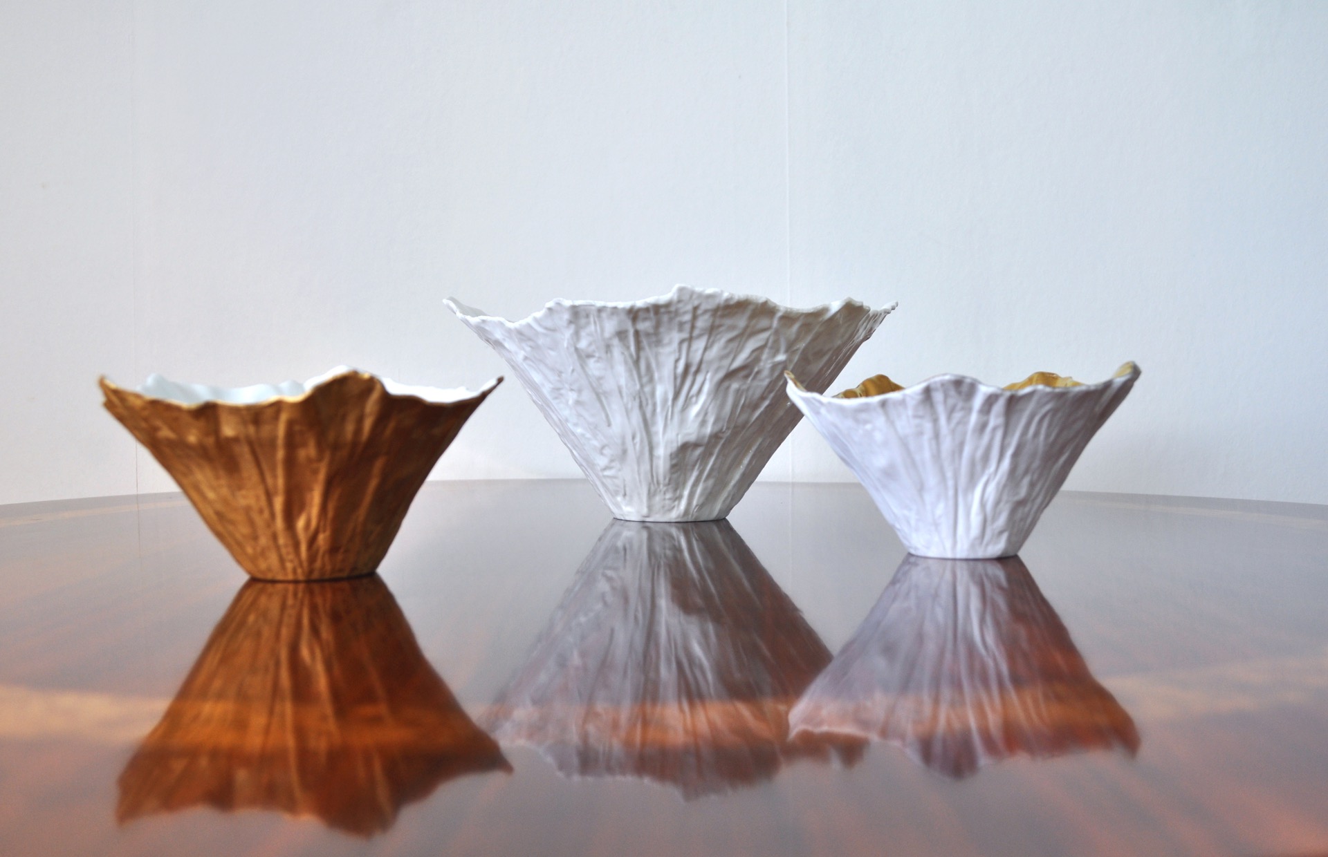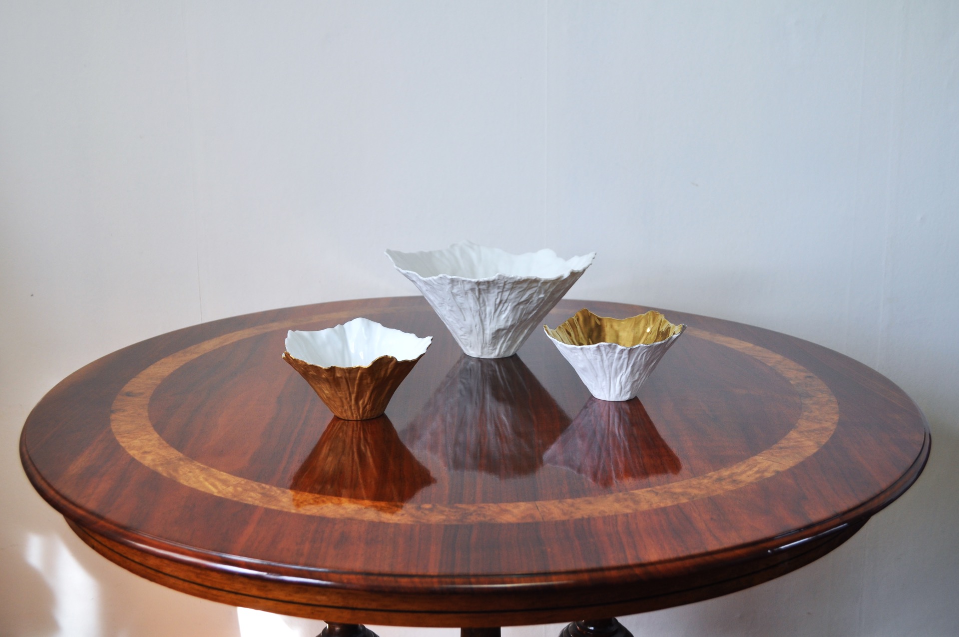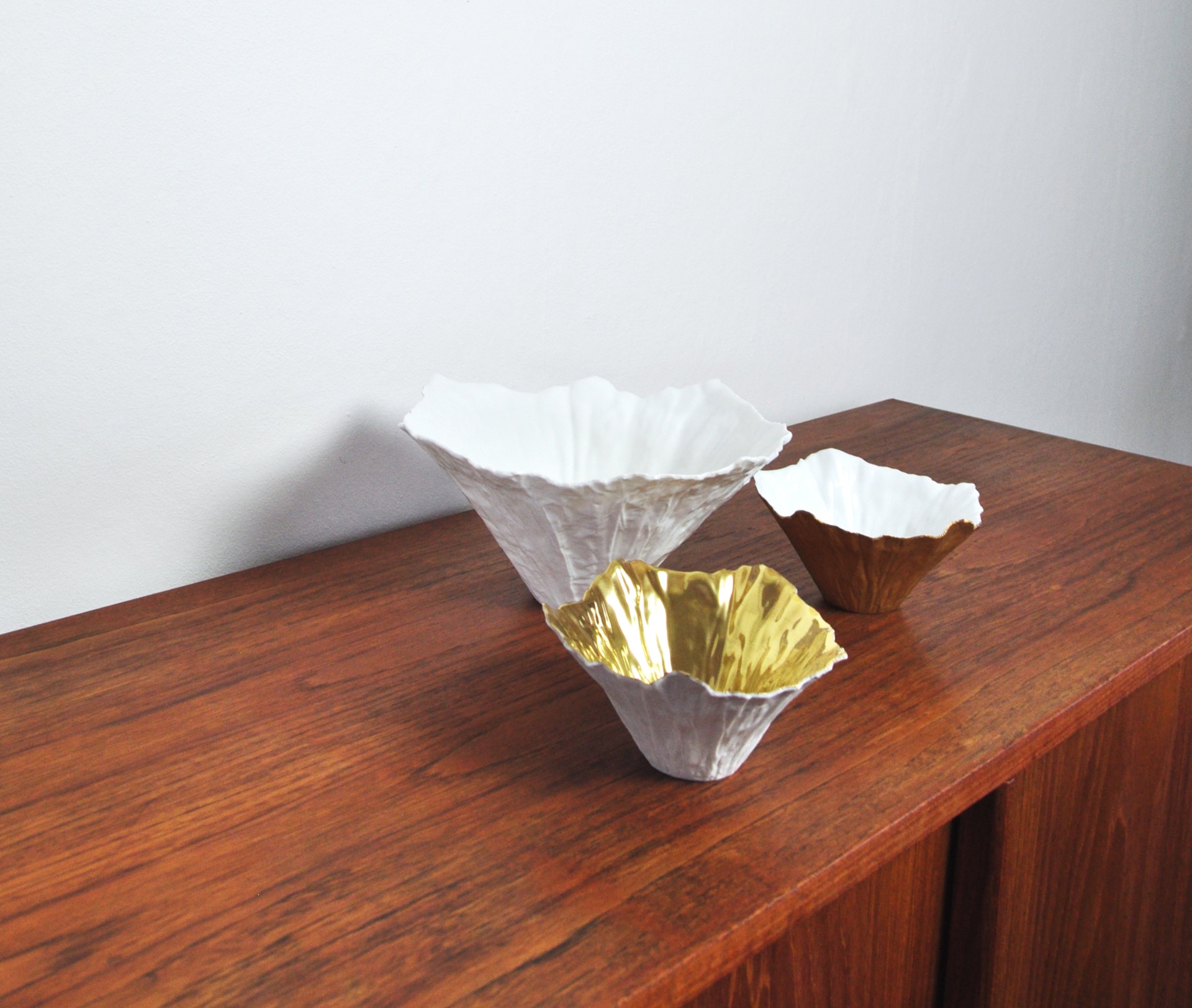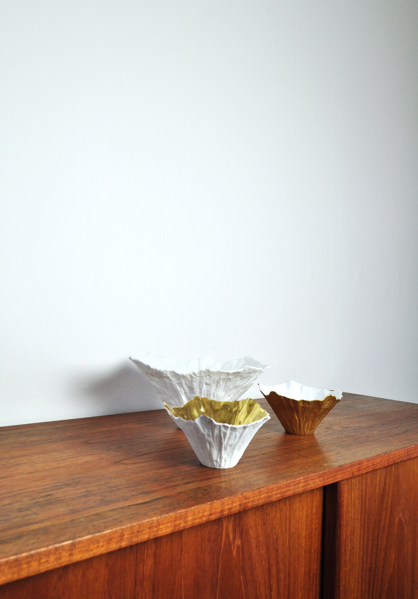 BOWLS OF WHITE PORCELAIN, PARTIALLY GILDED BY VIOLISE LUNN FOR ROYAL COPENHAGEN