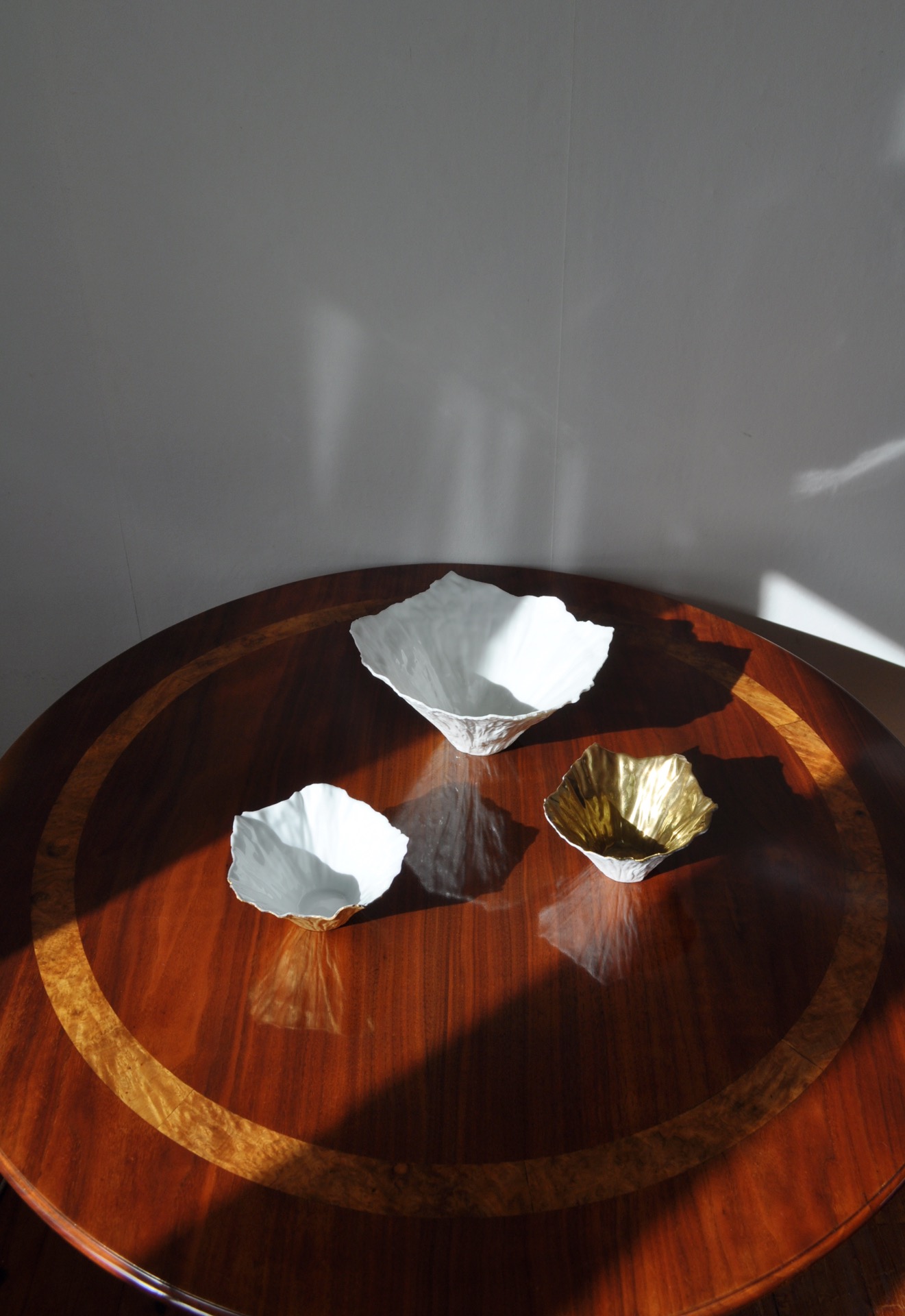 Set of 3 bowls of white porcelain, partially gilded. Designed by Violise Lunn for Royal Copenhagen 2006.