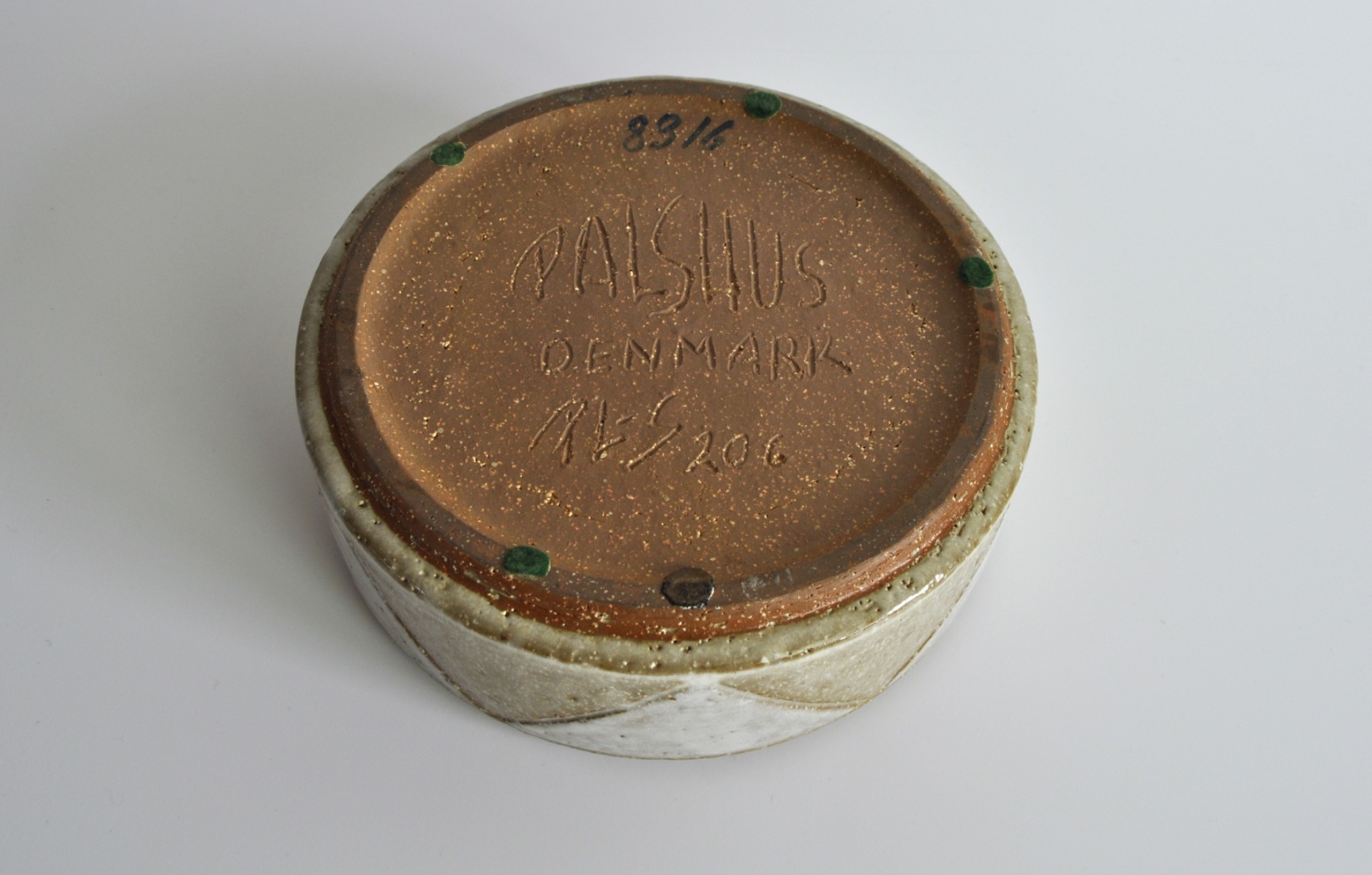 Palshus was founded by Per and his wife Annelise Linnemann-Schmidt. The couple created and produced chamotte tableware, vases, and lamps, often with impressed decorations. Colors were characteristic Scandinavian earthy tones: blues, browns, greens and beige.