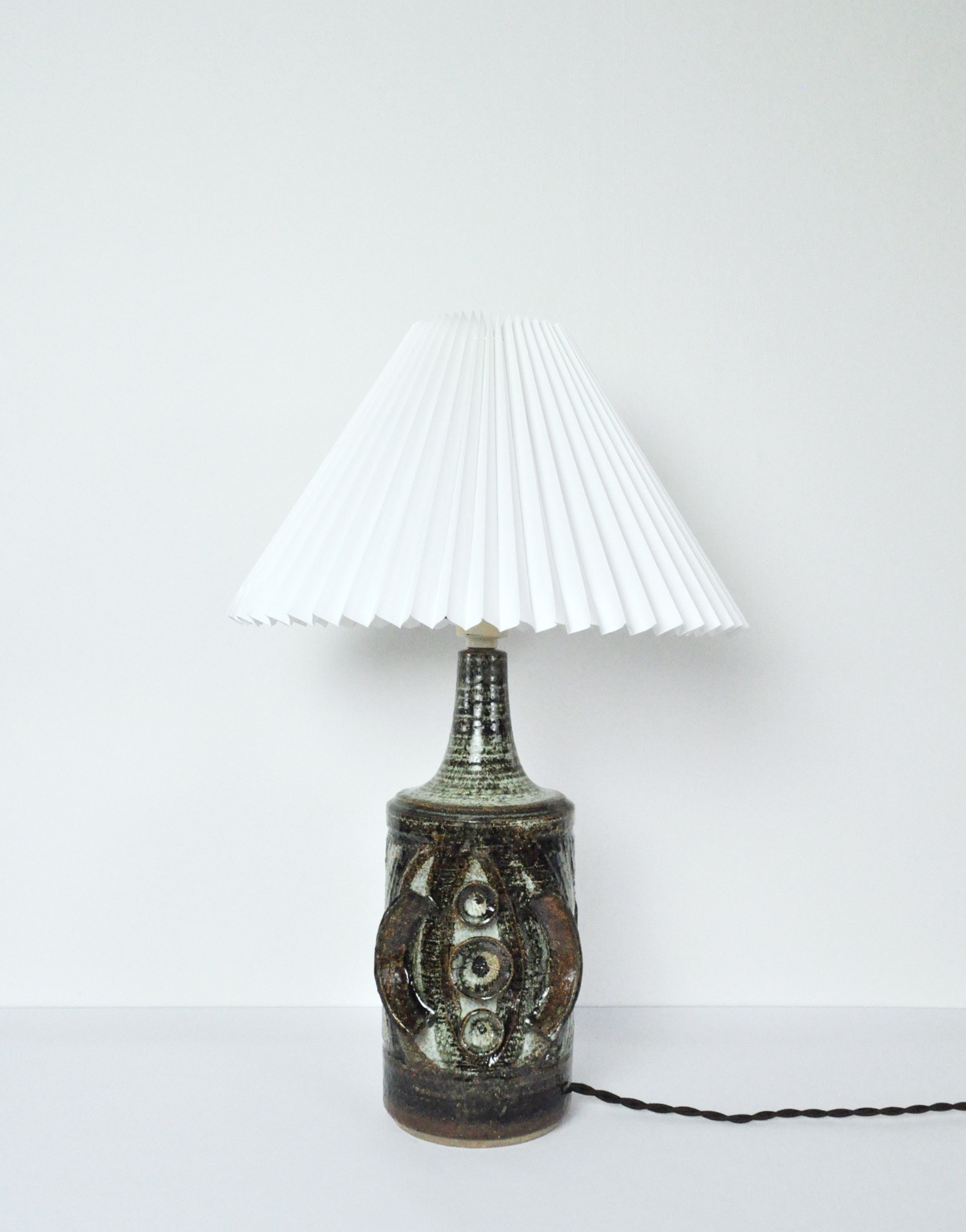 Ceramic Table lamp with a sculpturel abstract expression. Glaze in various tones of grey, turquis, green, brown and black. Designed by Arne Finne Nielsen in 1960s-70s for Søholm, Denmark. Signed by designer and maker. Very fine condition.