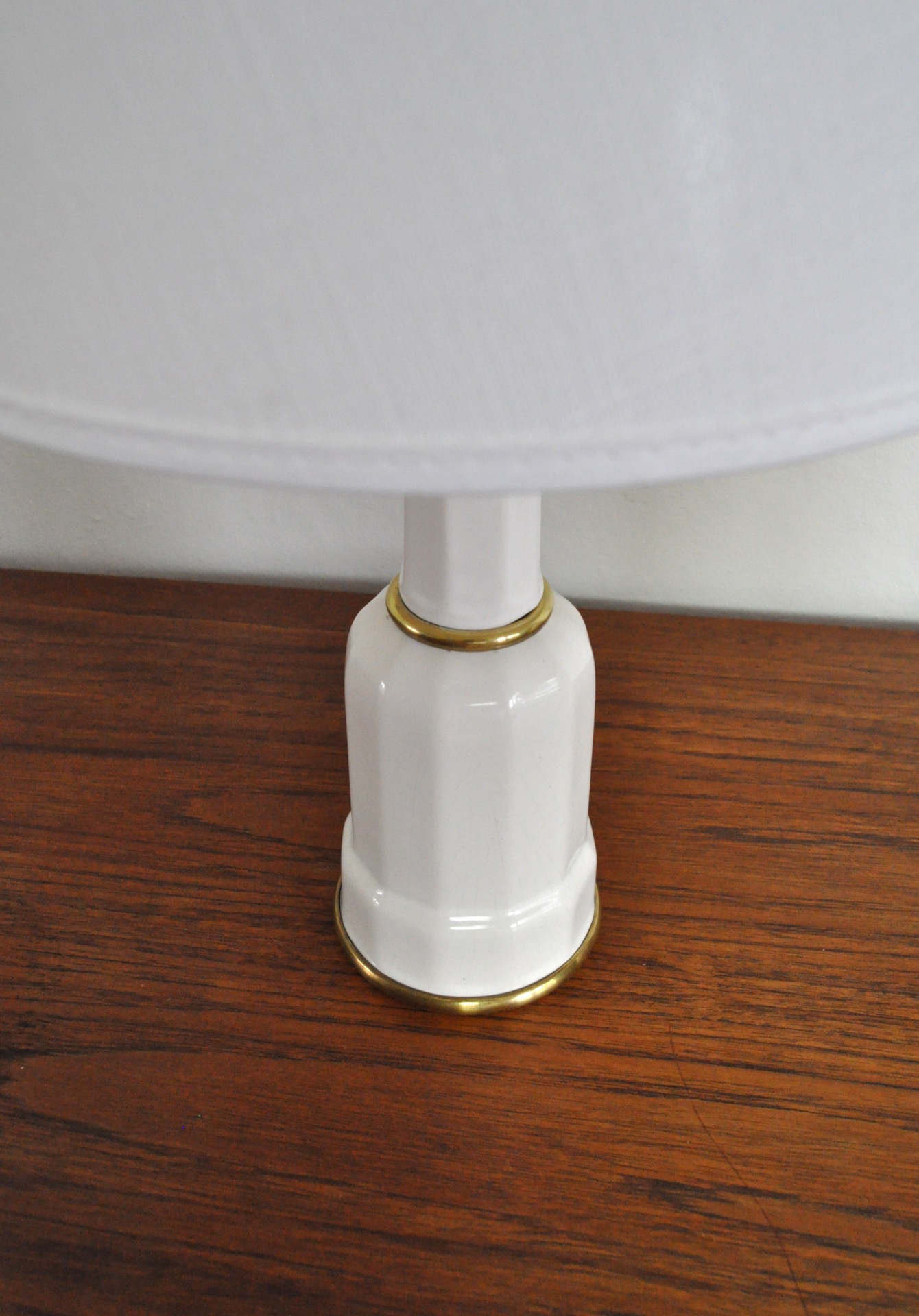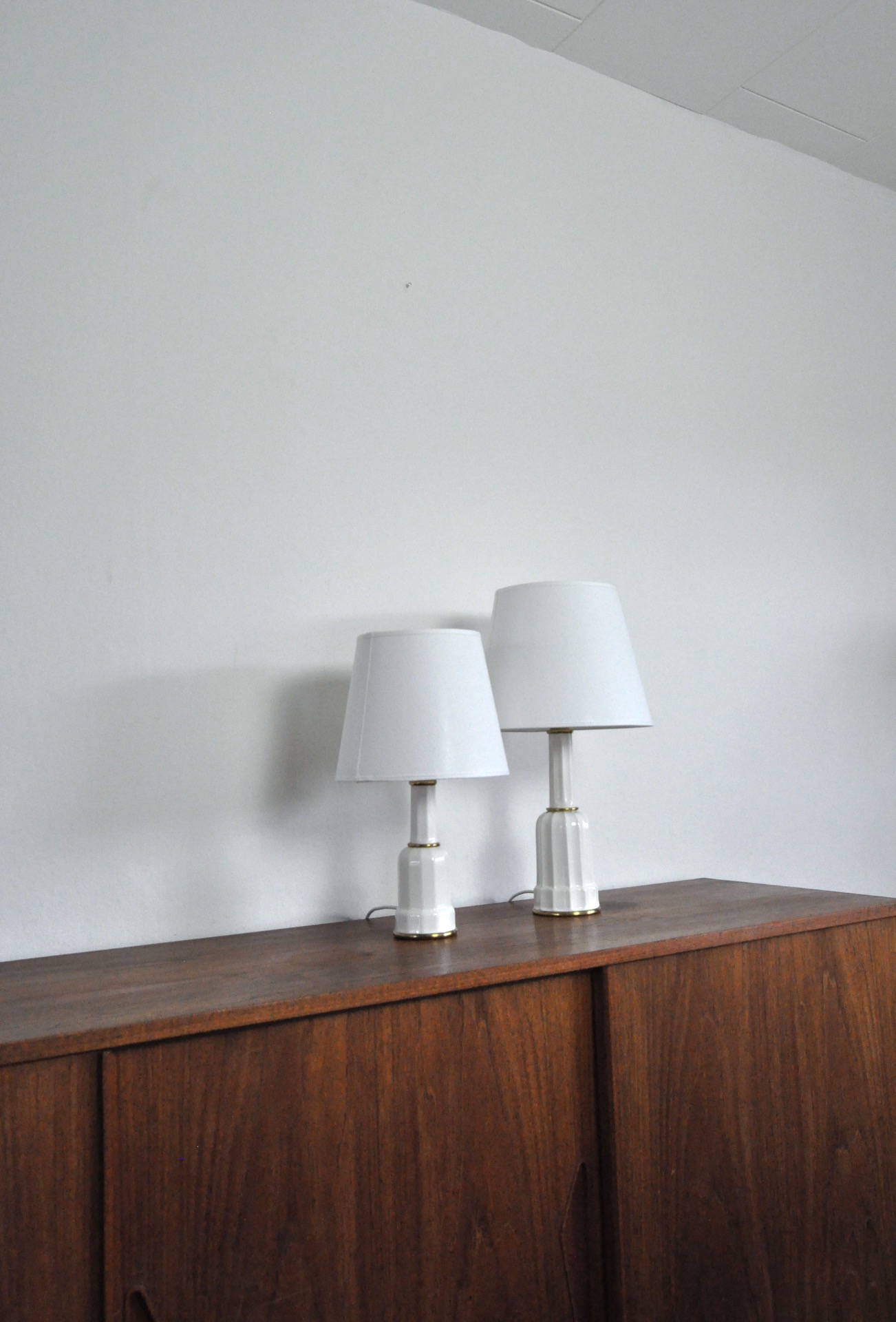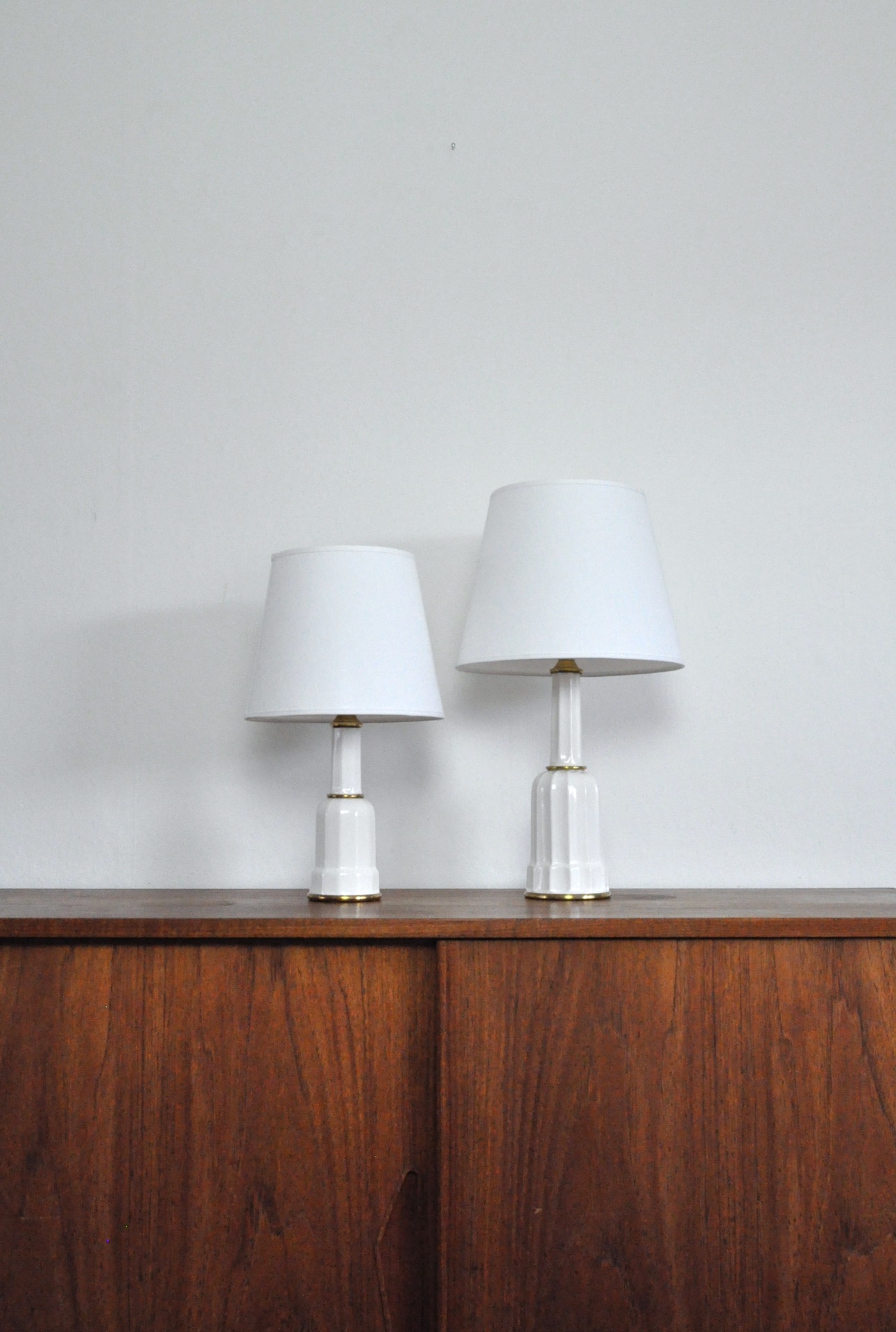 Set of two Heiberg table lamps made in porcelain and brass by Søholm. A classic Danish design, clean lines and minimalist aesthetics.
