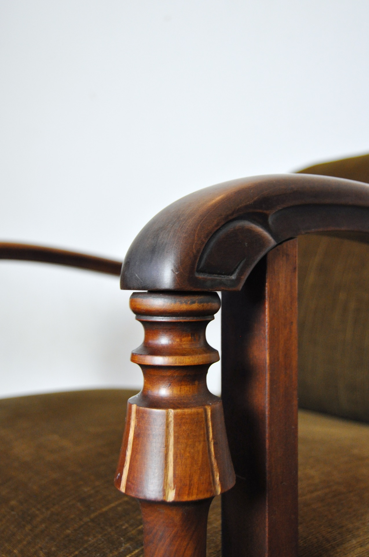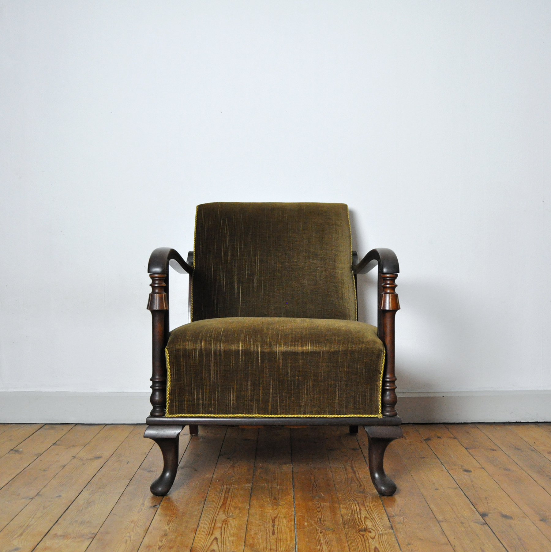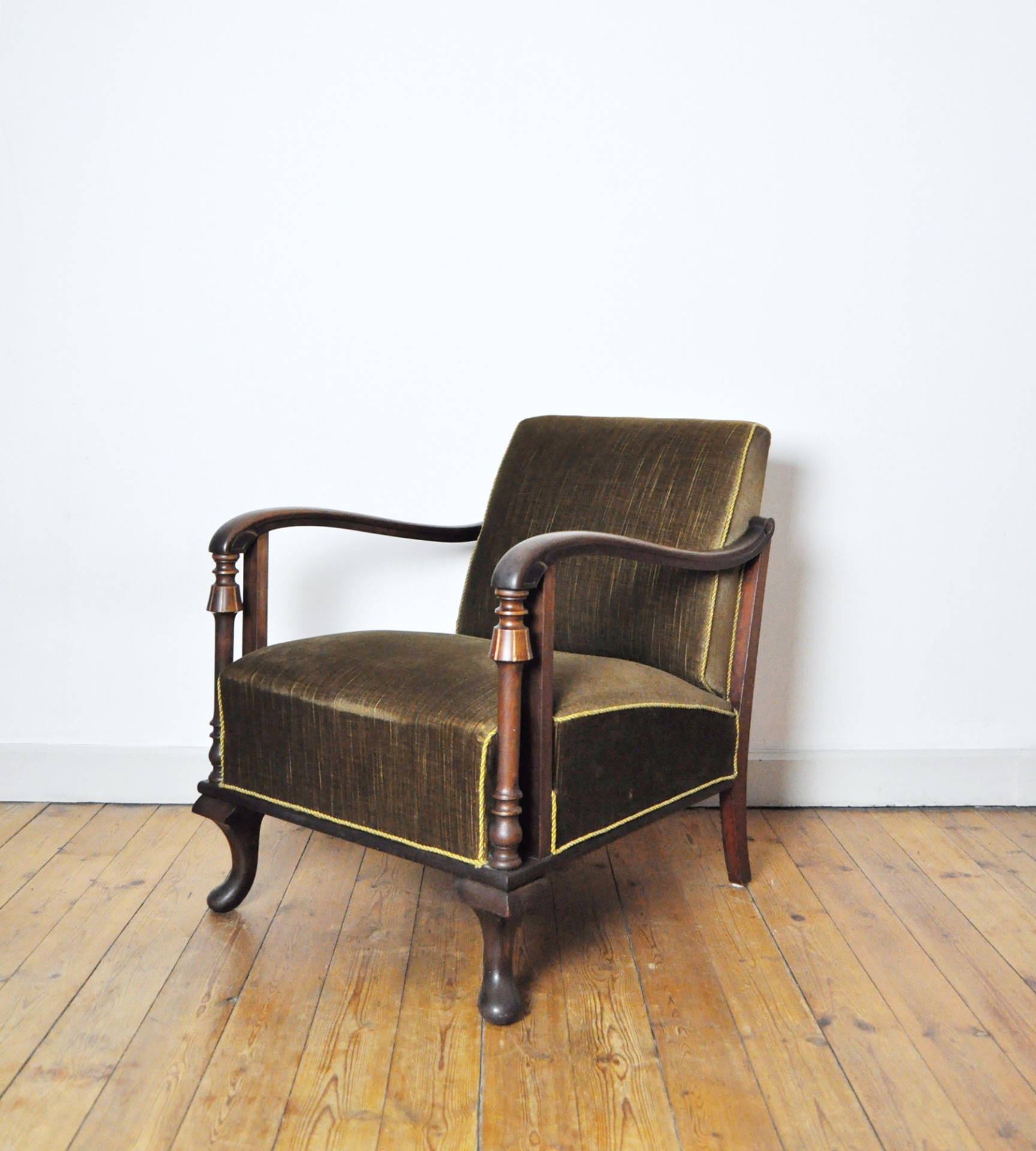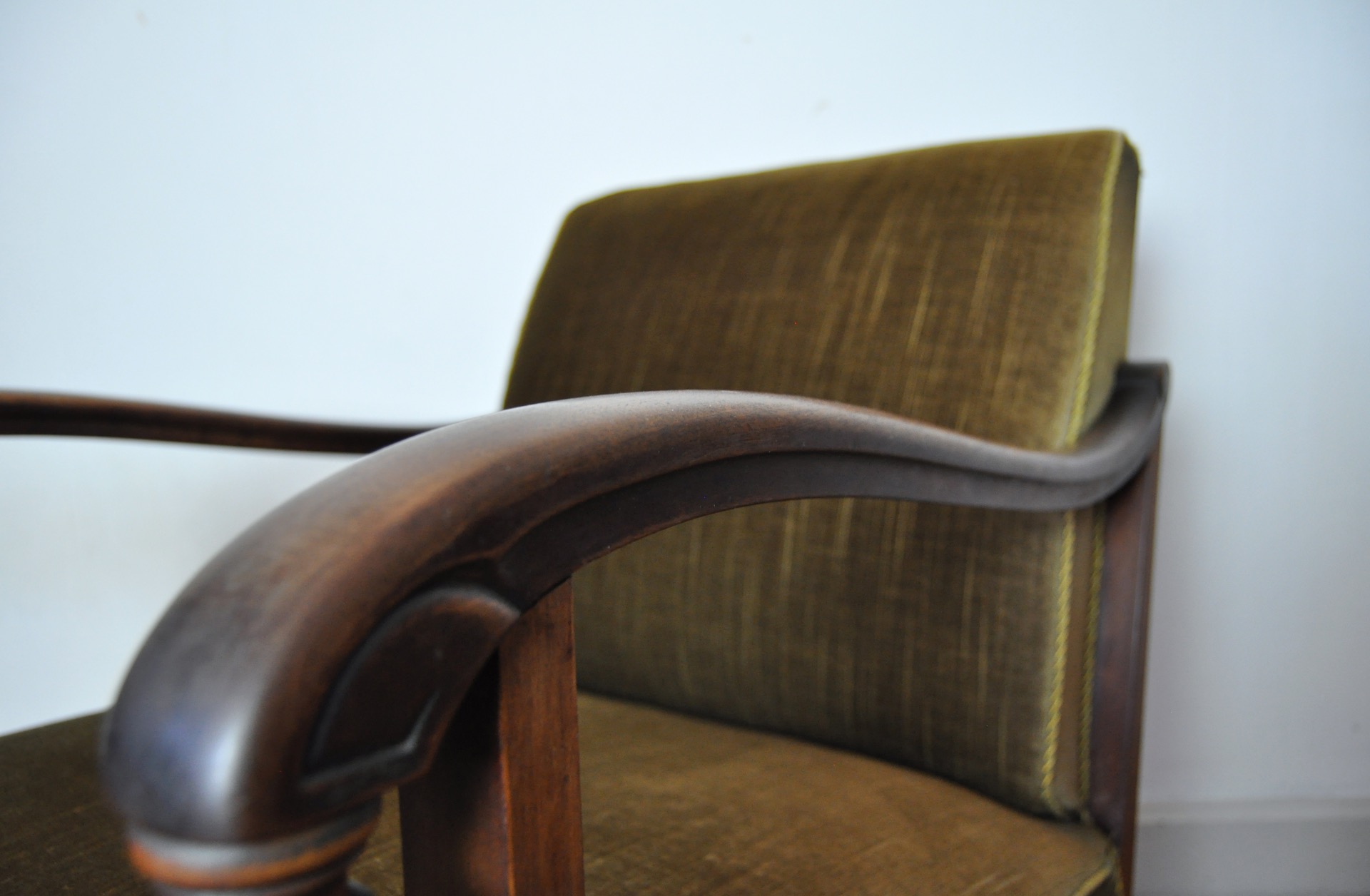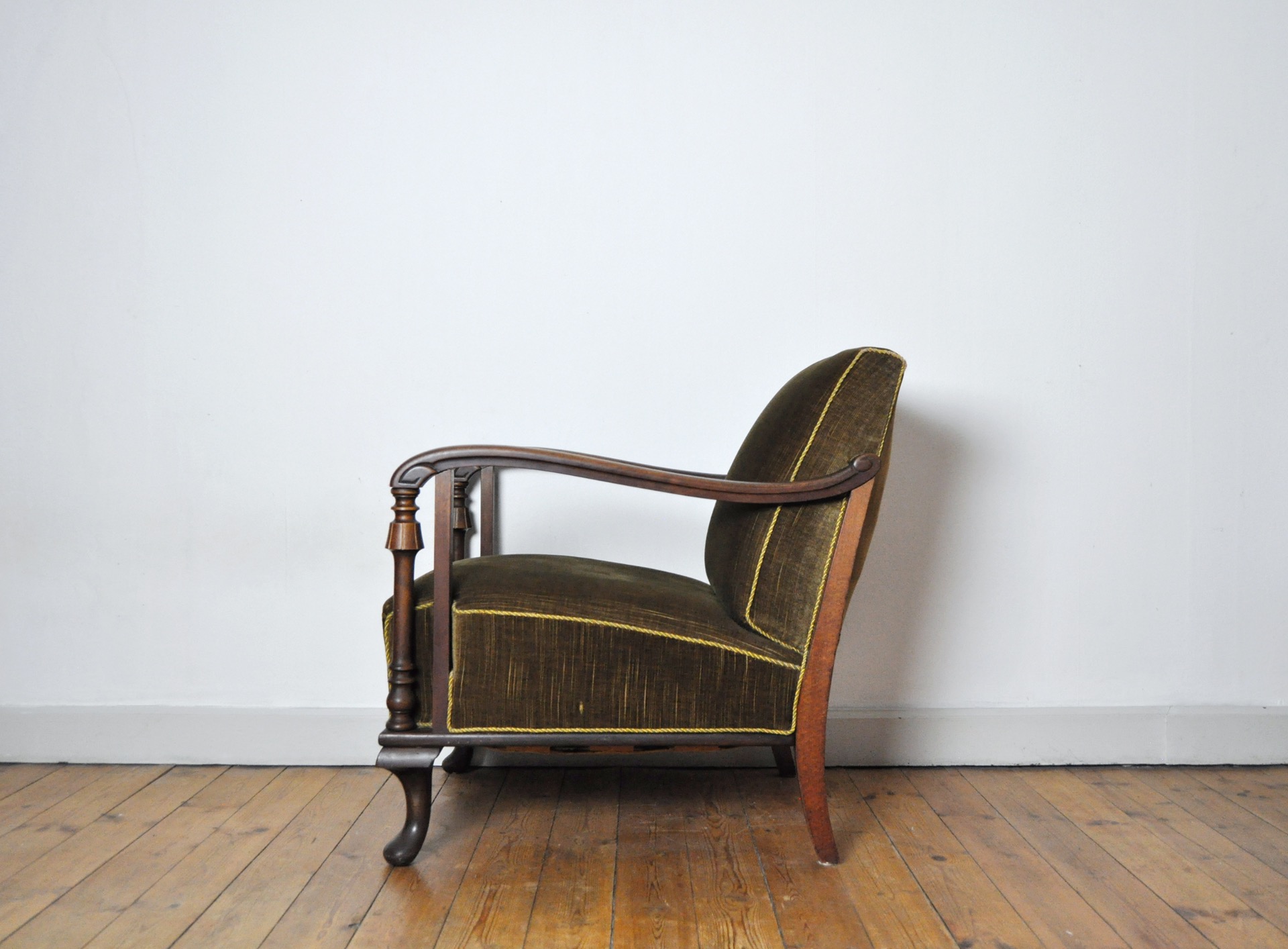 A beautiful patinated vintage Danish lounge chair. The chair features elegantly carved details visible on the wooden frames, reflecting Art Deco influences alongside echoes of 19th-century craftsmanship. The chair is upholstered in their original olive-green patinated fabric, which pairs beautifully with the warm-toned wood frame.