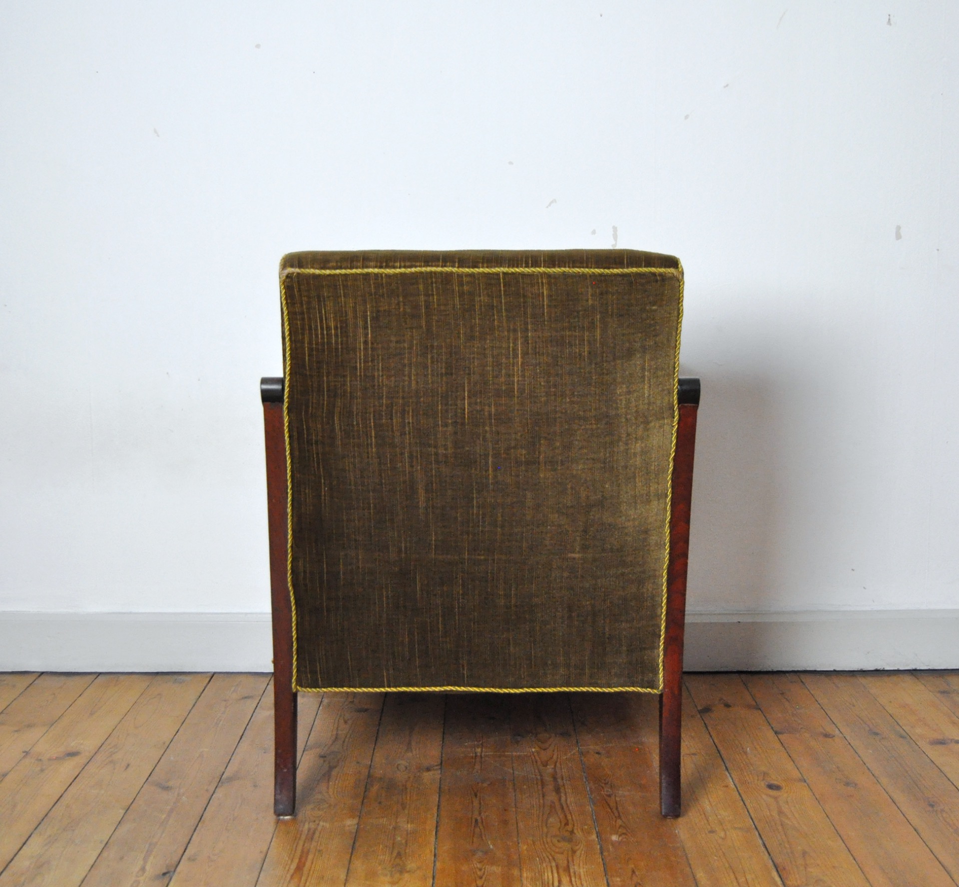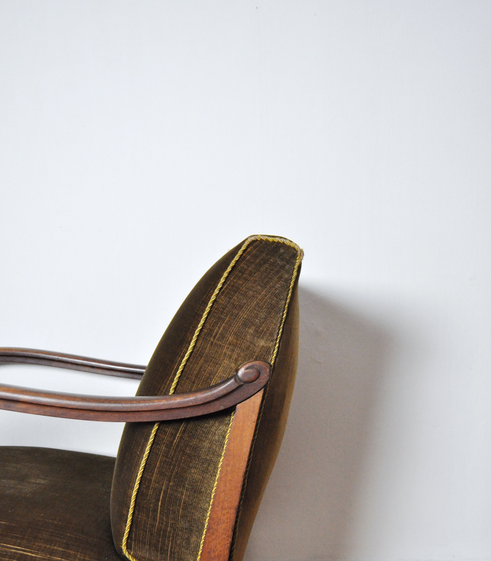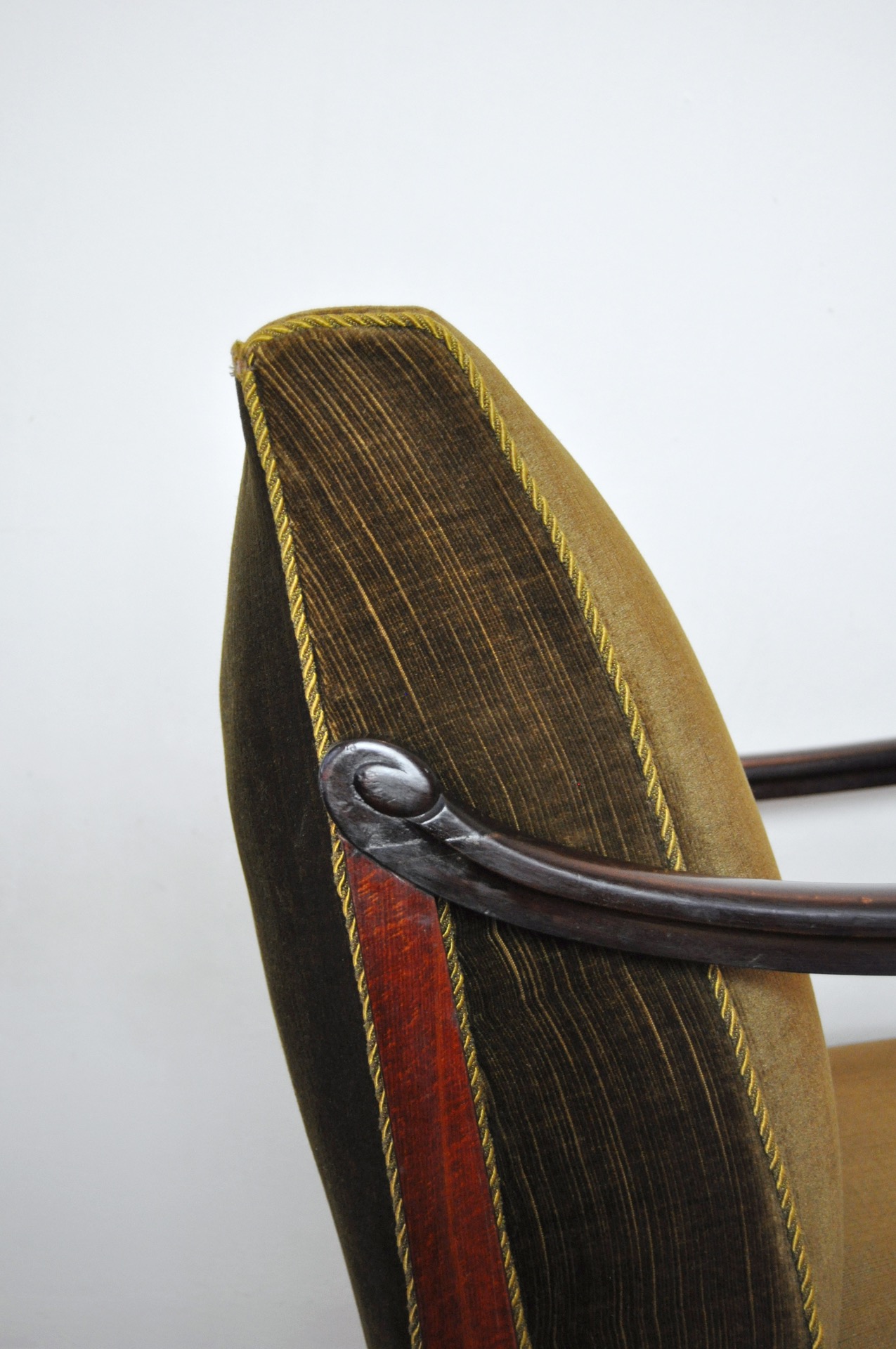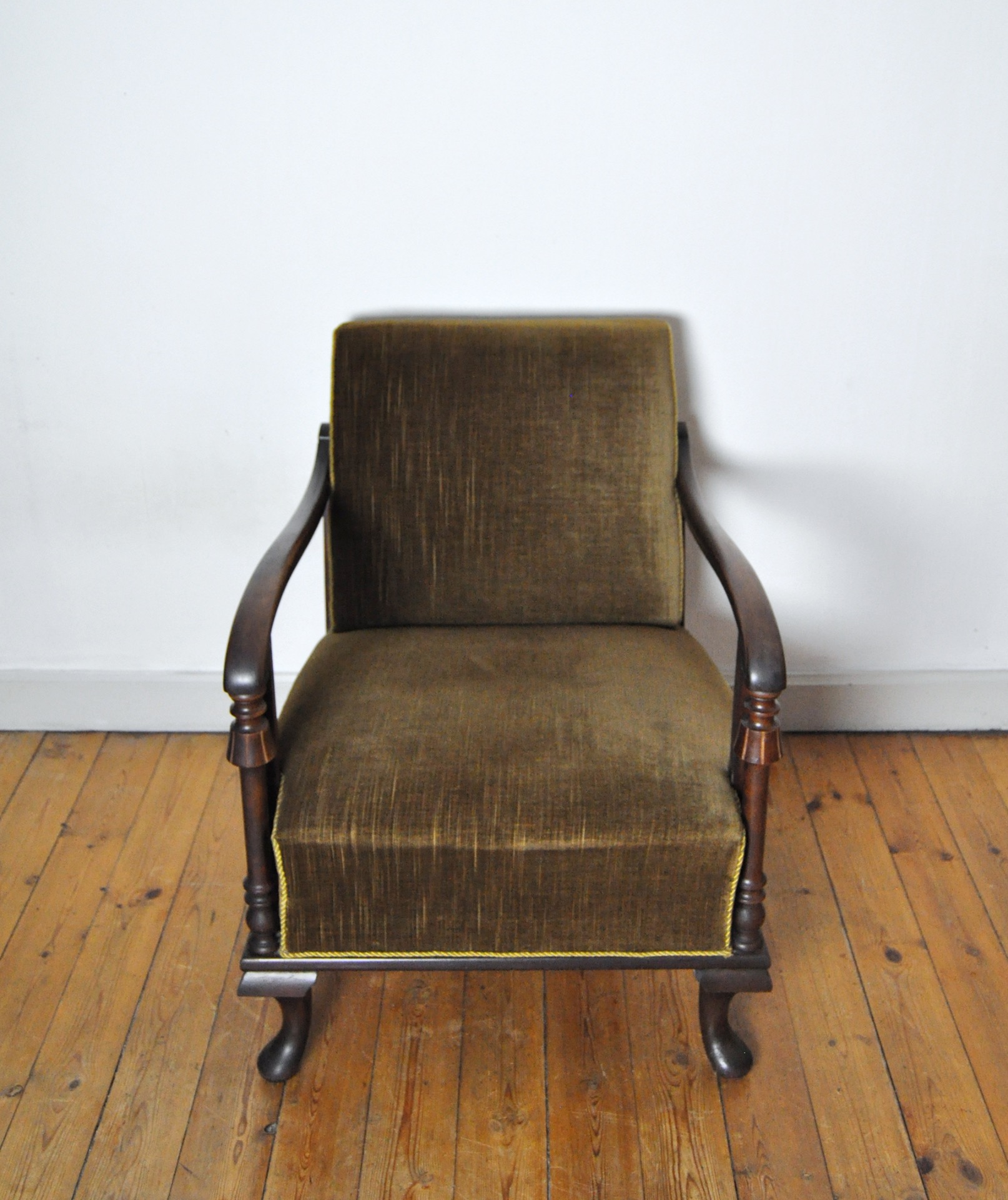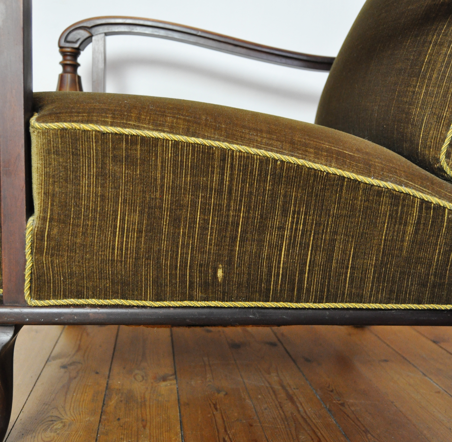 A beautiful patinated vintage Danish lounge chair. The chair features elegantly carved details visible on the wooden frames, reflecting Art Deco influences alongside echoes of 19th-century craftsmanship. The chair is upholstered in their original olive-green patinated fabric, which pairs beautifully with the warm-toned wood frame.