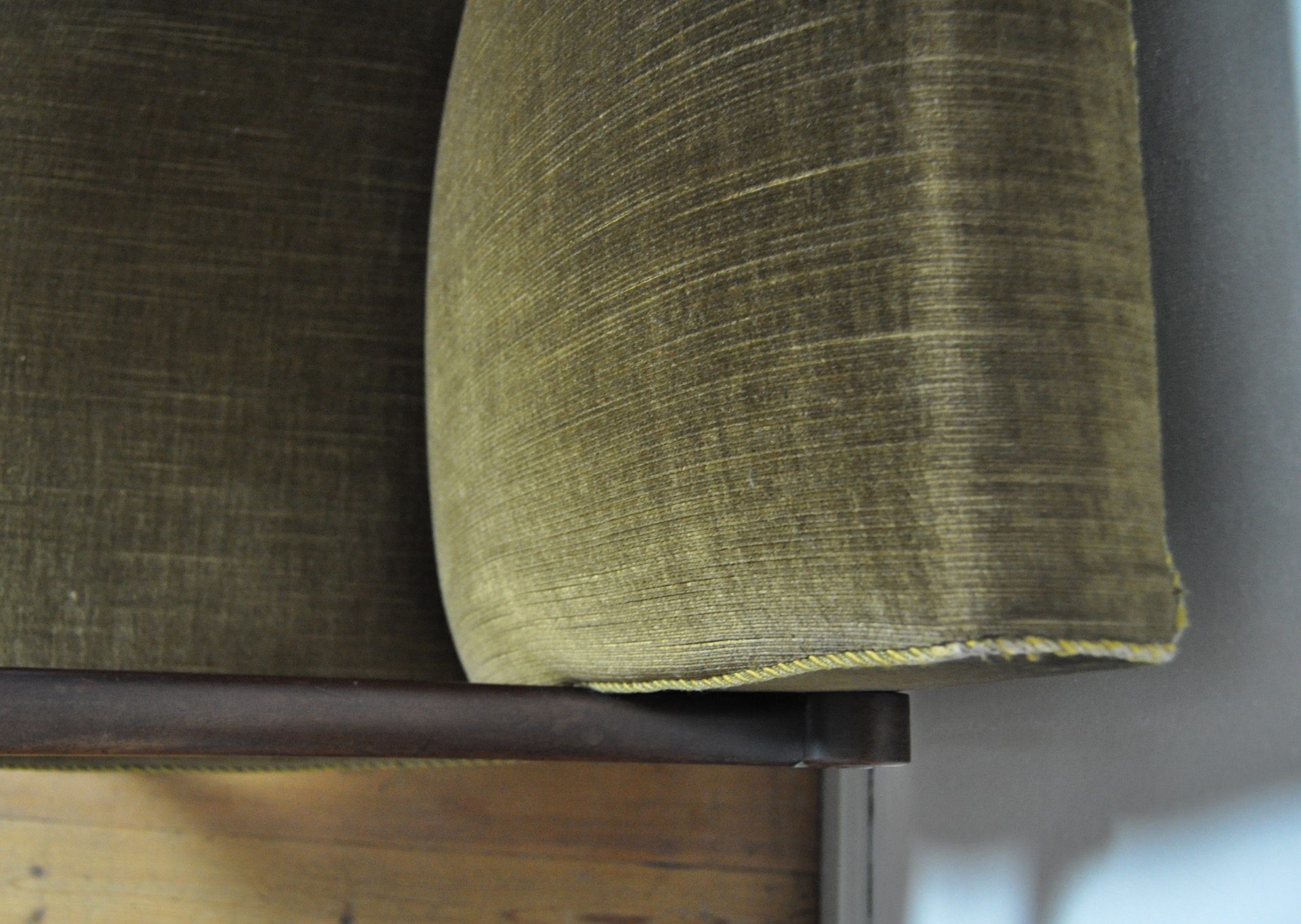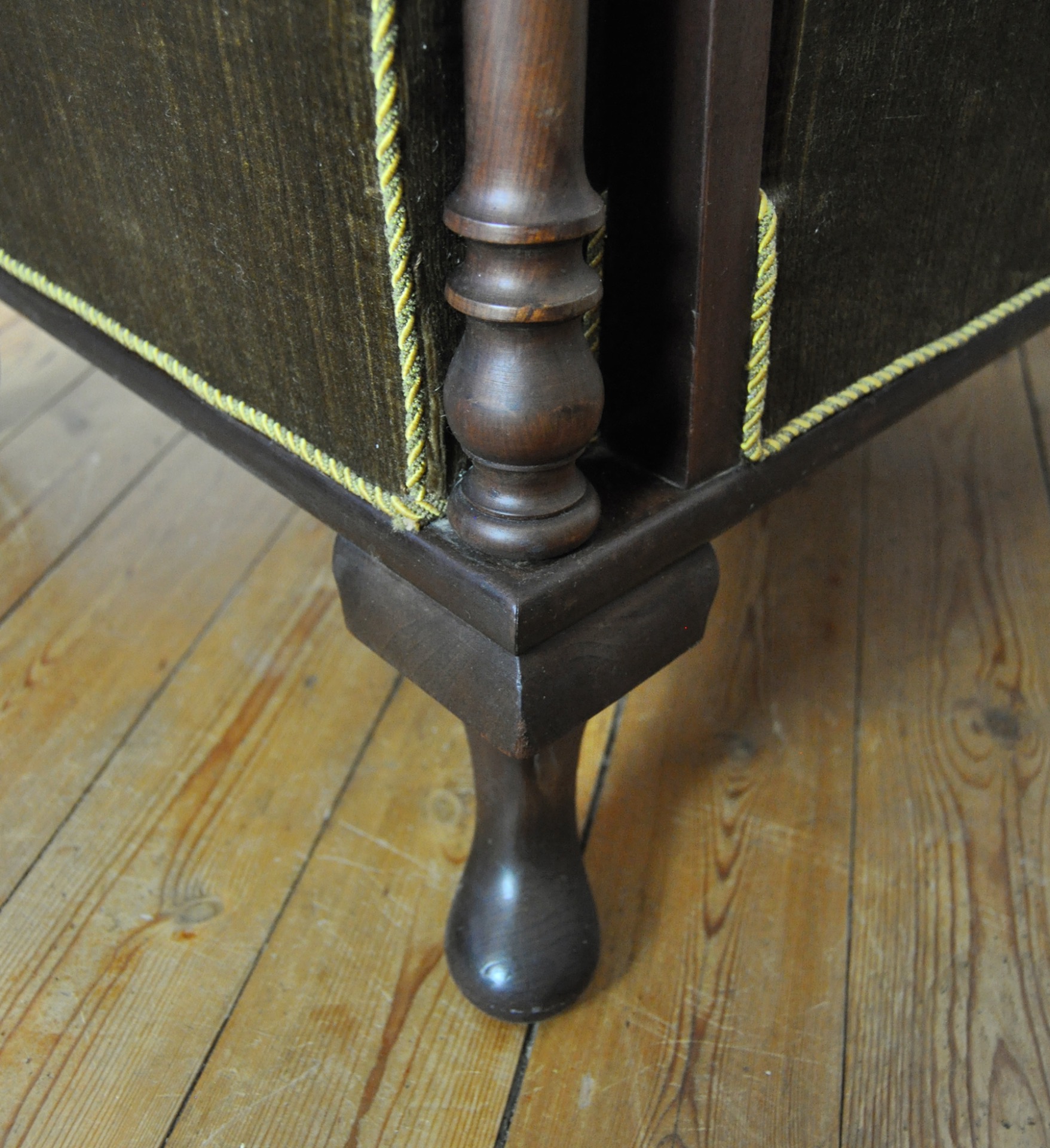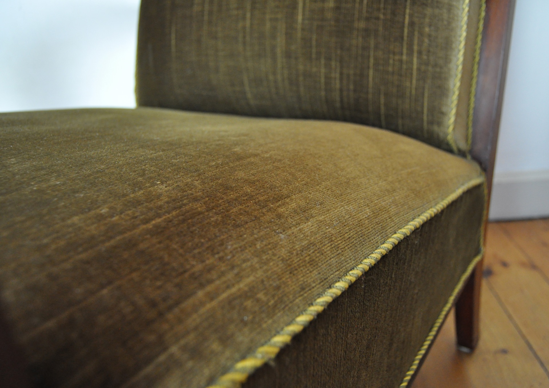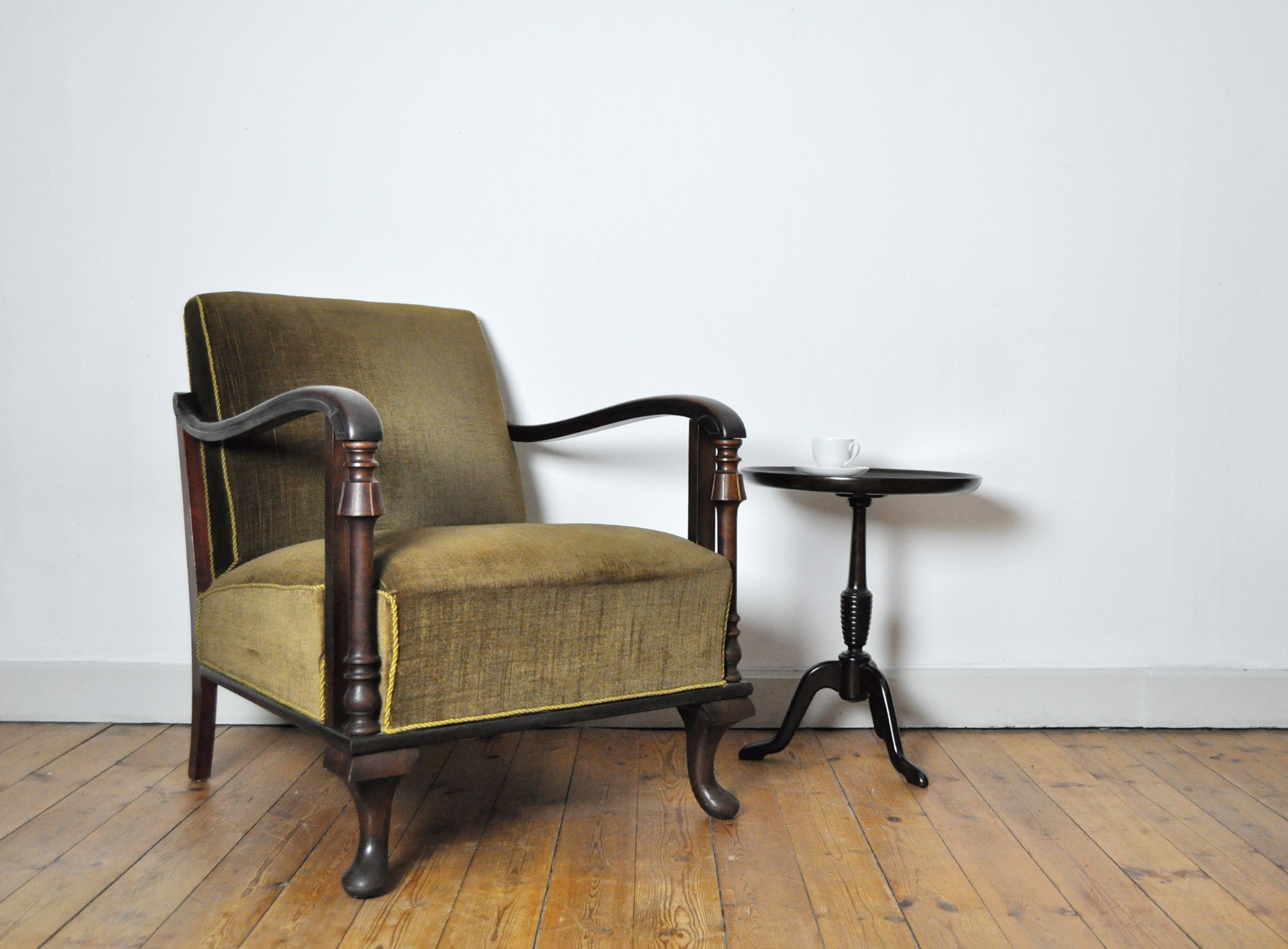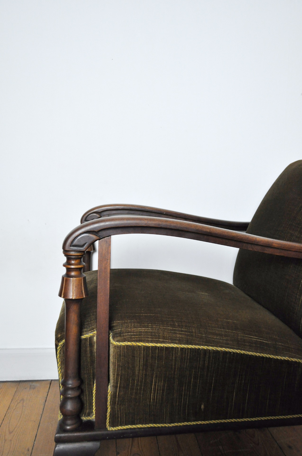 A beautiful patinated vintage Danish lounge chair. The chair features elegantly carved details visible on the wooden frames, reflecting Art Deco influences alongside echoes of 19th-century craftsmanship. The chair is upholstered in their original olive-green patinated fabric, which pairs beautifully with the warm-toned wood frame.