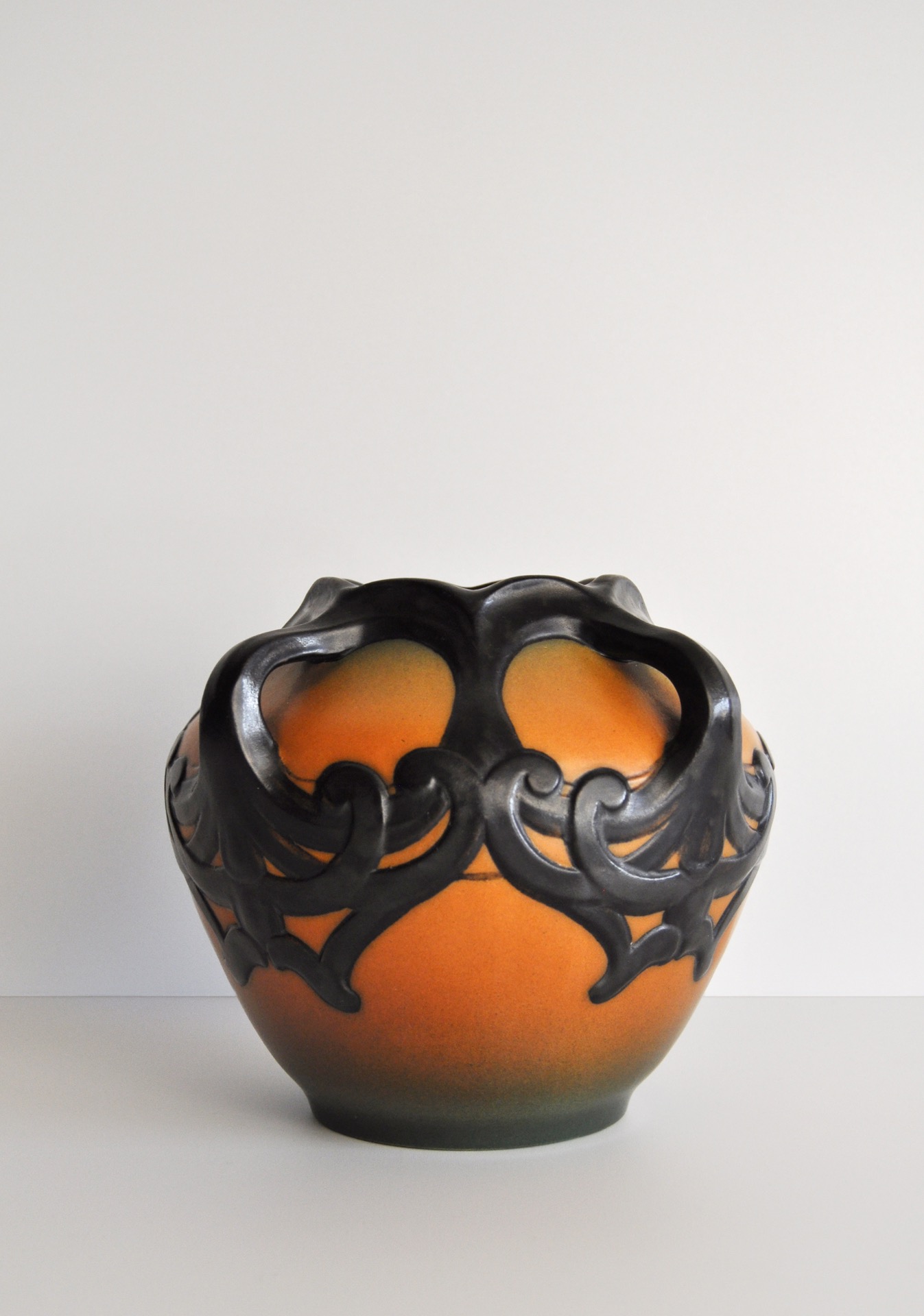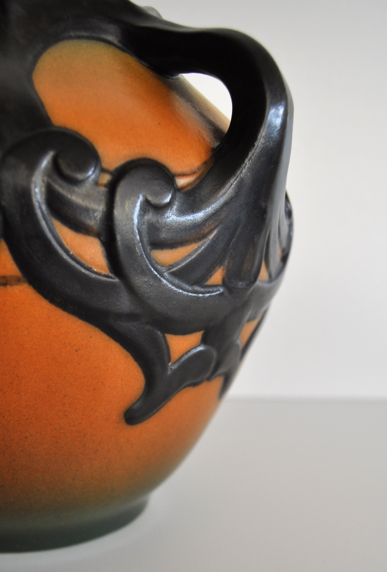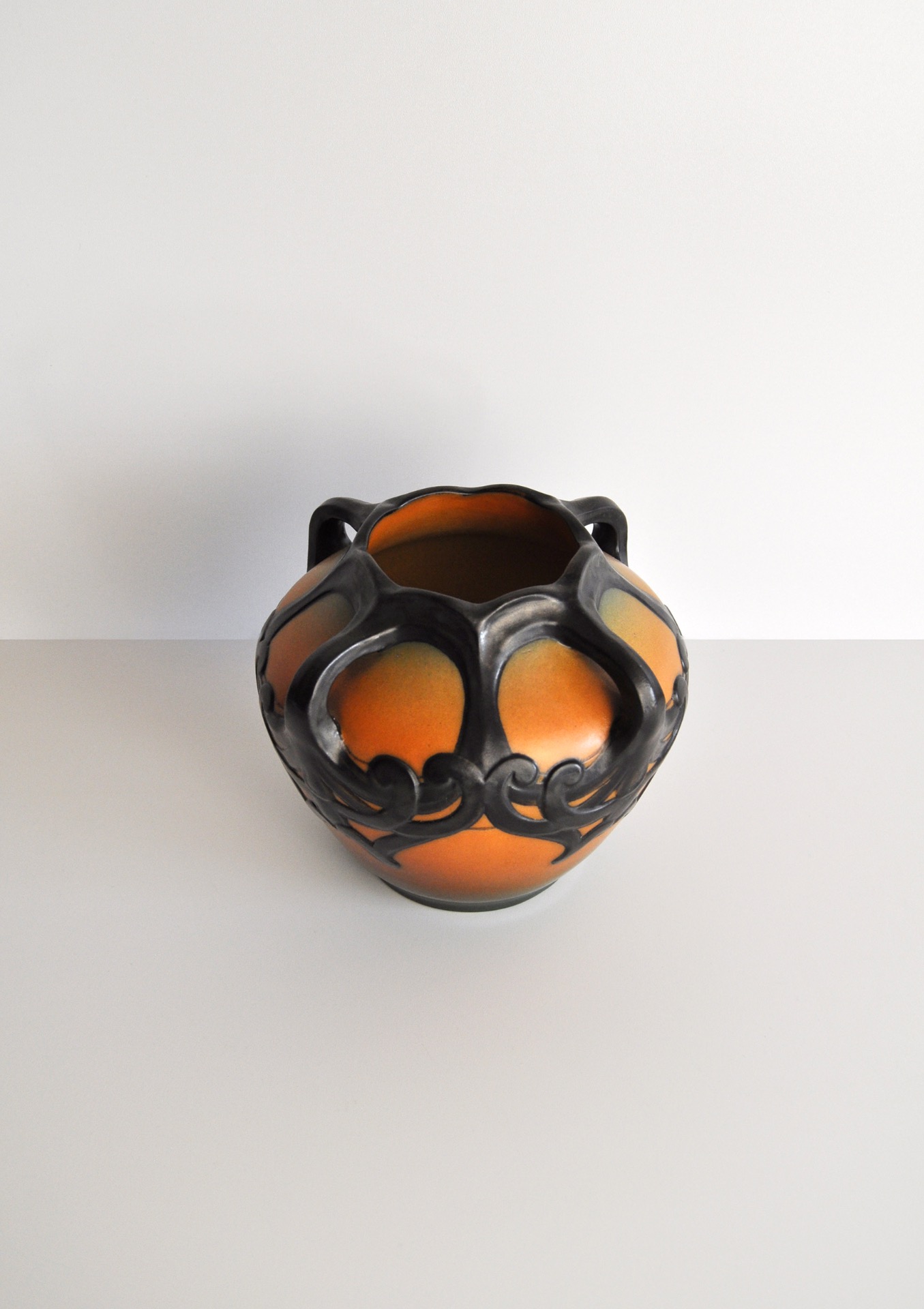 Hand crafted Danish Art Nouveau decorated vase by Karen Hagen 1909 for P. Ipsens Enke. Very bright orange and brown matte glaze. The decorative patterns and handles are well made and lively.