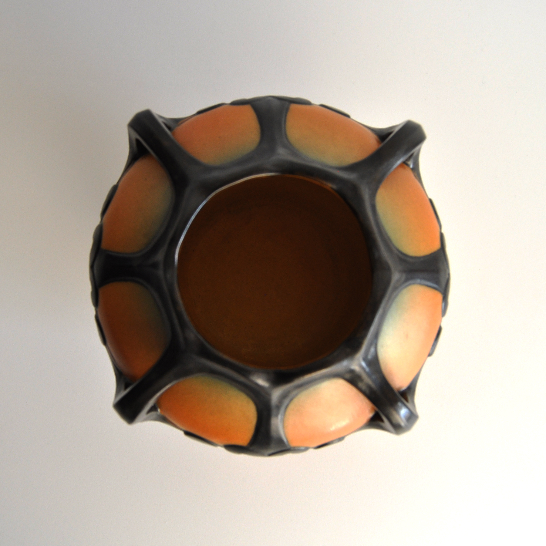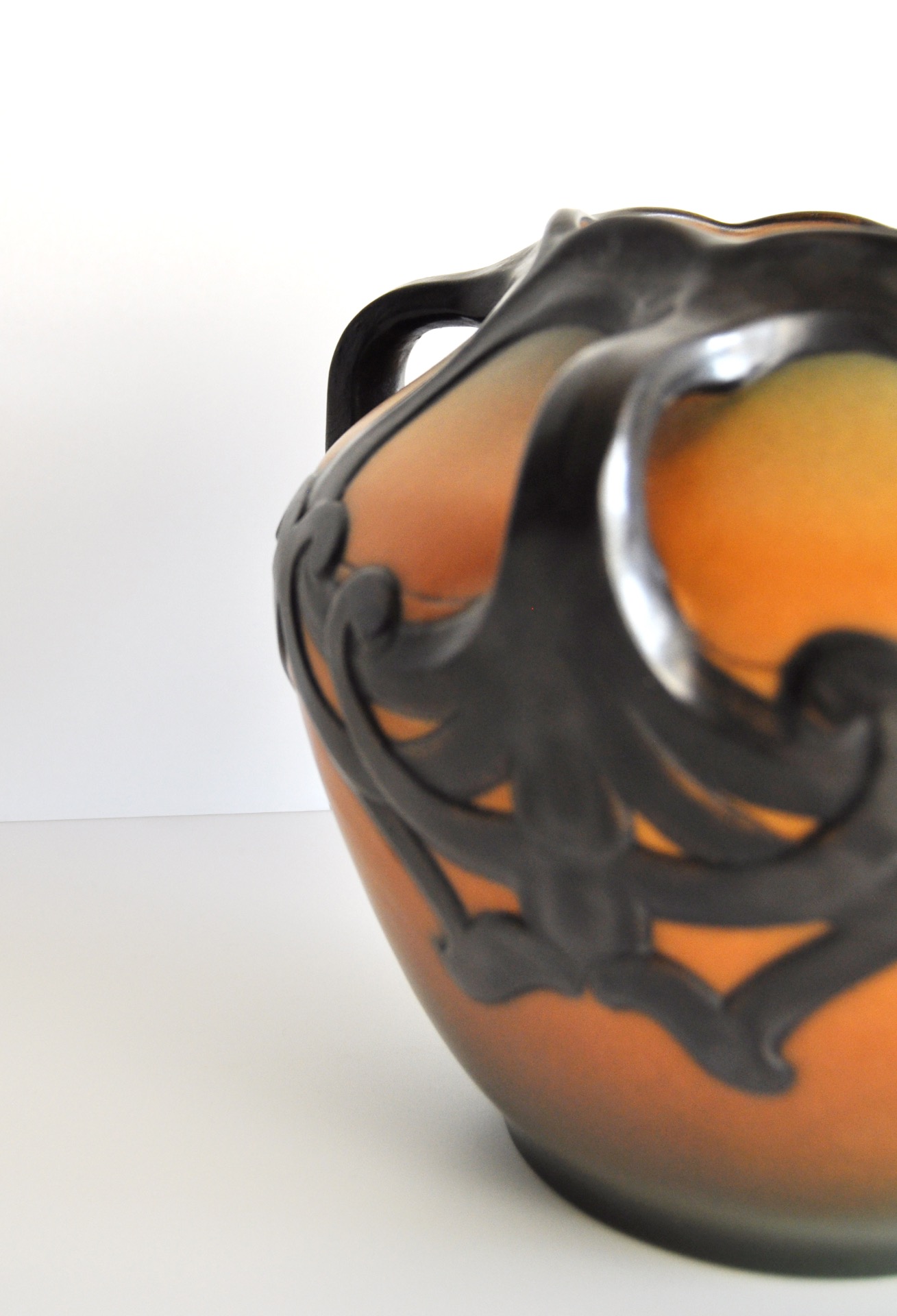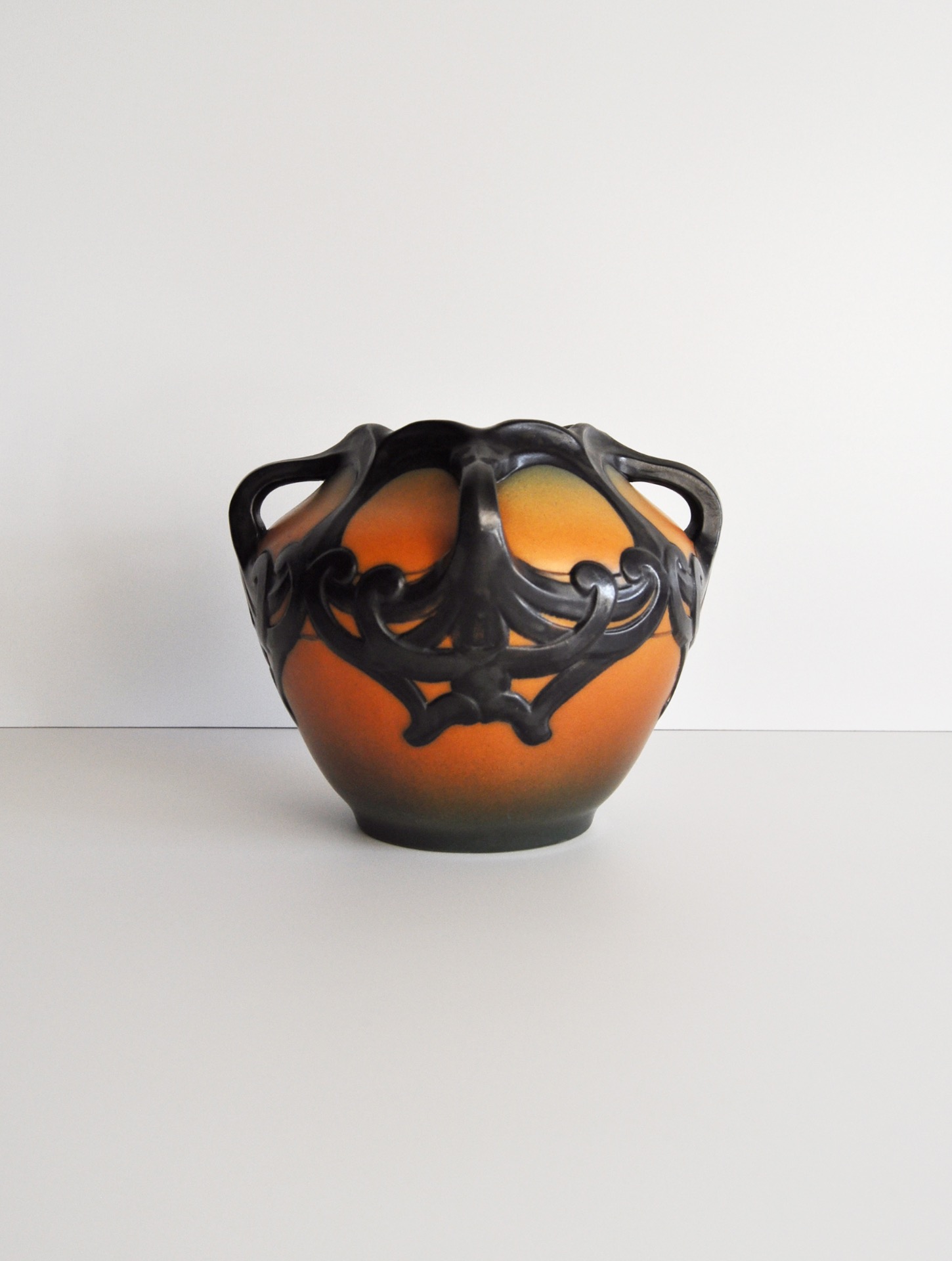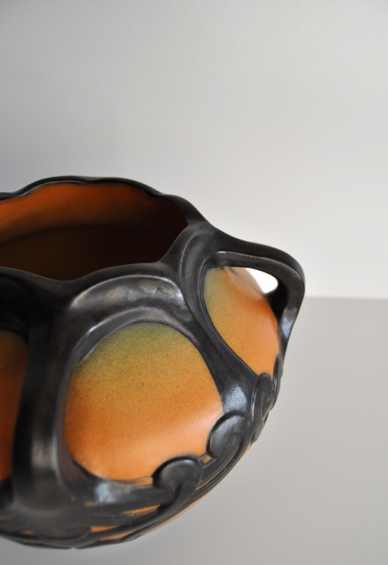 Hand crafted Danish Art Nouveau decorated vase by Karen Hagen 1909 for P. Ipsens Enke. Very bright orange and brown matte glaze. The decorative patterns and handles are well made and lively.