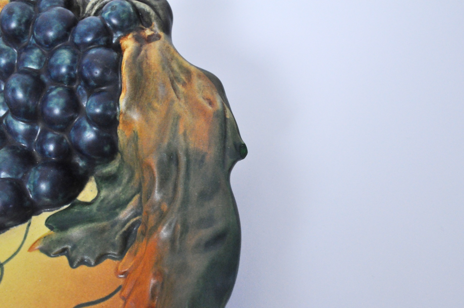 Hand crafted Danish Art Nouveau grape decorated platter by Erik Magnussen in 1927 for P. Ipsens Enke. The decorative blue grapes are well made and lively.