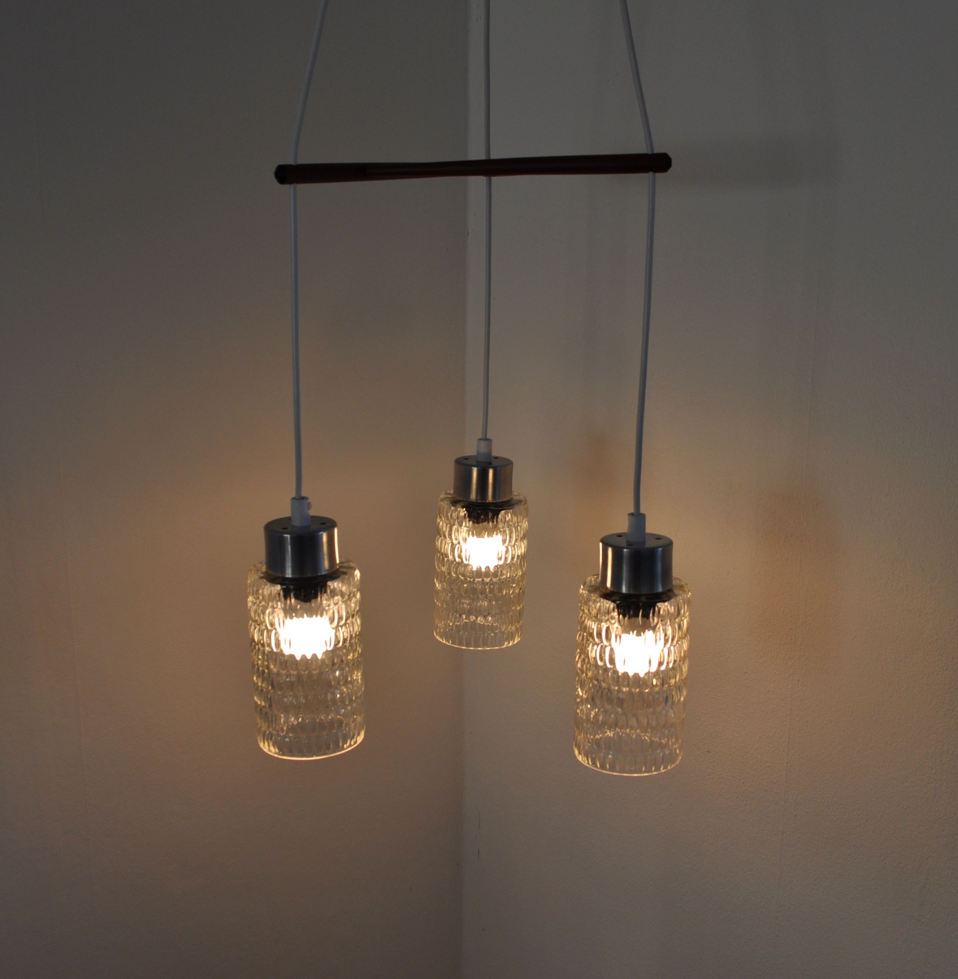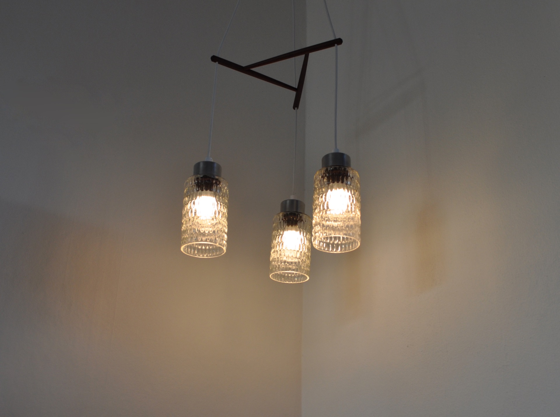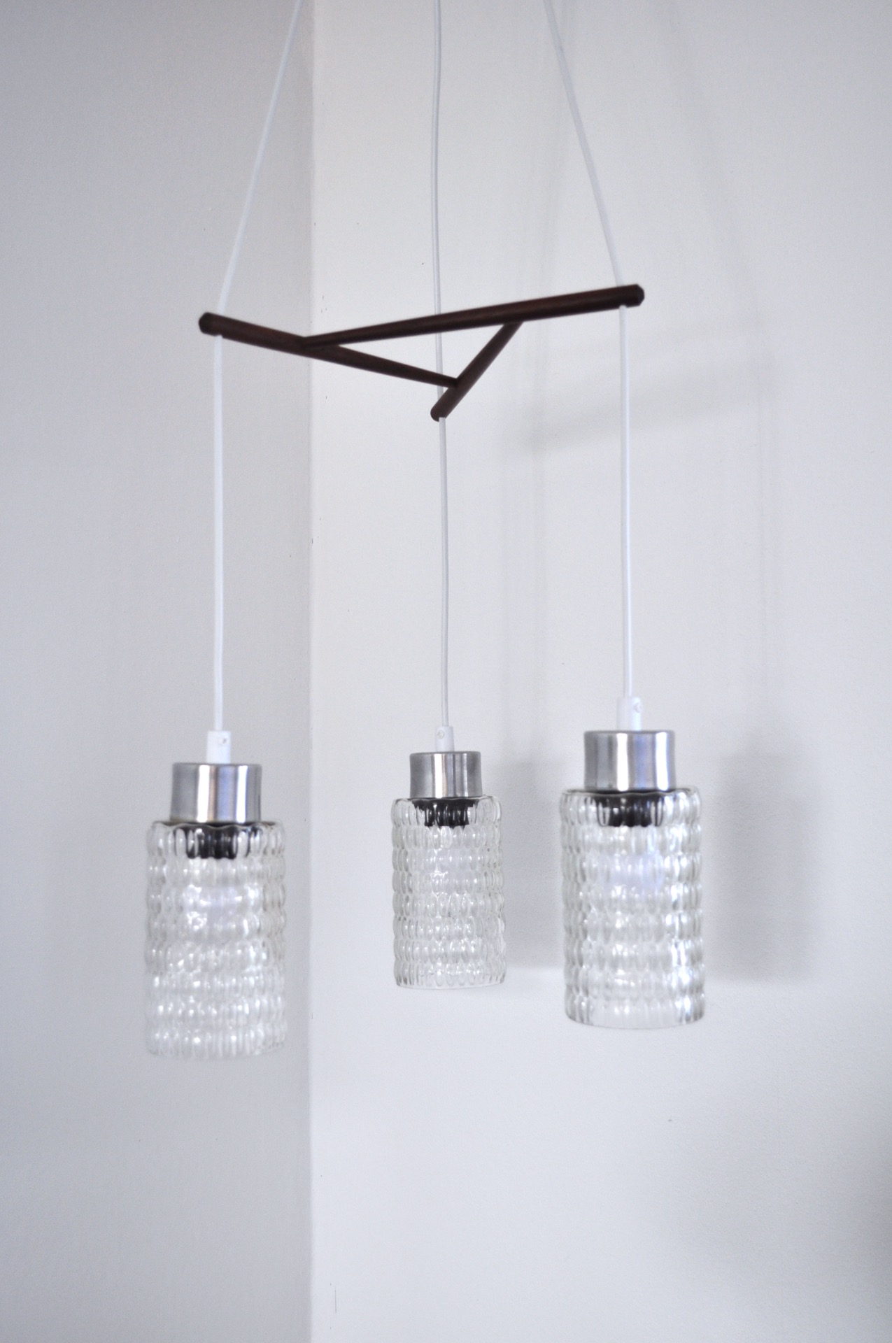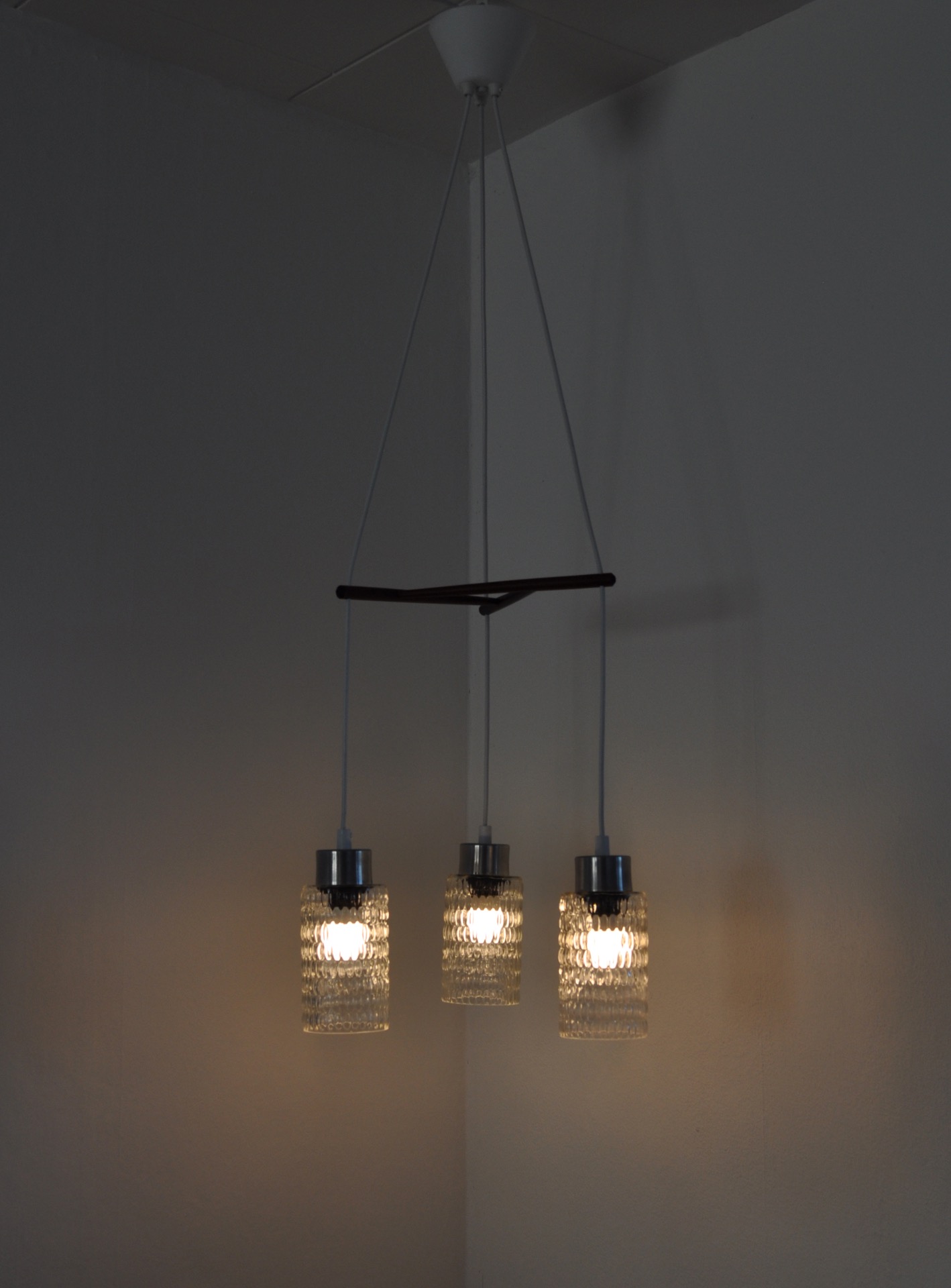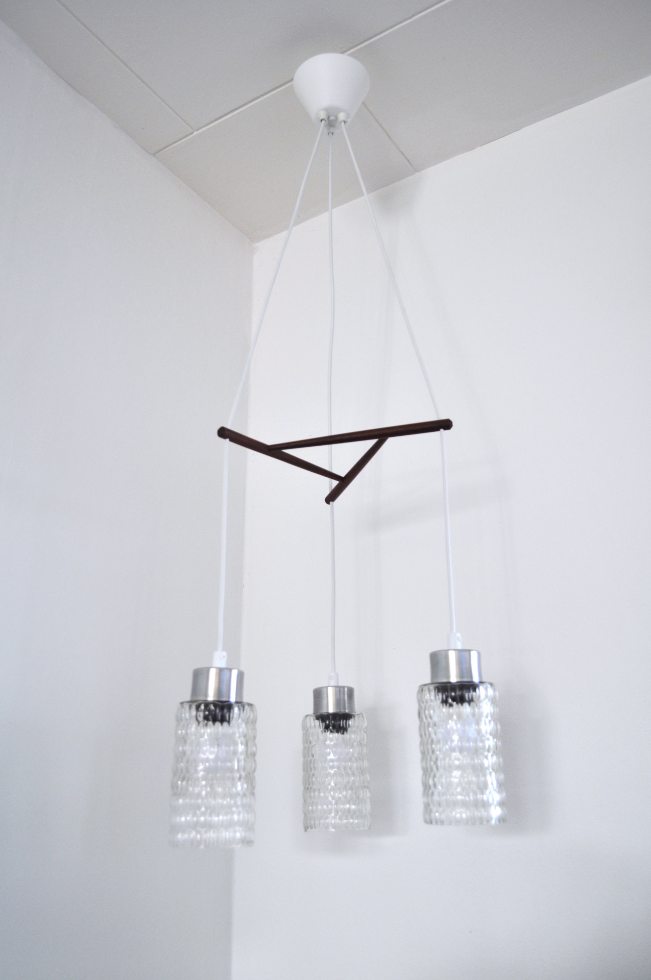 Triple glass shade suspention lamp with teak stretcher.