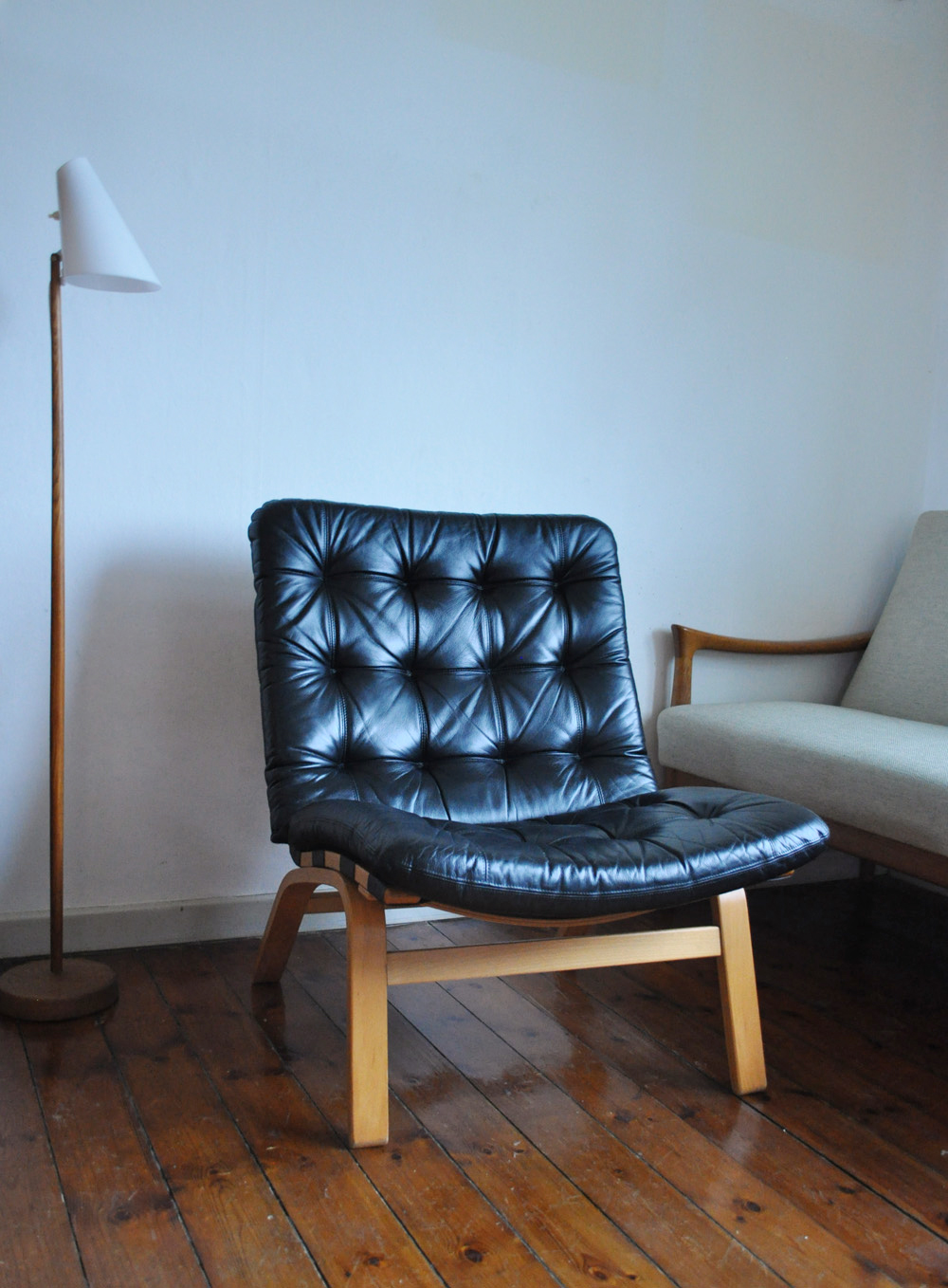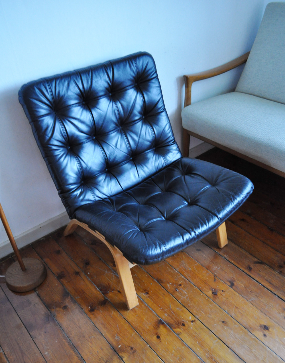 Black leather lounge chair by Farstrup Møbler. Leather upholstery in a fine condition. Frame in laminated beech.