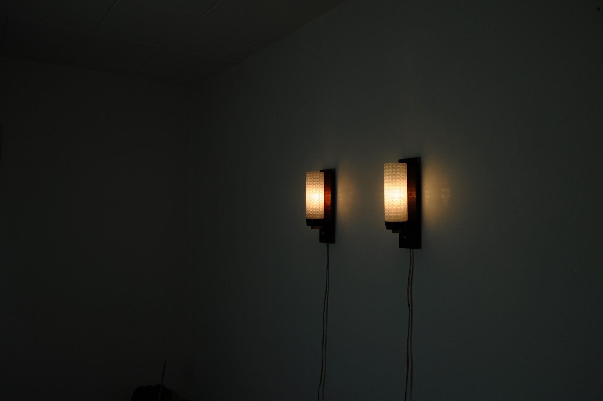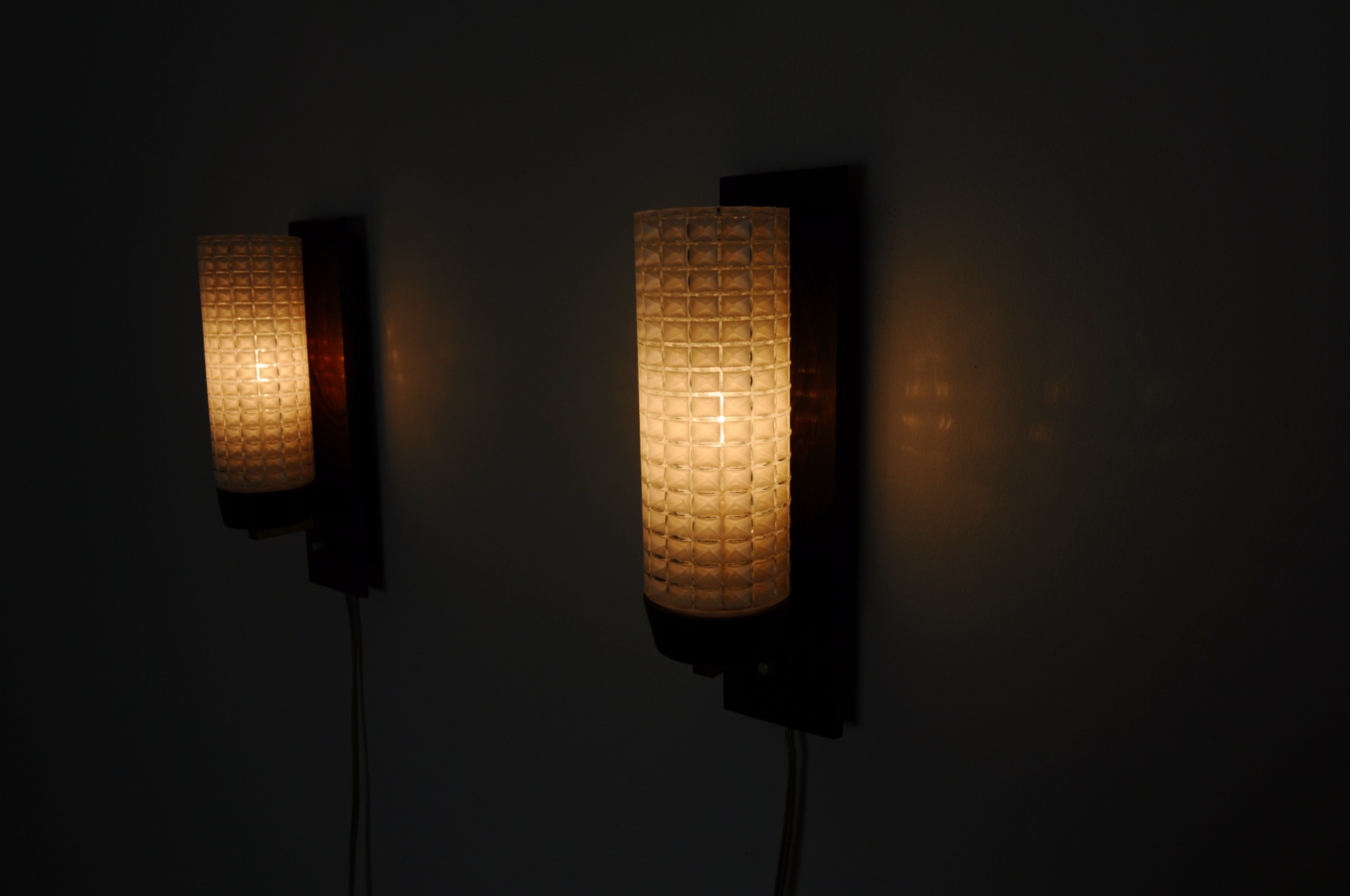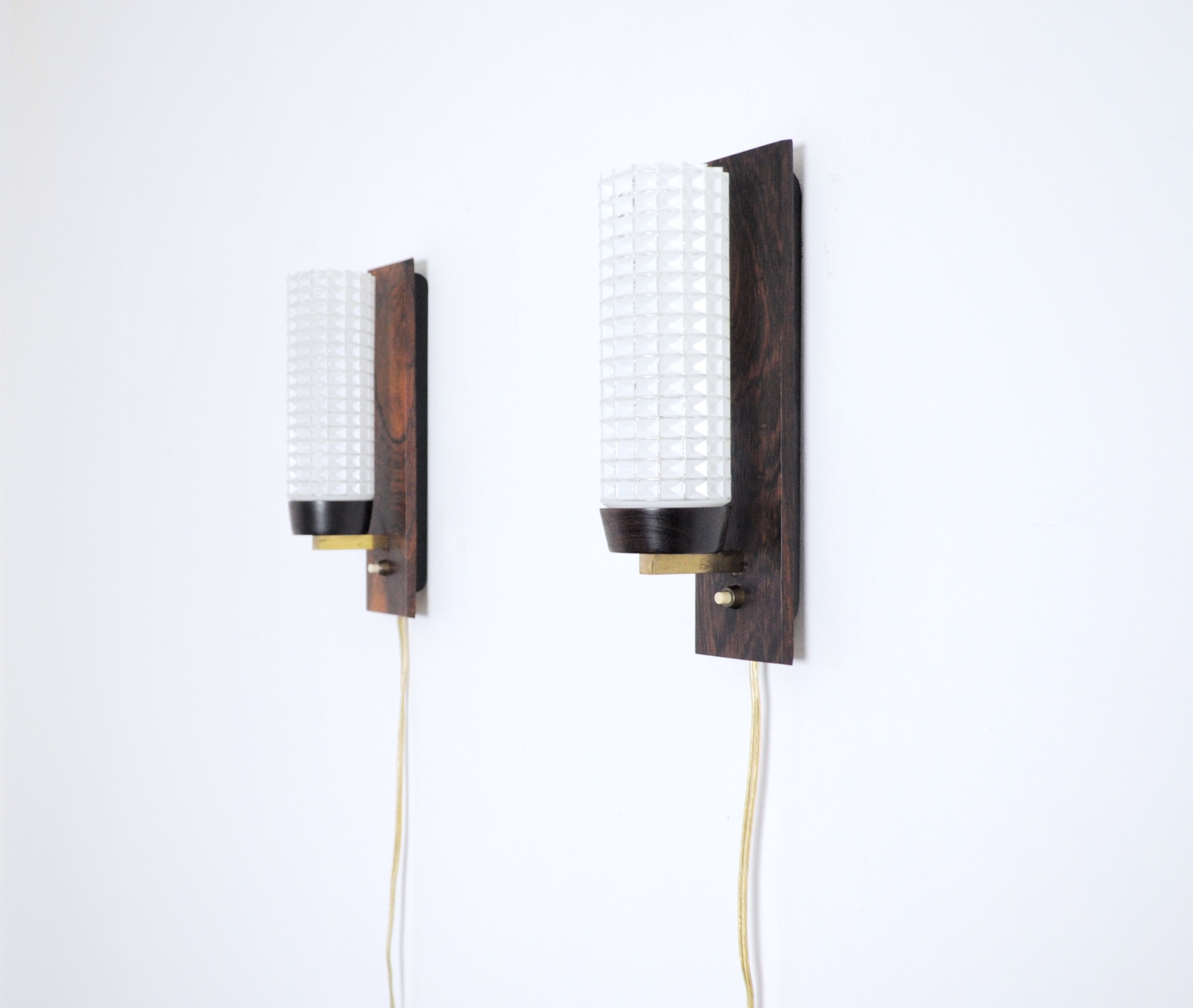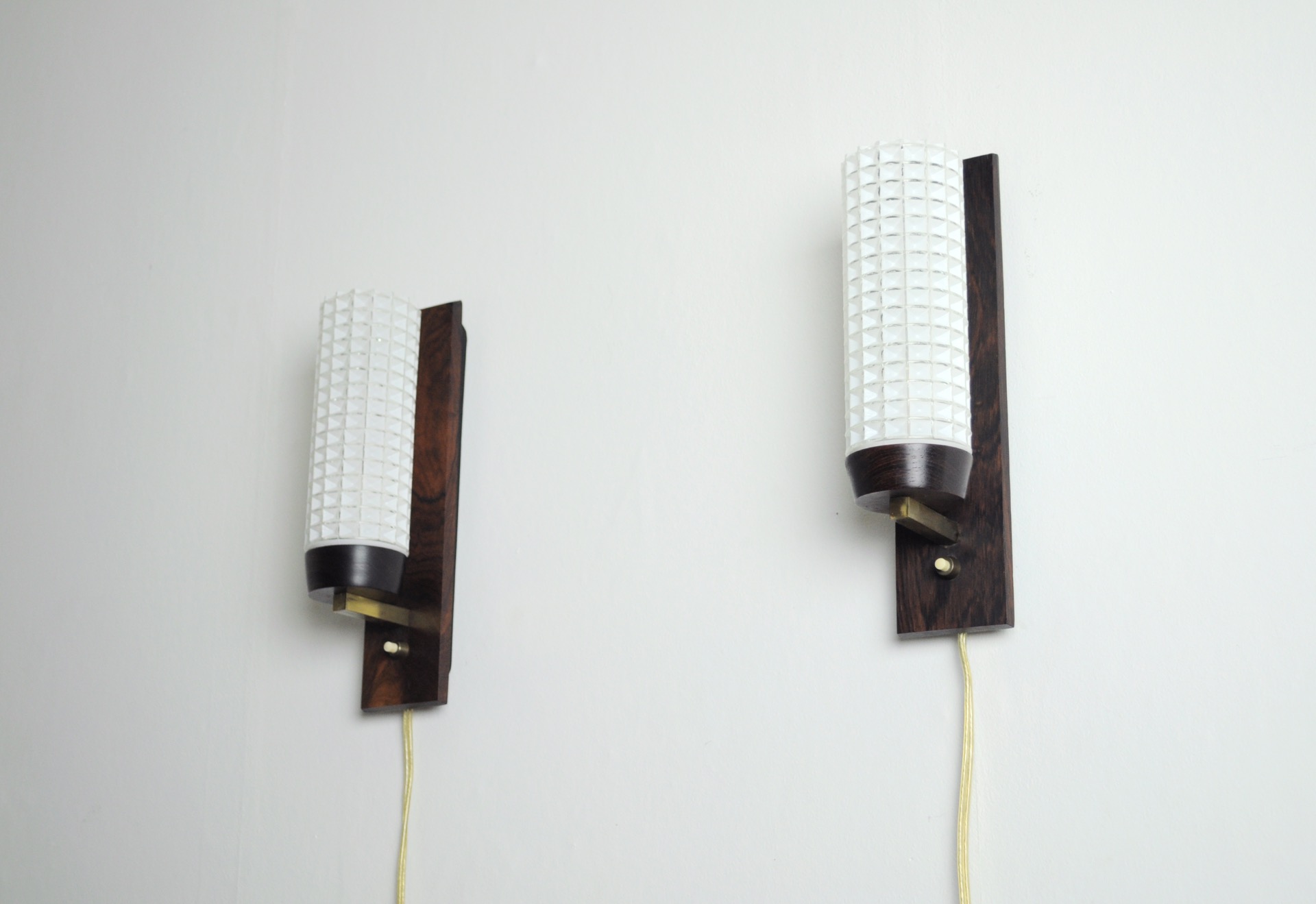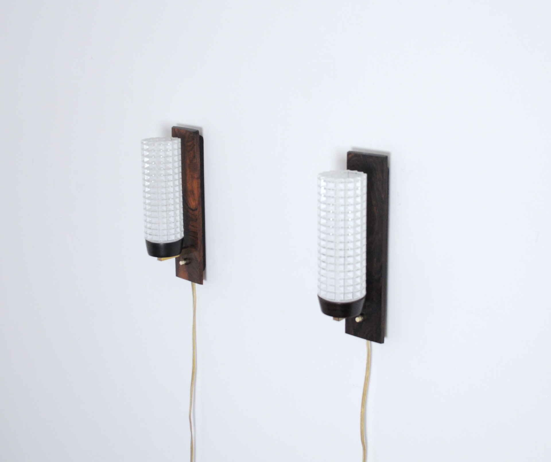 A pair of Danish Modern rosewood and glass wall sconce by Lyfa in the 1960s.