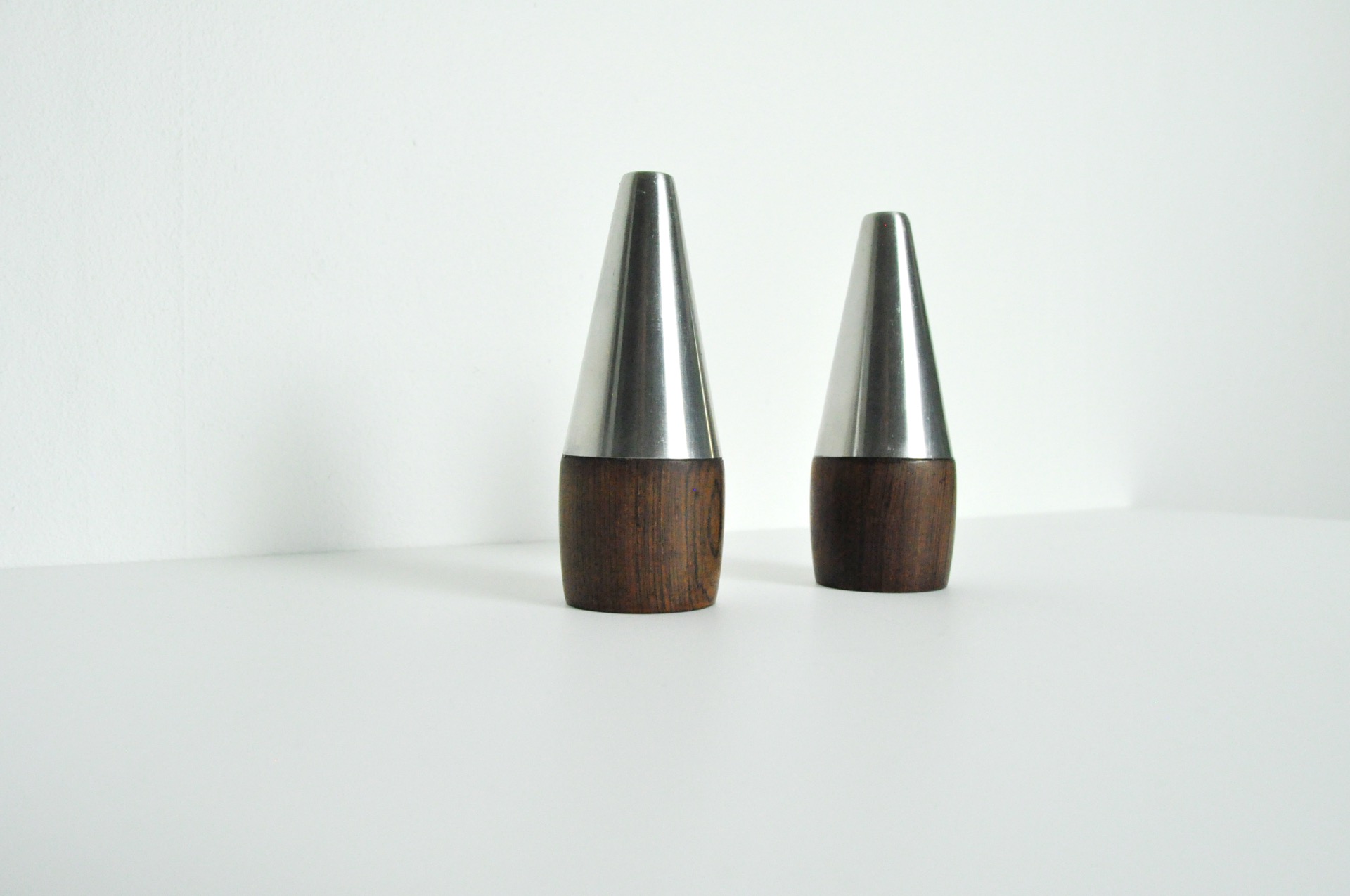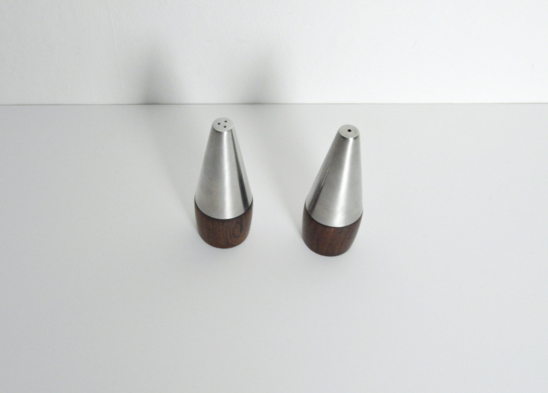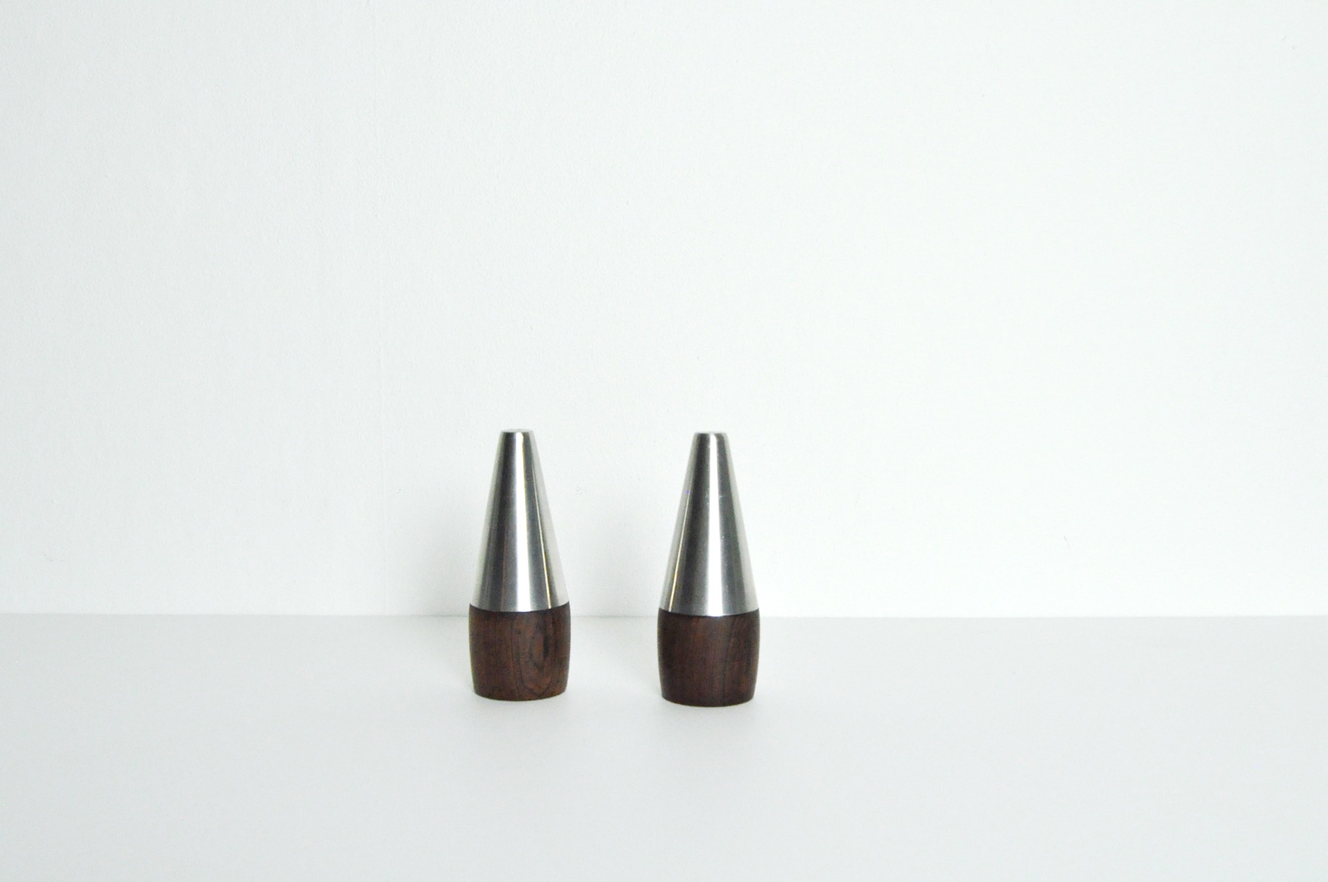 DANISH MODERN PAIR OF ROSEWOOD AND STAINLESS STEEL SALT AND PEPPER SHAKERS