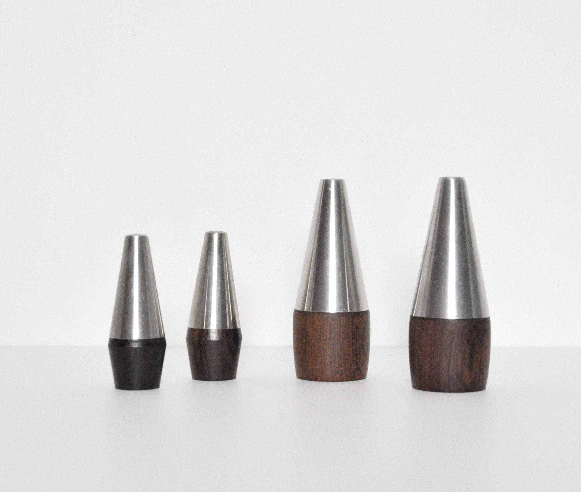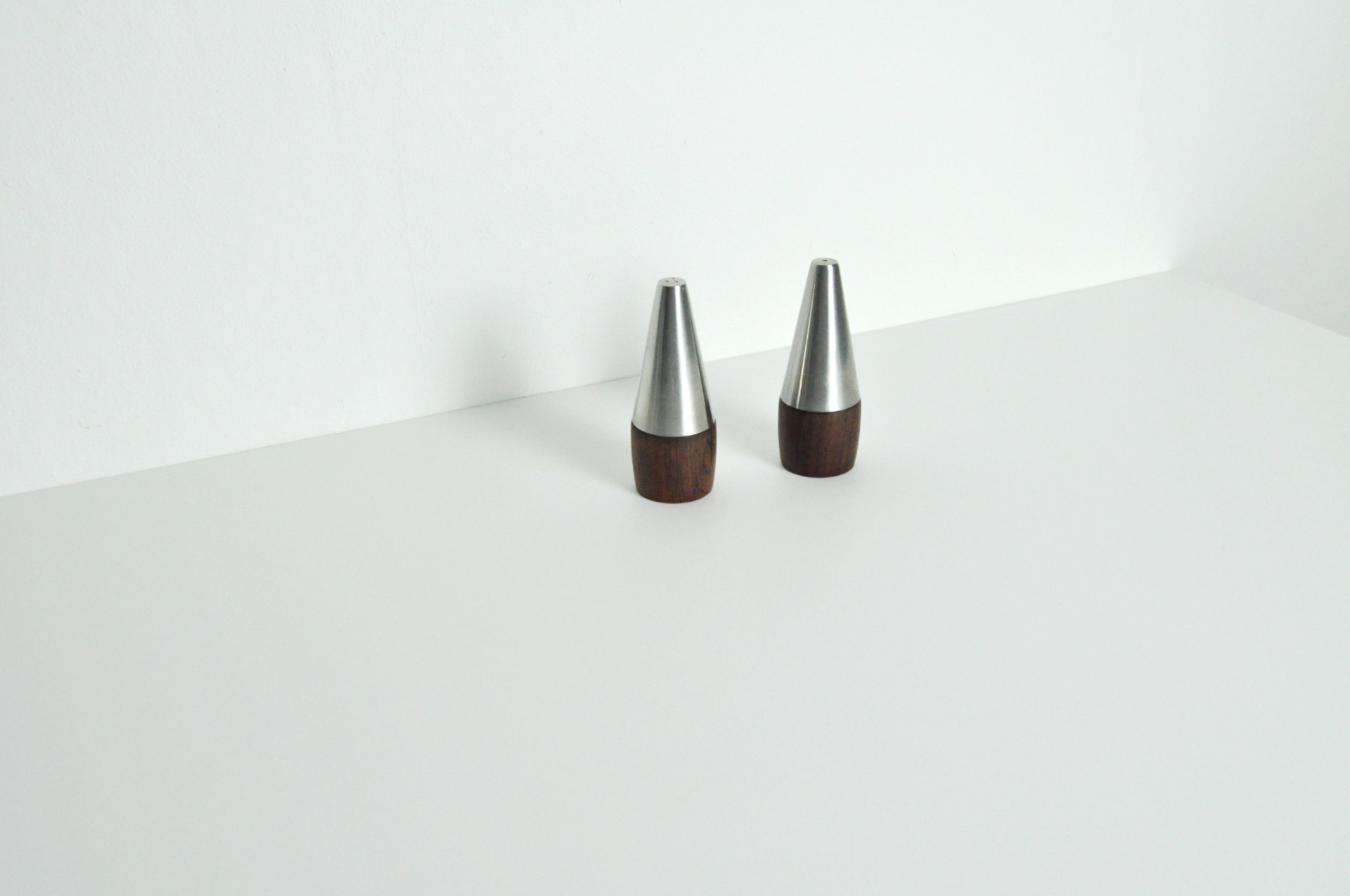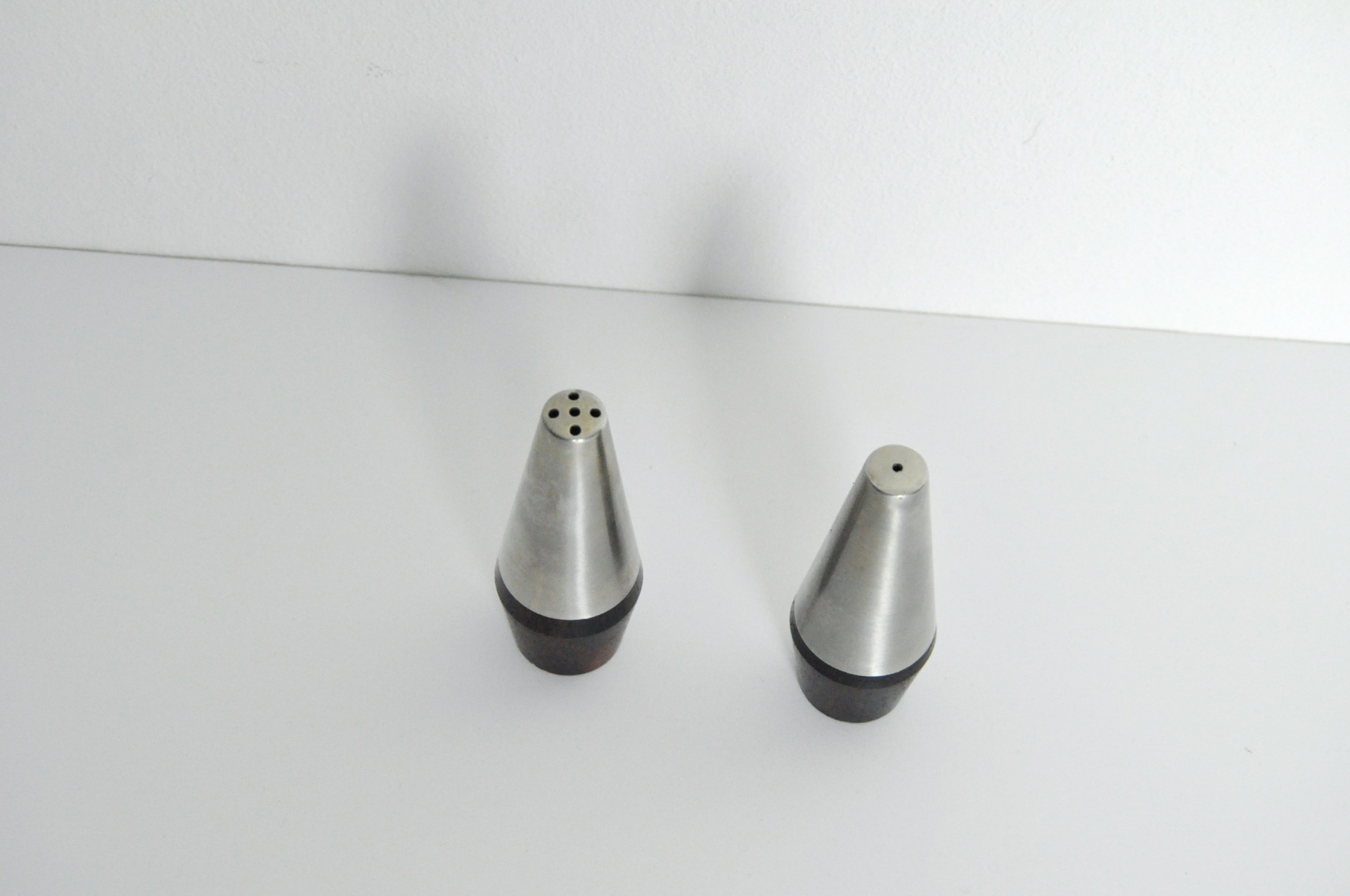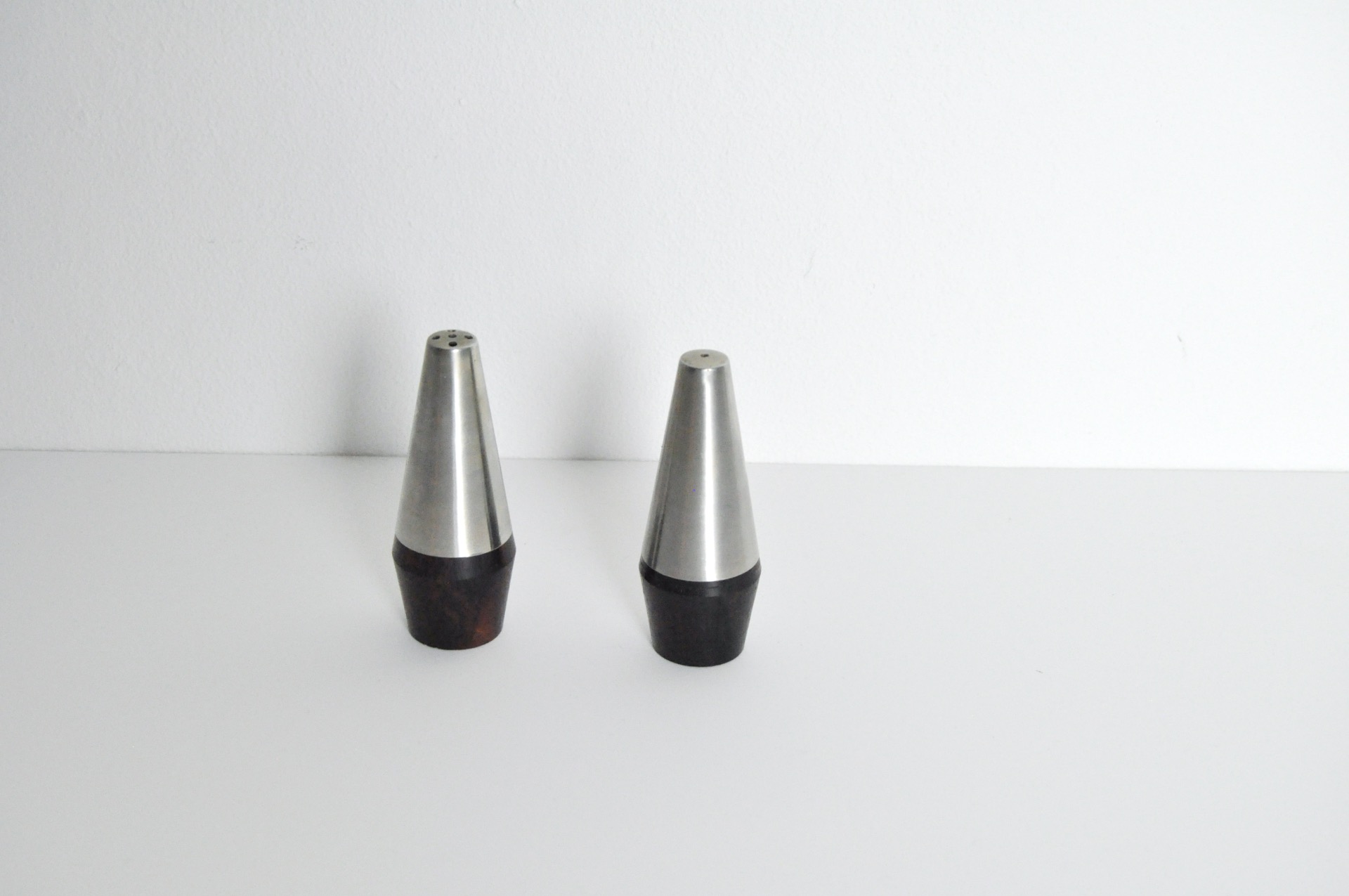 DANISH MODERN PAIR OF ROSEWOOD AND STAINLESS STEEL SALT AND PEPPER SHAKERS