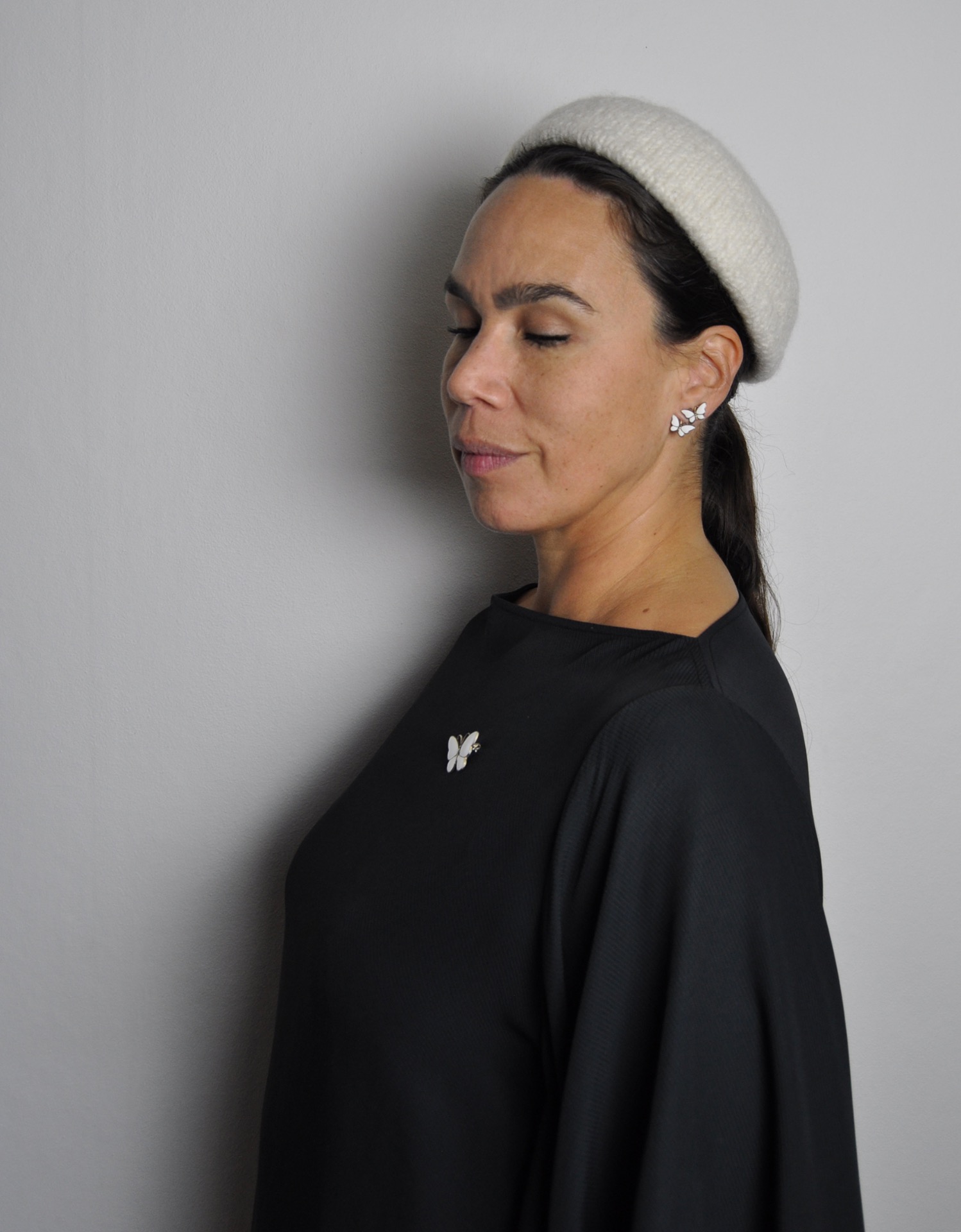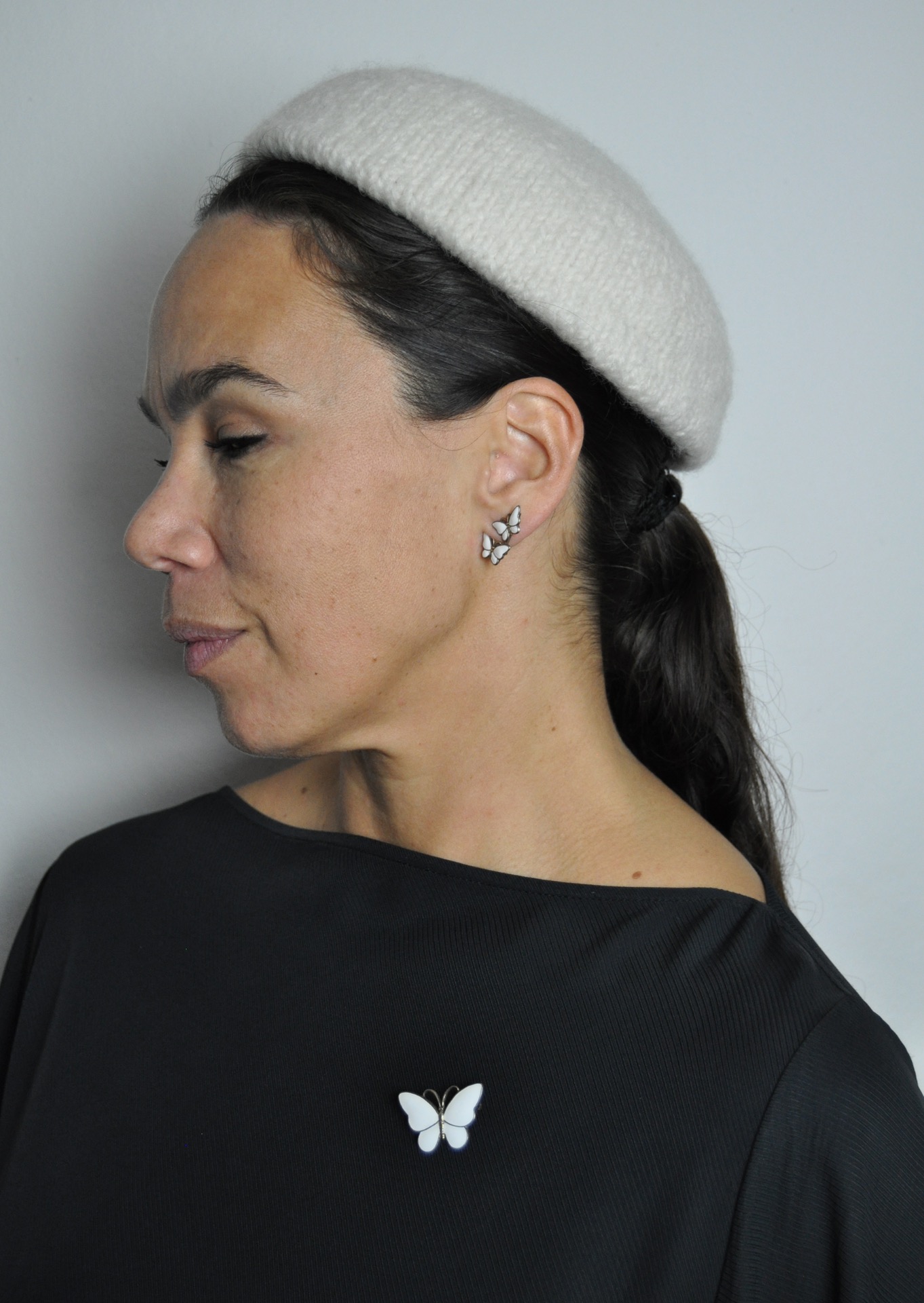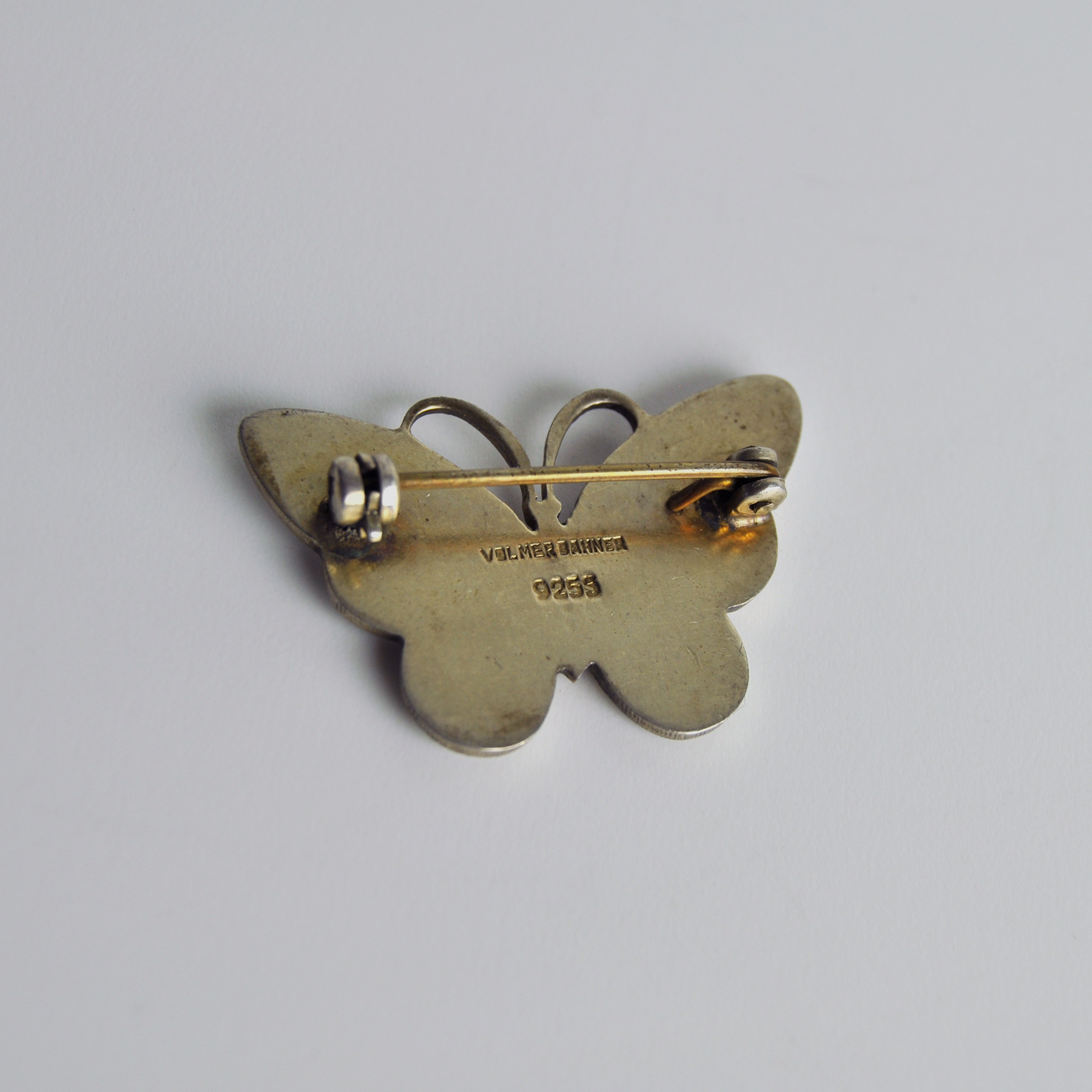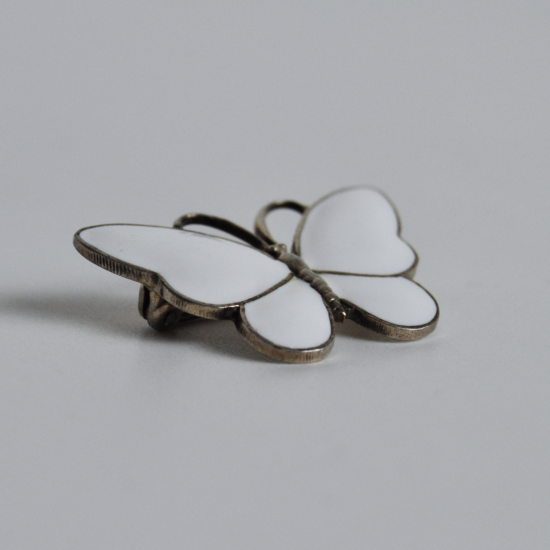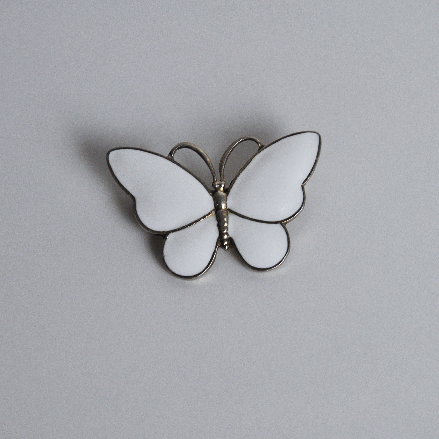 The brooch is shaped like a butterfly, with a white enamel.