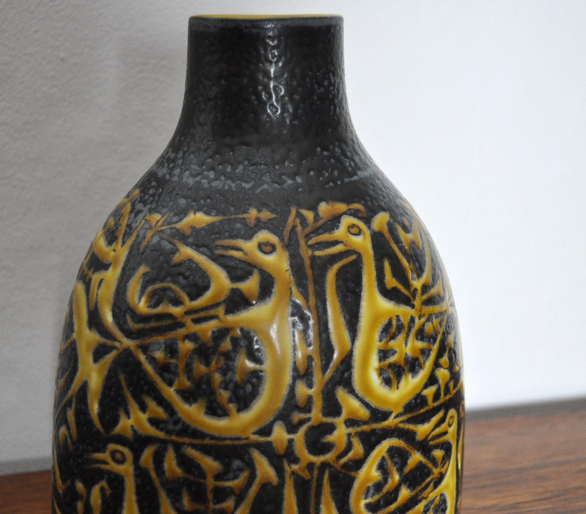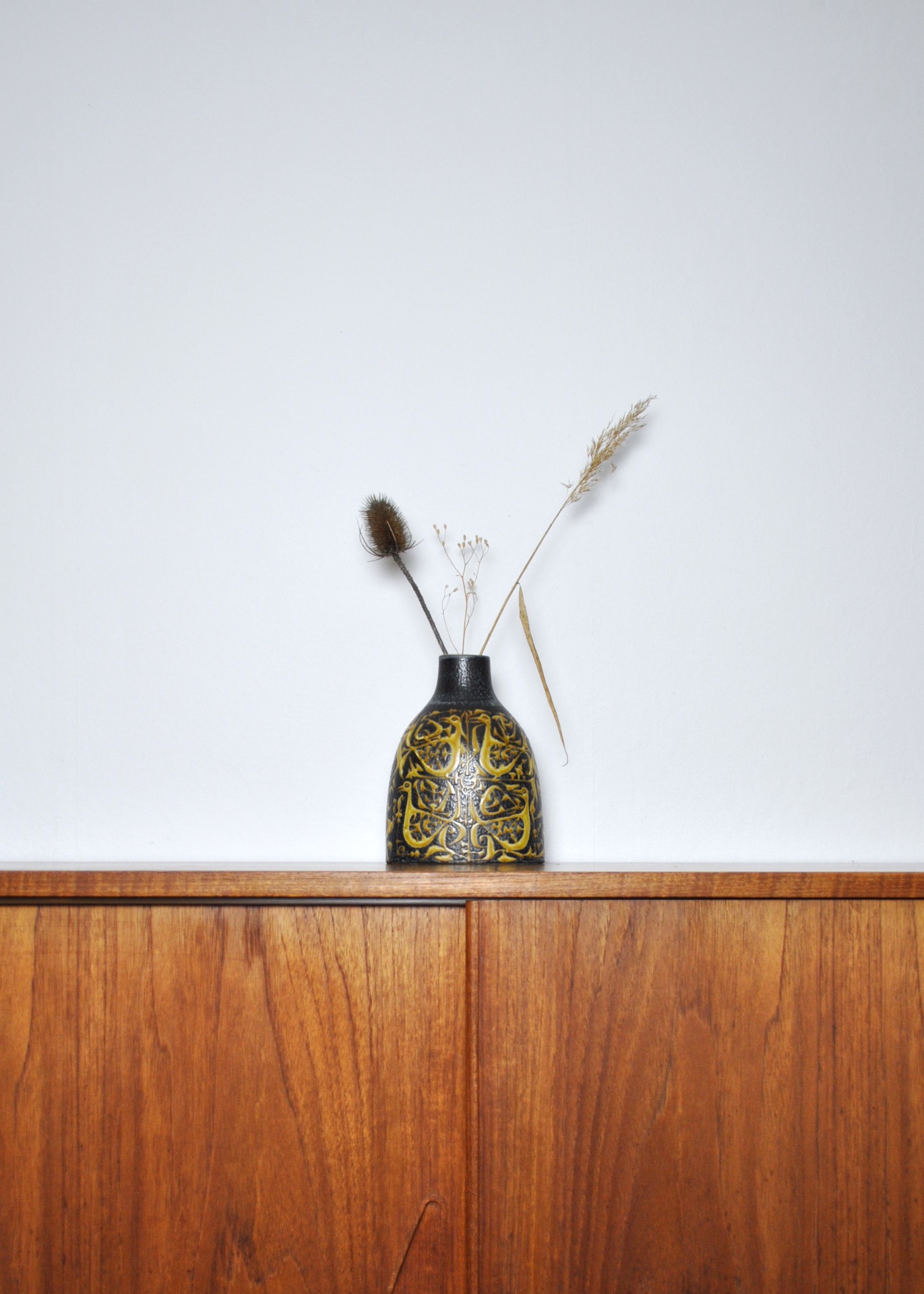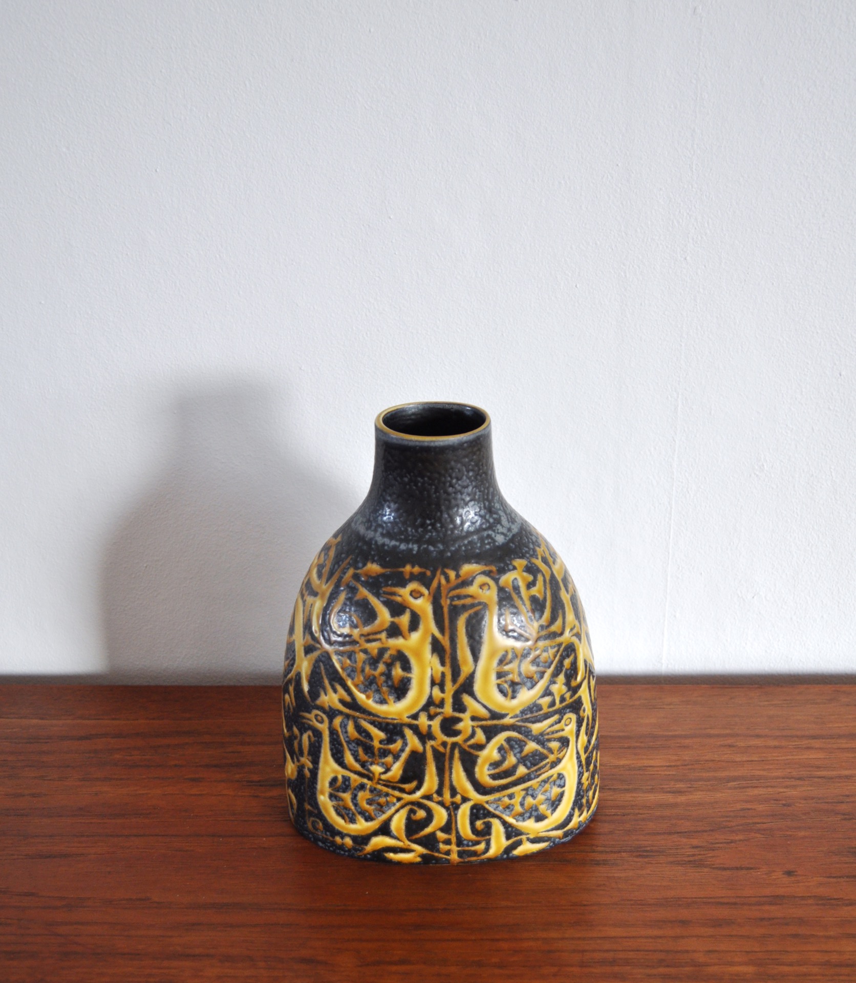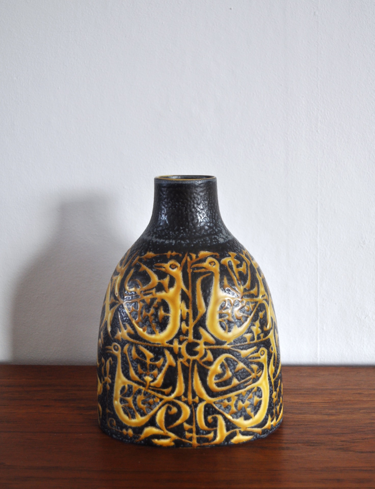 Baca fajance/ceramic vase designed by Nils Thorsson (1898-1975) and produced from 1965 at Royal Copenhagen, Denmark. Complexed and detailed patterns which in creation from Scandinavia have become Mid Century iconic fajance.