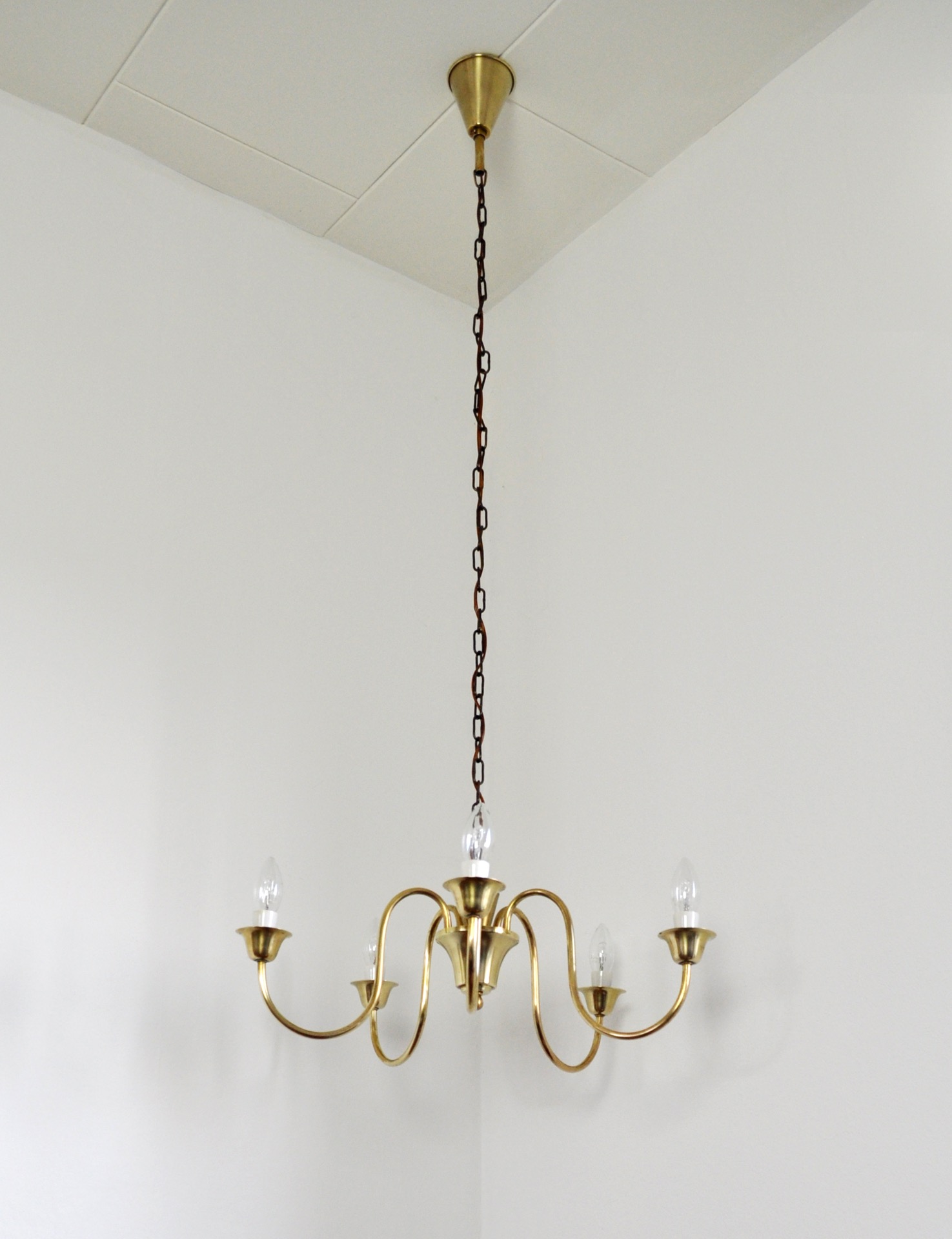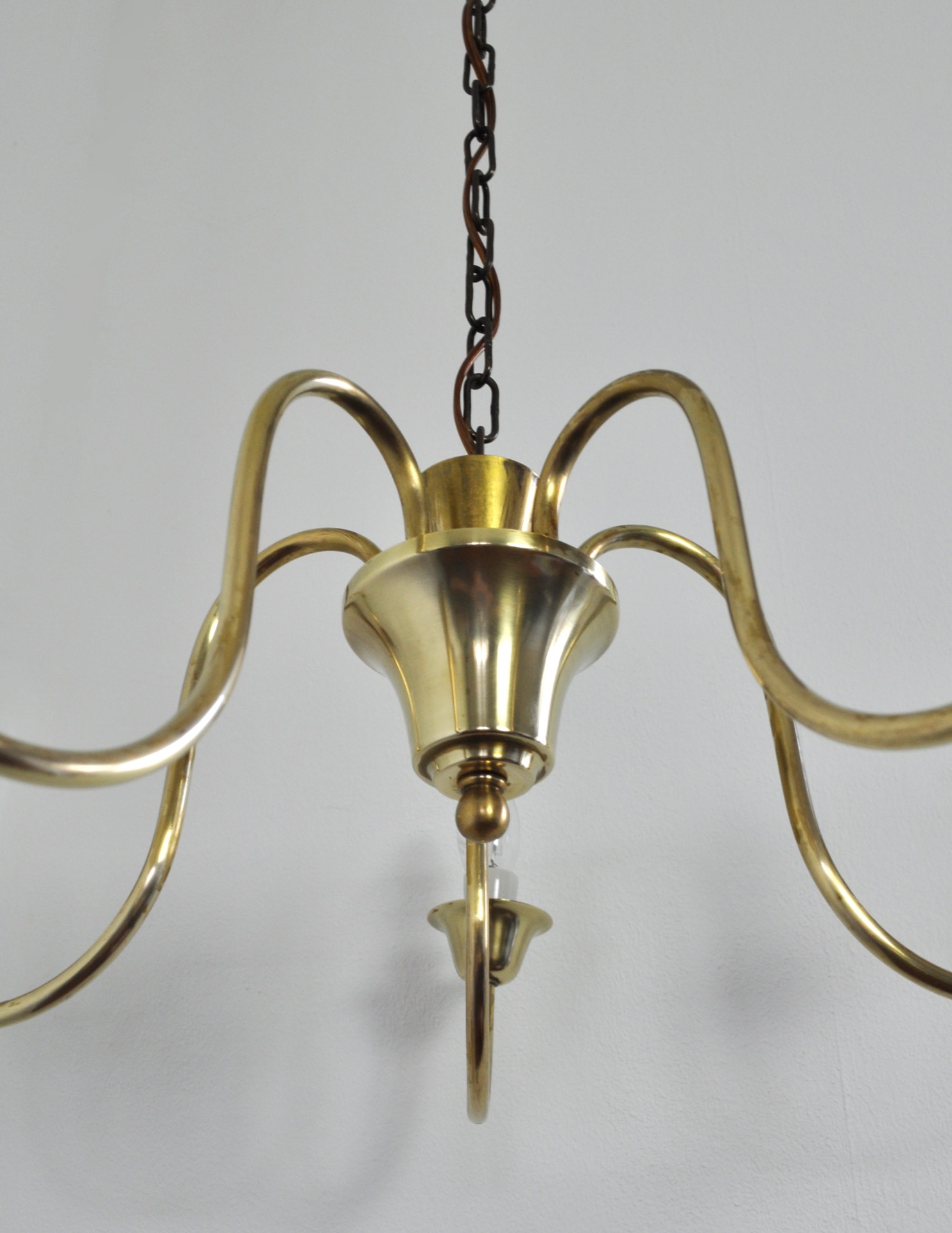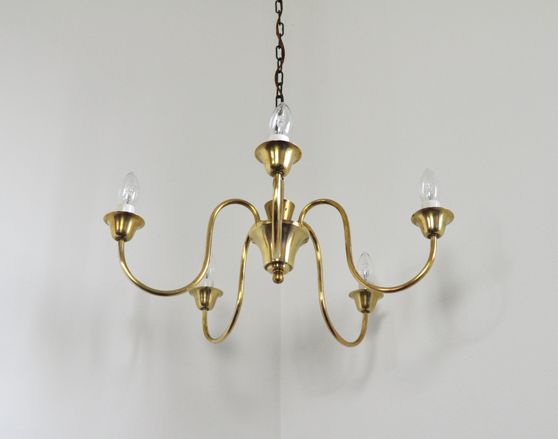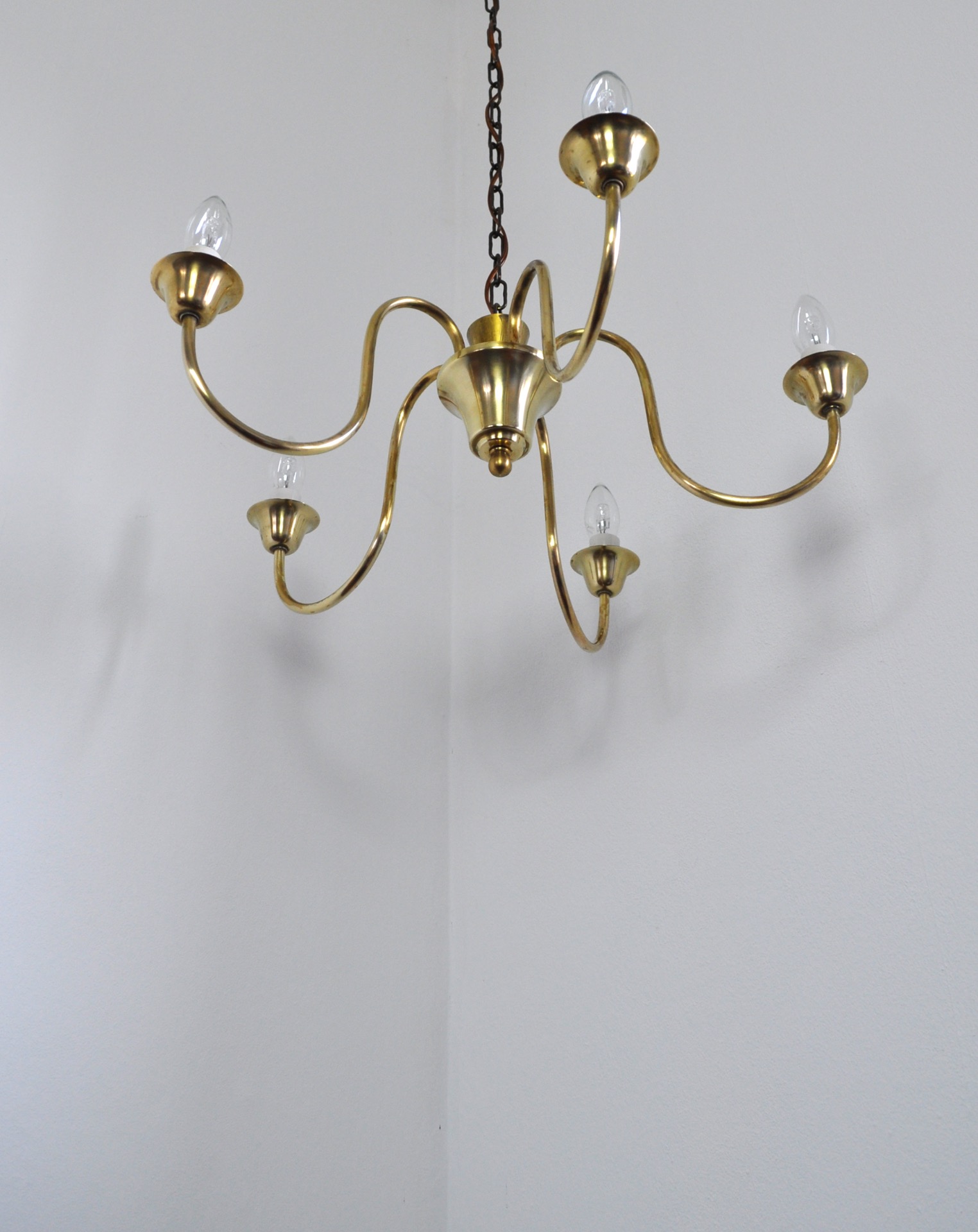 Solid brass five-arm chandelier probably by Fog & Mørup, Denmark, 1950s.