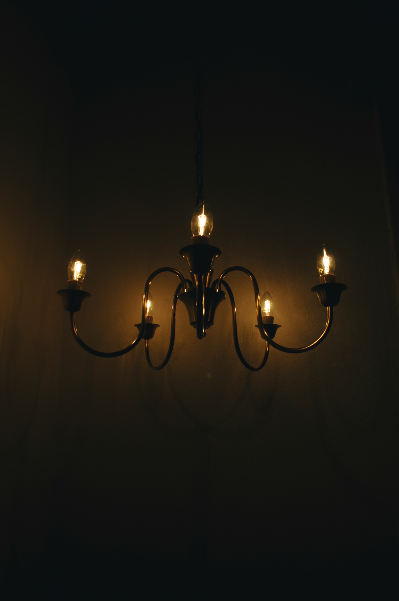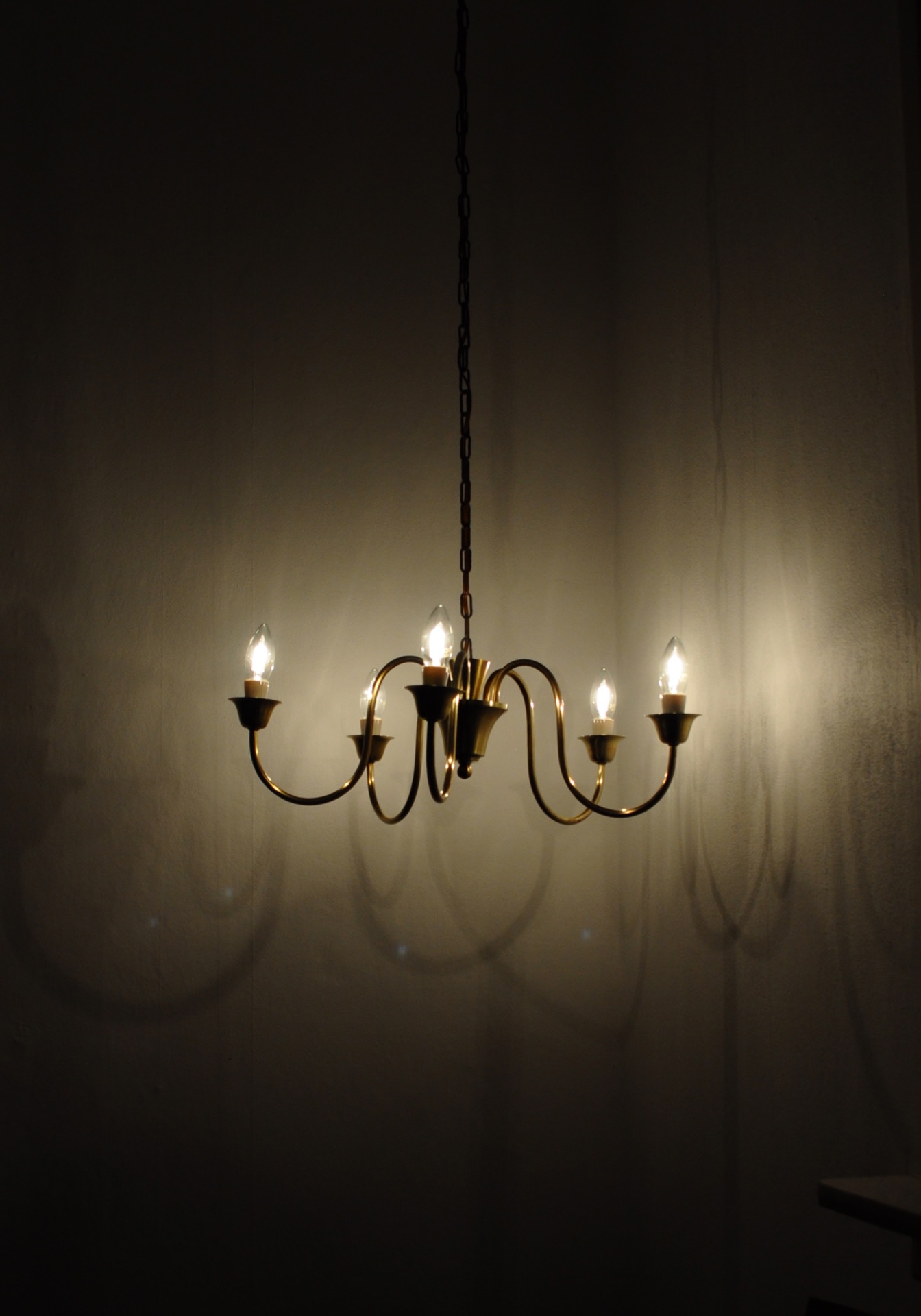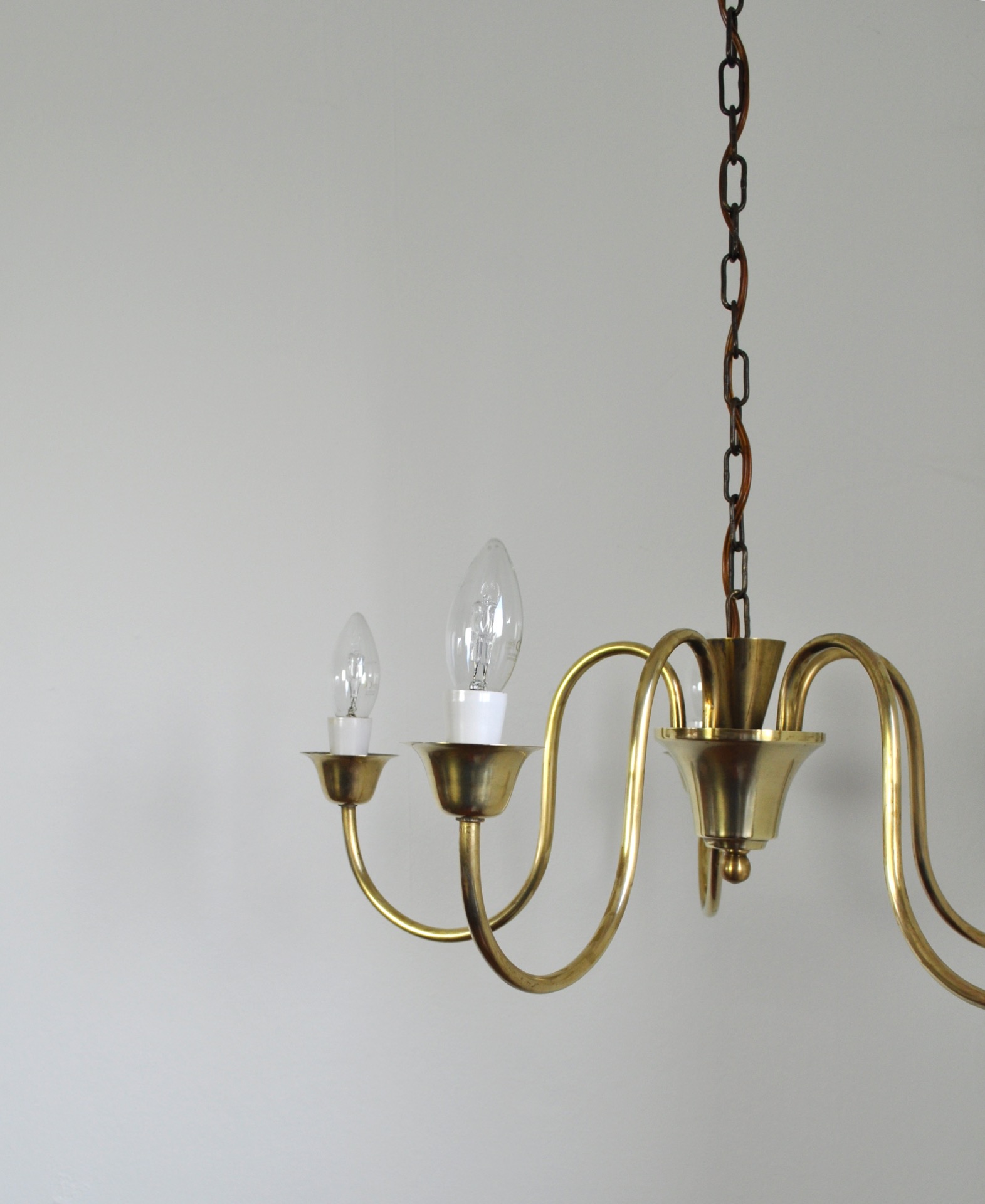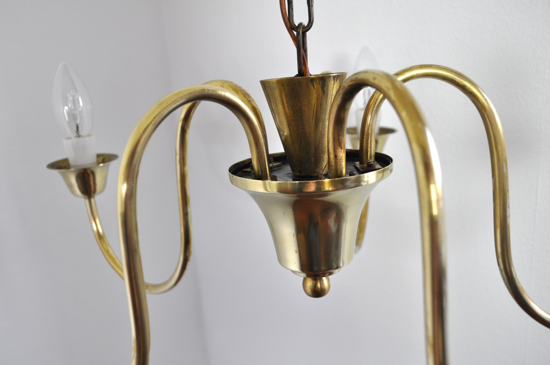 Solid brass five-arm chandelier probably by Fog & Mørup, Denmark, 1950s.