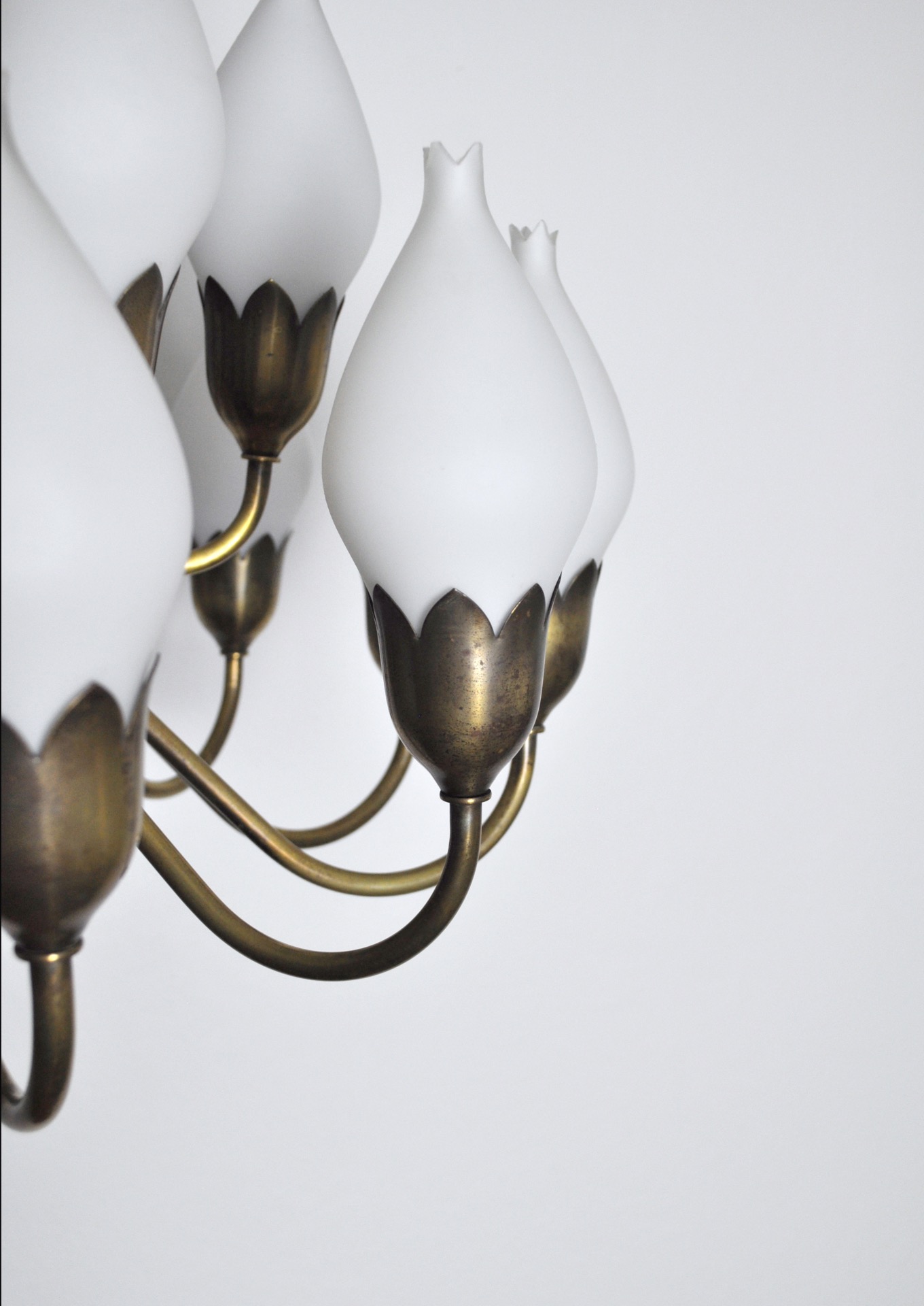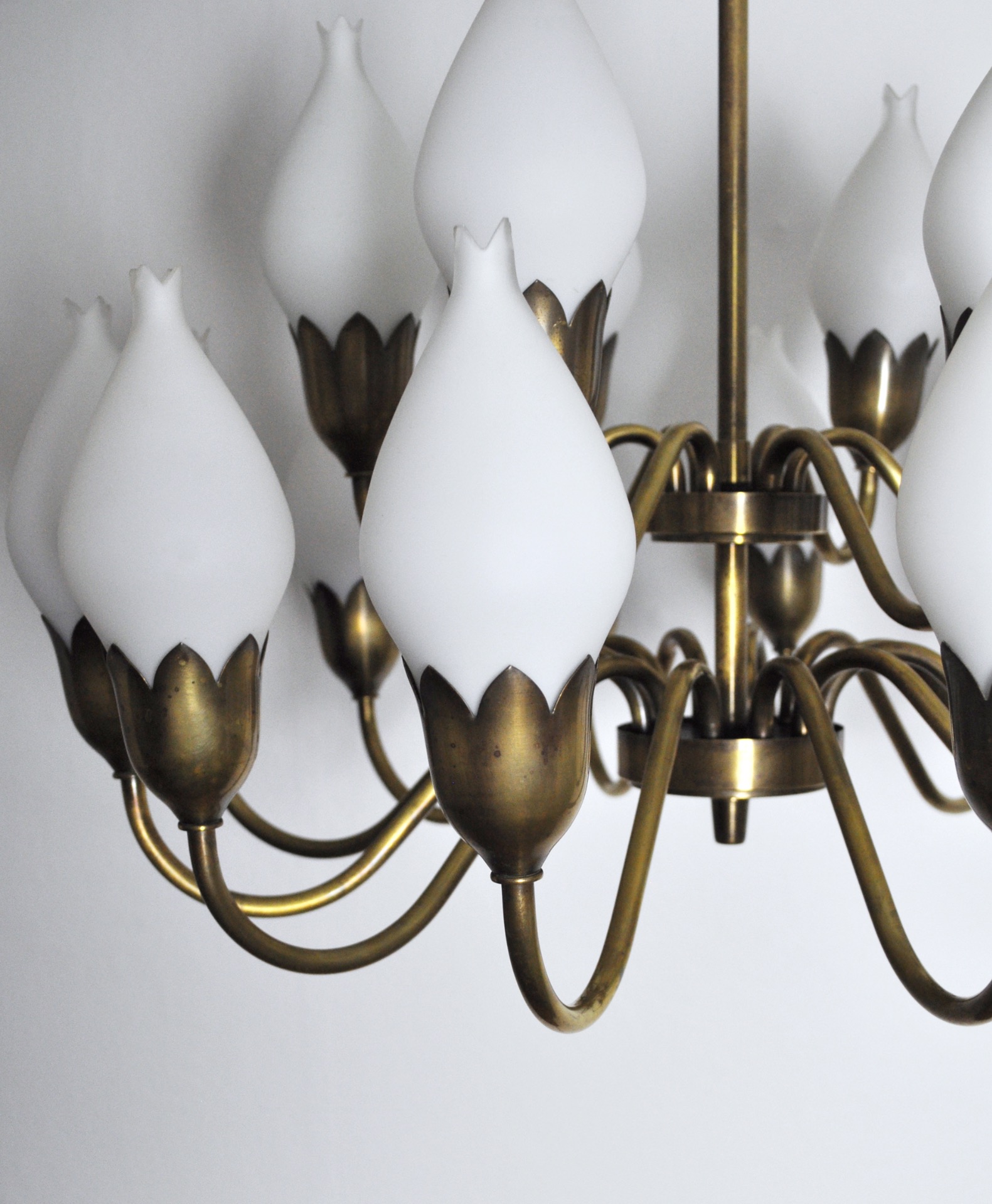FOG & MØRUP 18-ARM BRASS AND OPALINE GLASS TULIP CHANDELIER