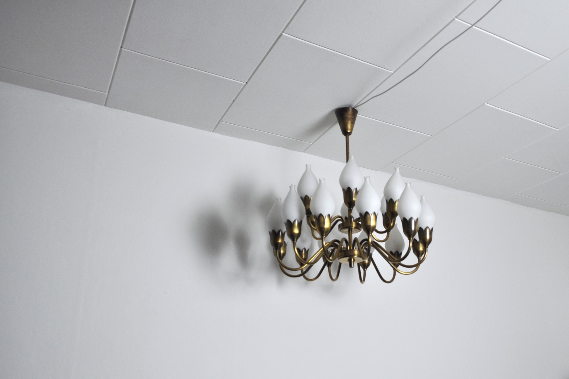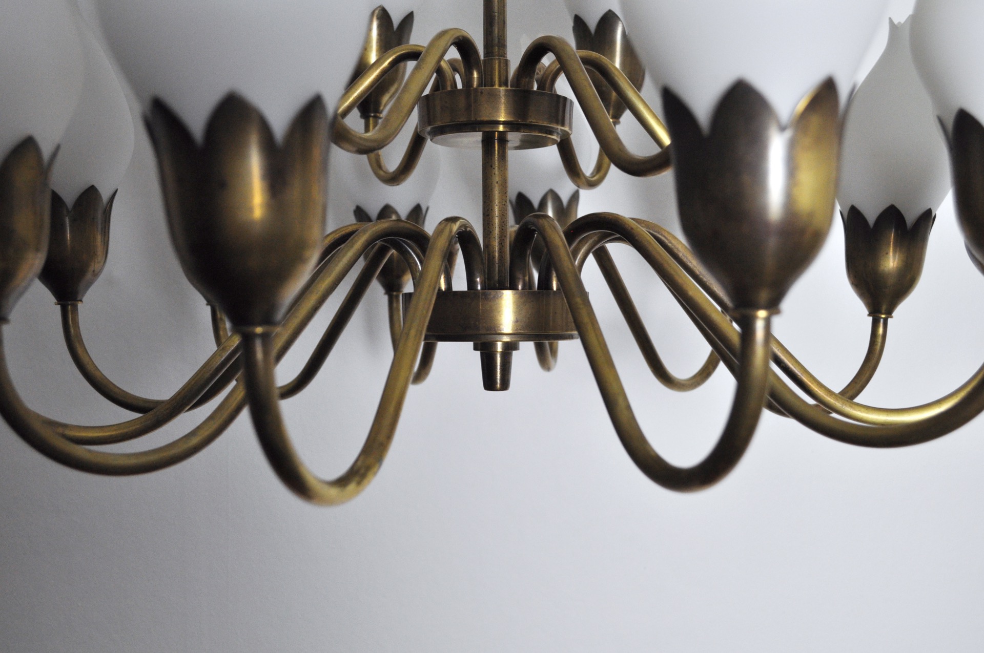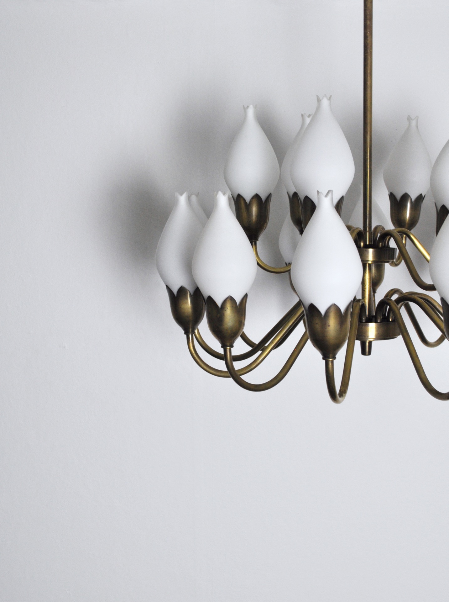 Produced by Fog & Mørup in Denmark. Frame and 18 arms in brass, mouth-blown tulip shaped white opaline glass shades.
