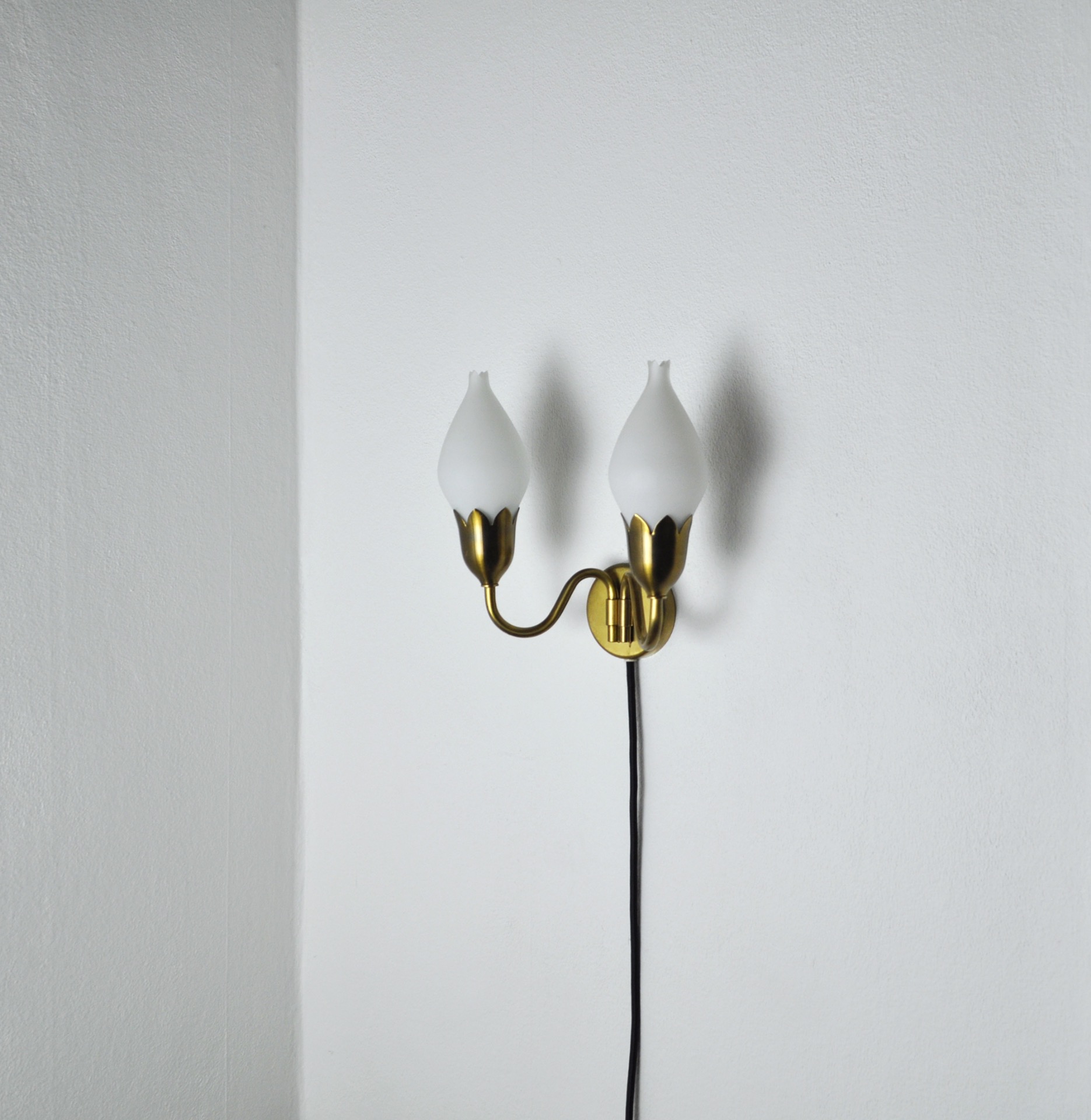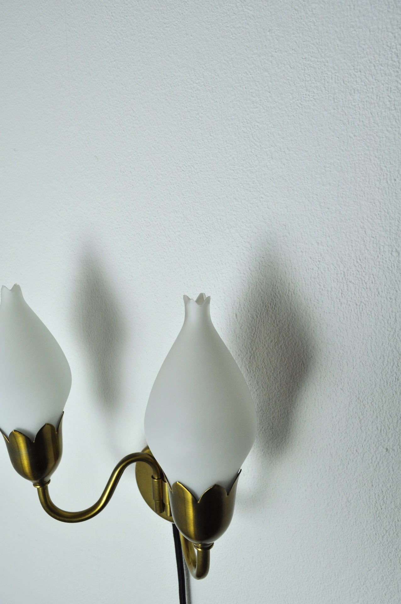 Produced by Fog & Mørup in Denmark. Frame and 2 arms in brass, mouth-blown tulip shaped white opaline glass shades.