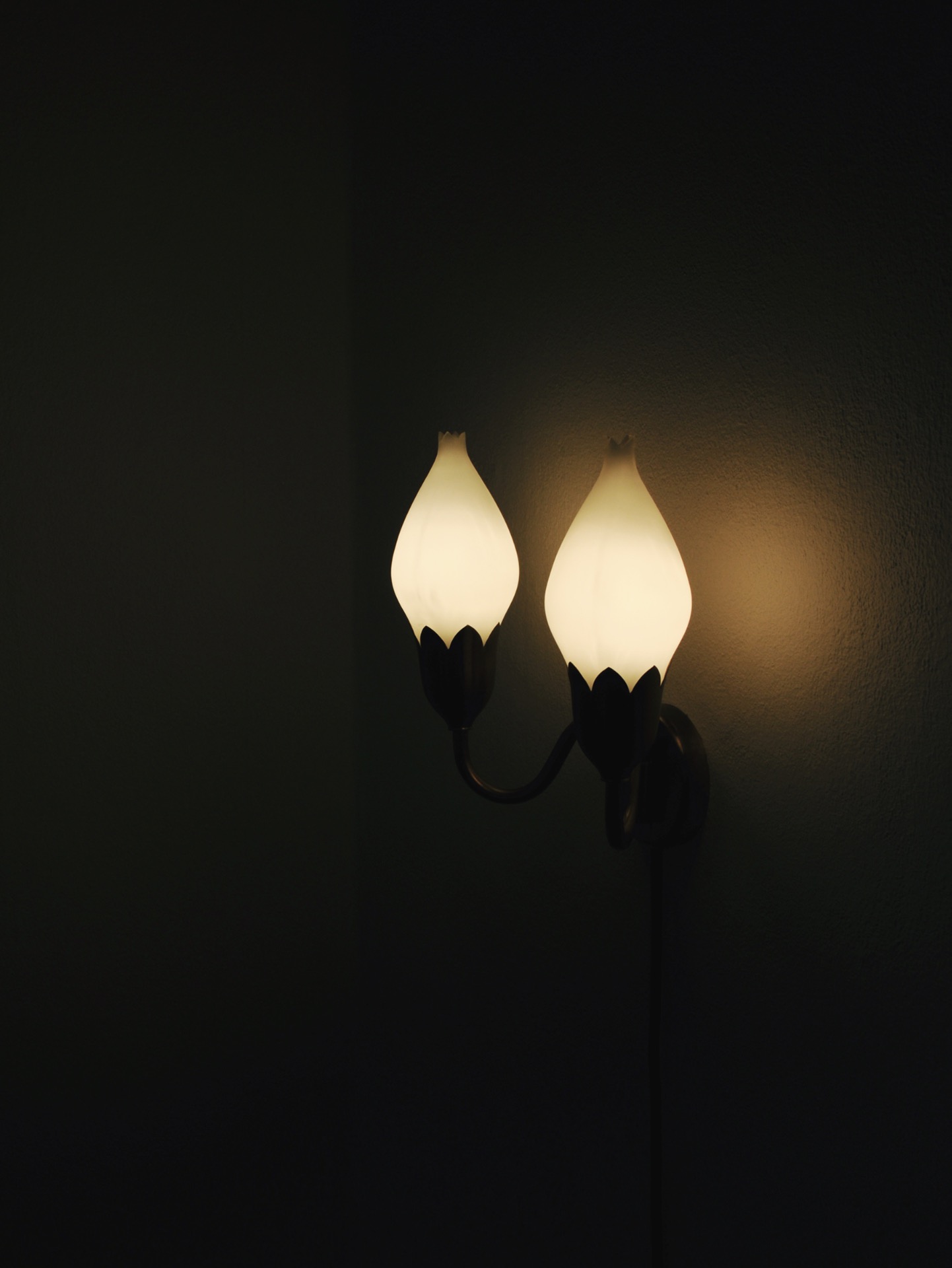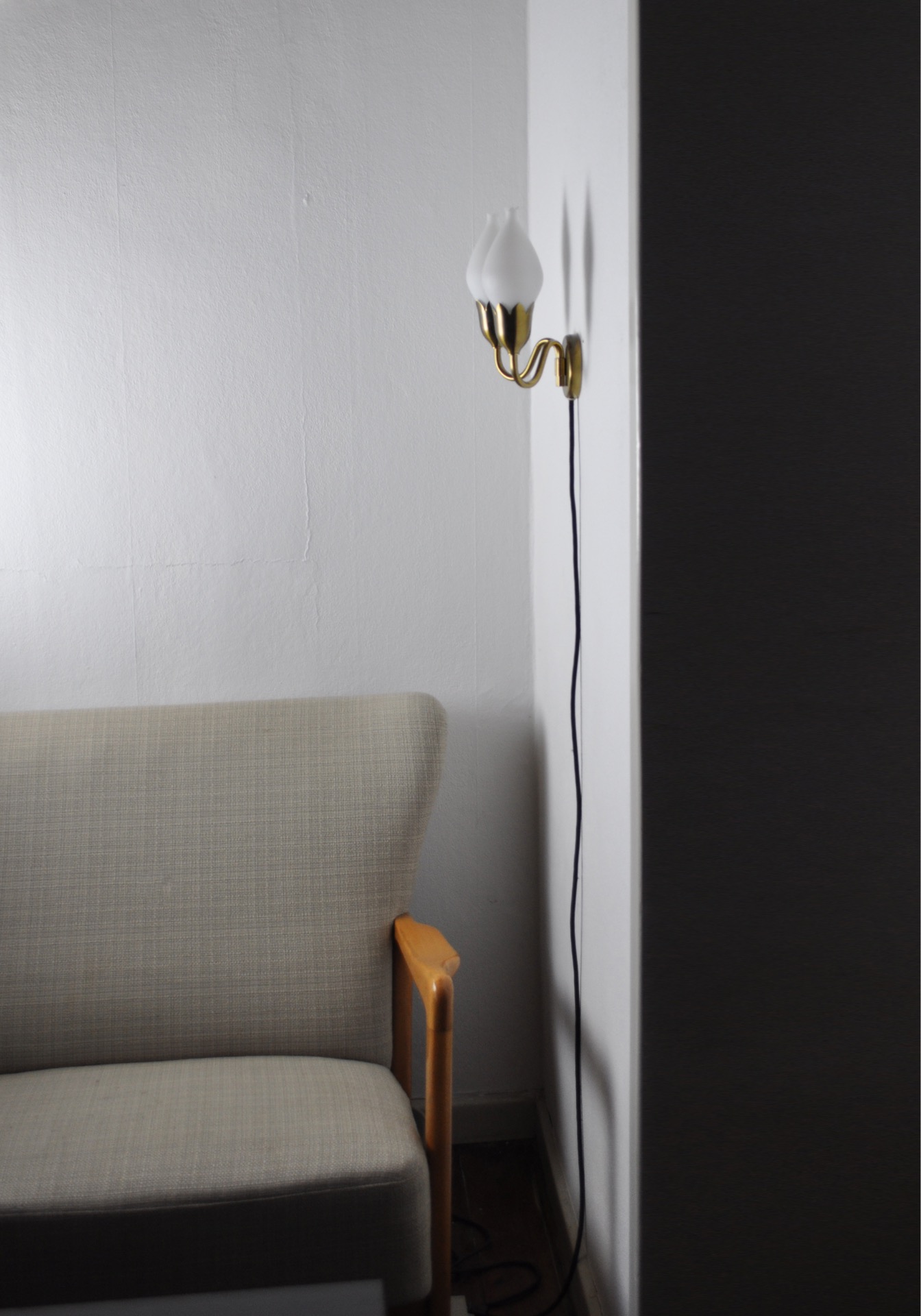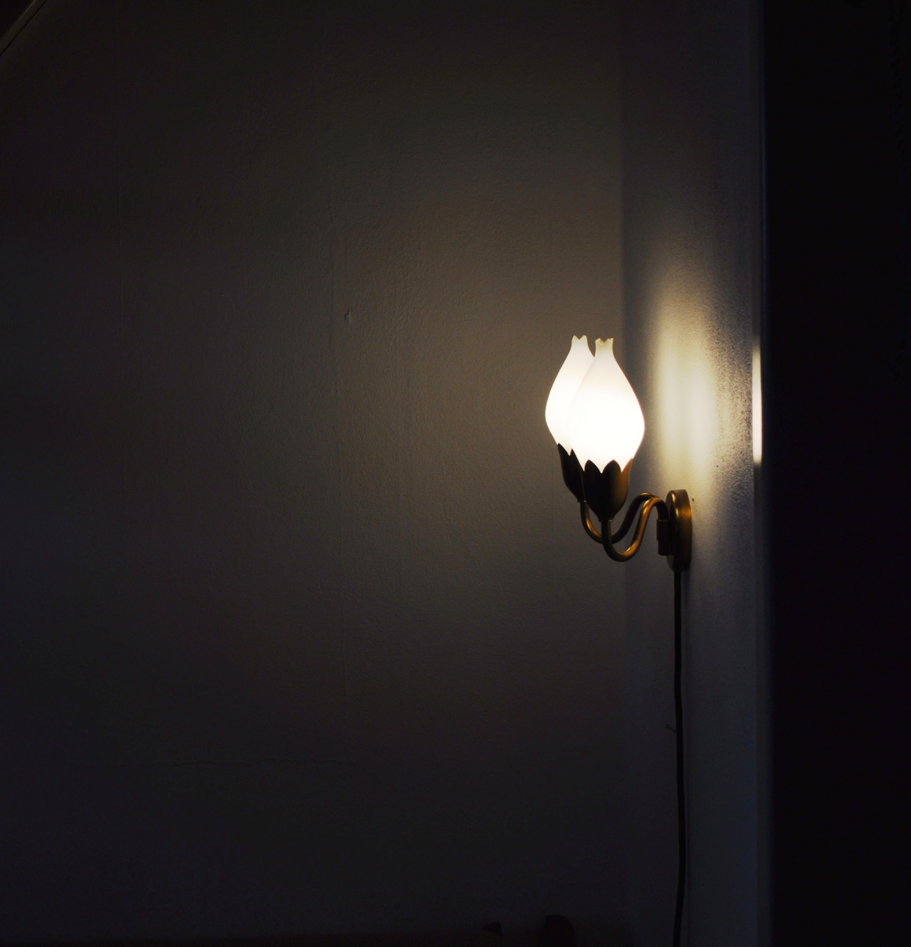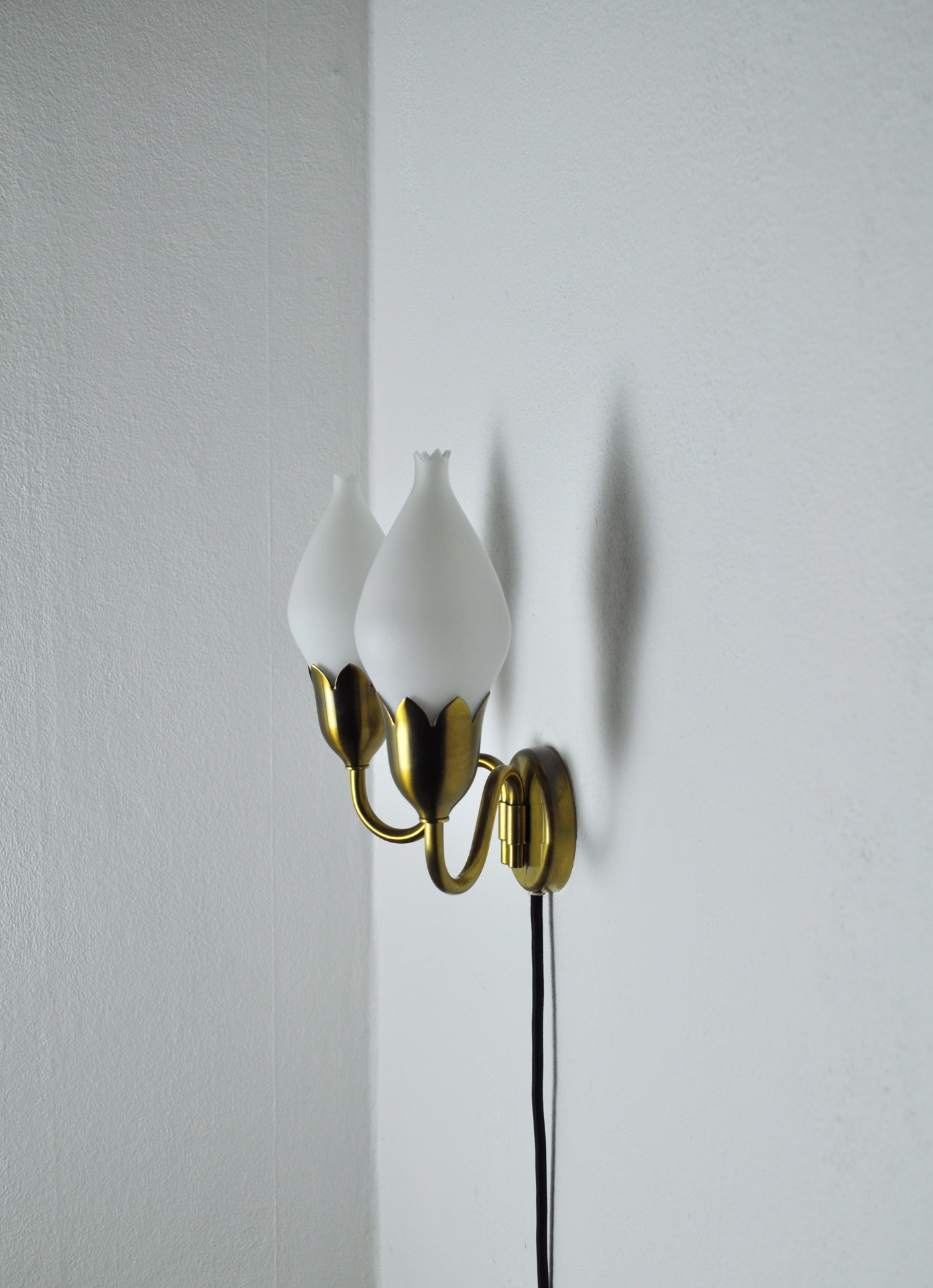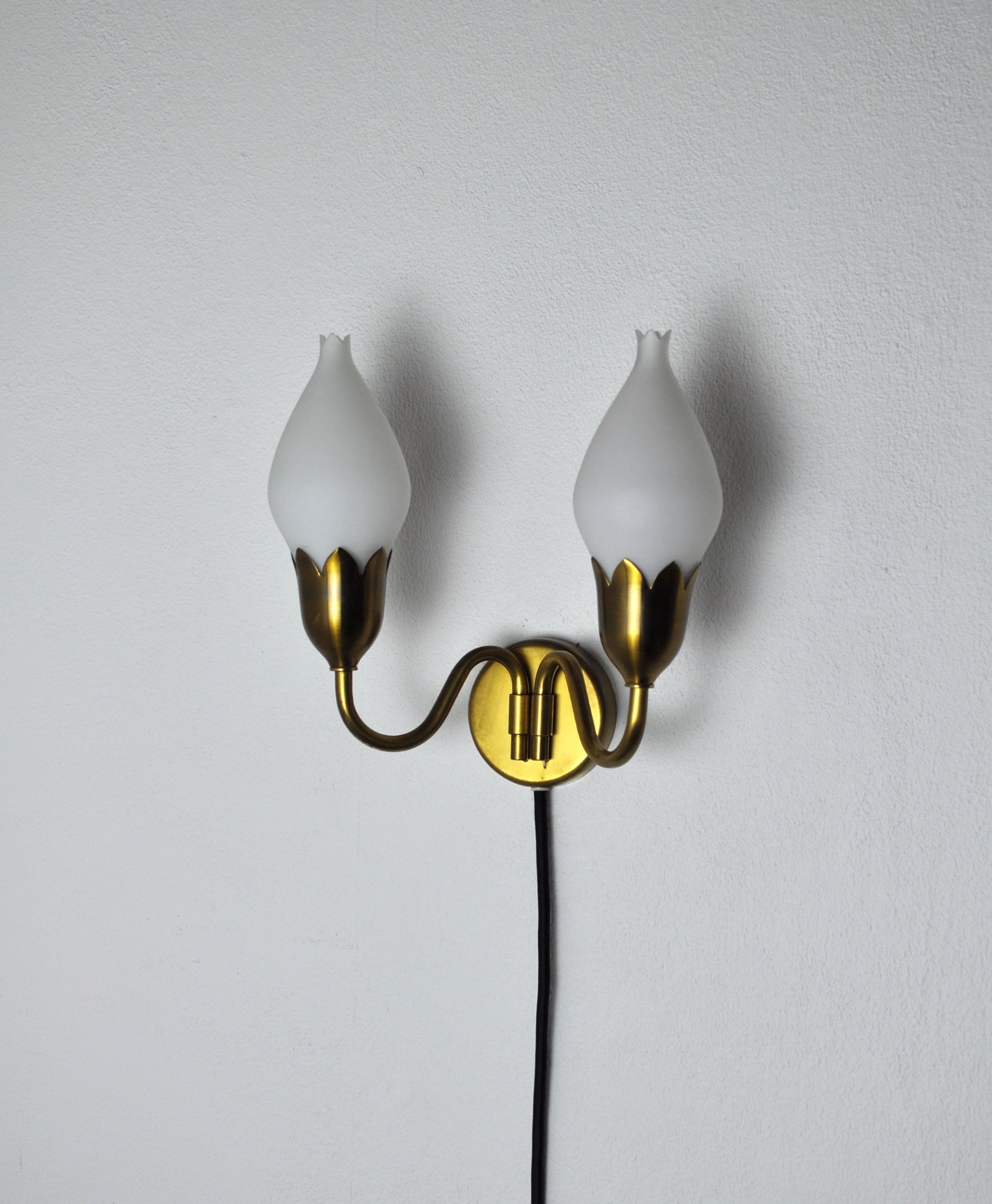 FOG & MØRUP 2-ARM BRASS AND OPALINE GLASS TULIP WALL LAMP