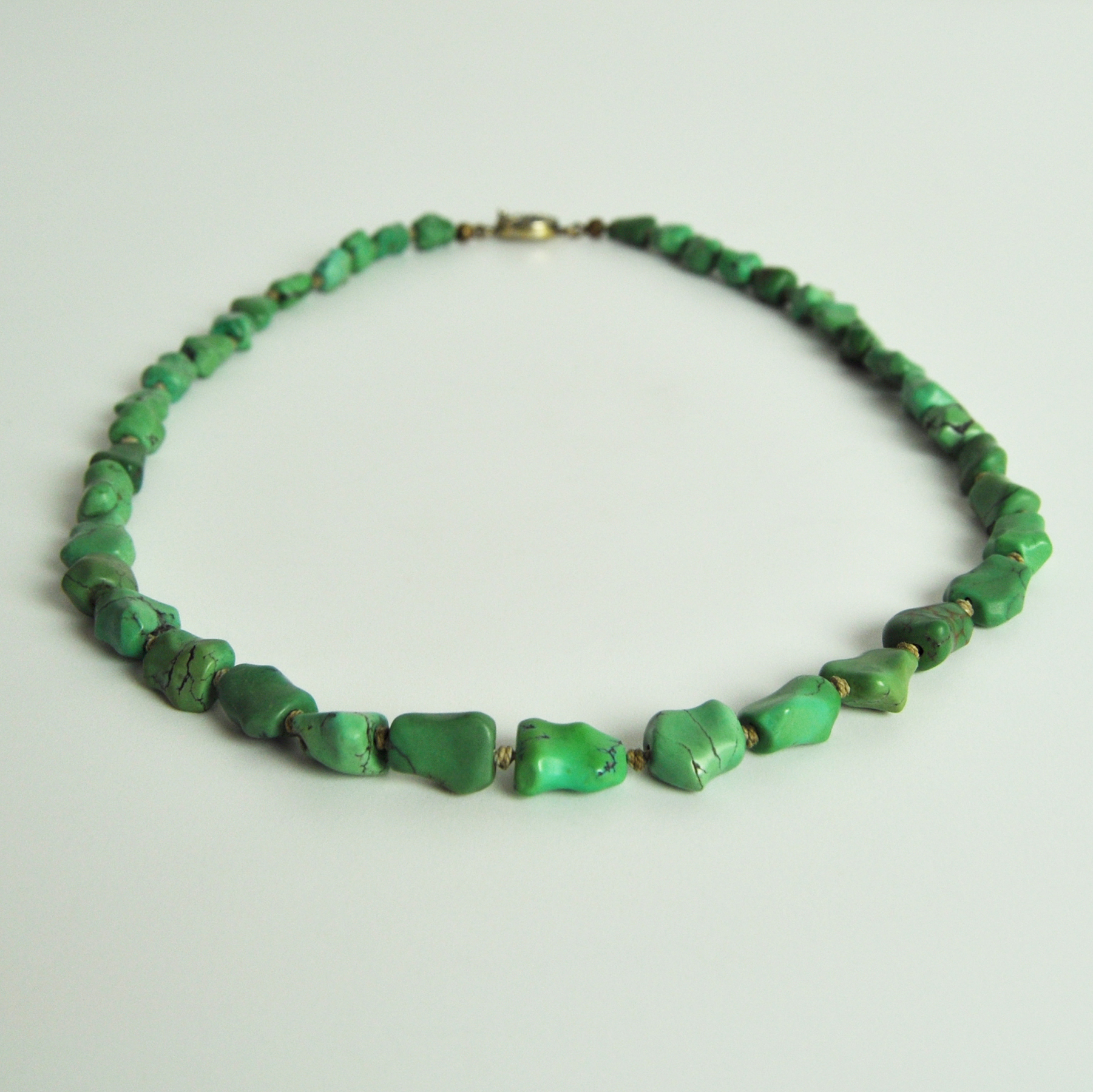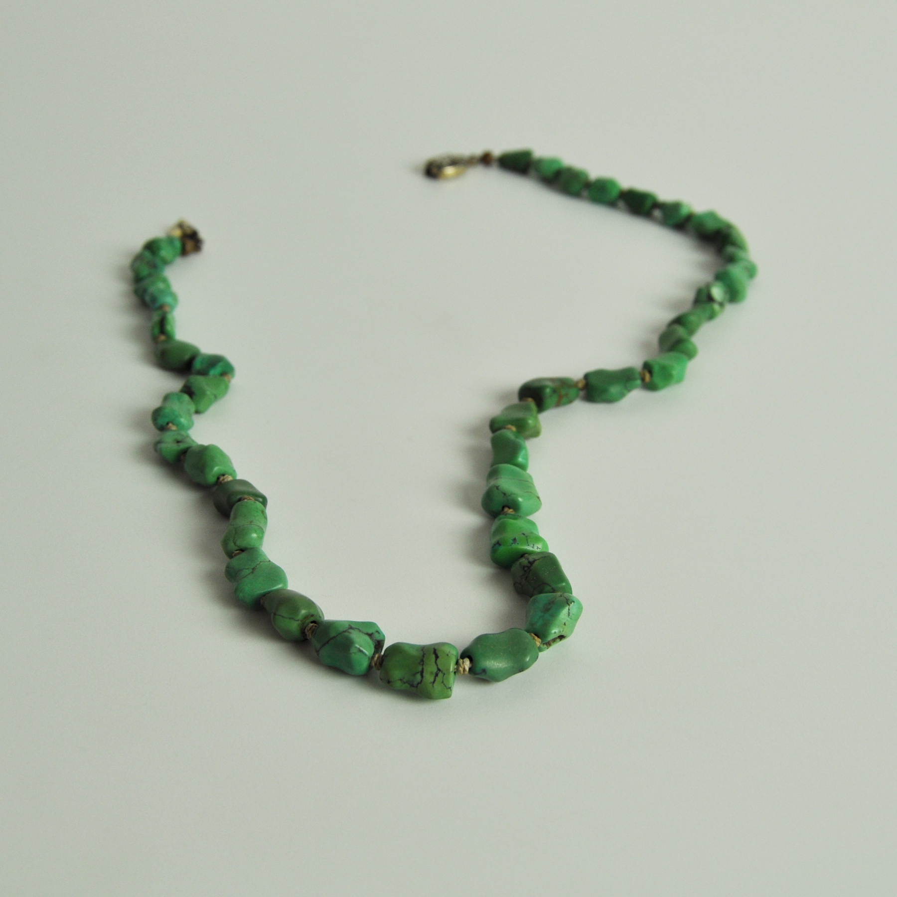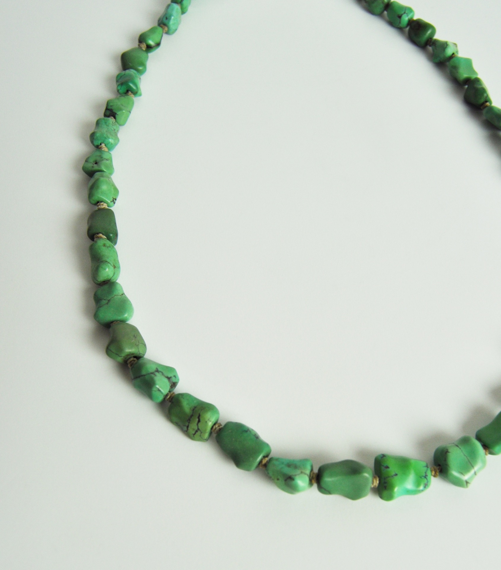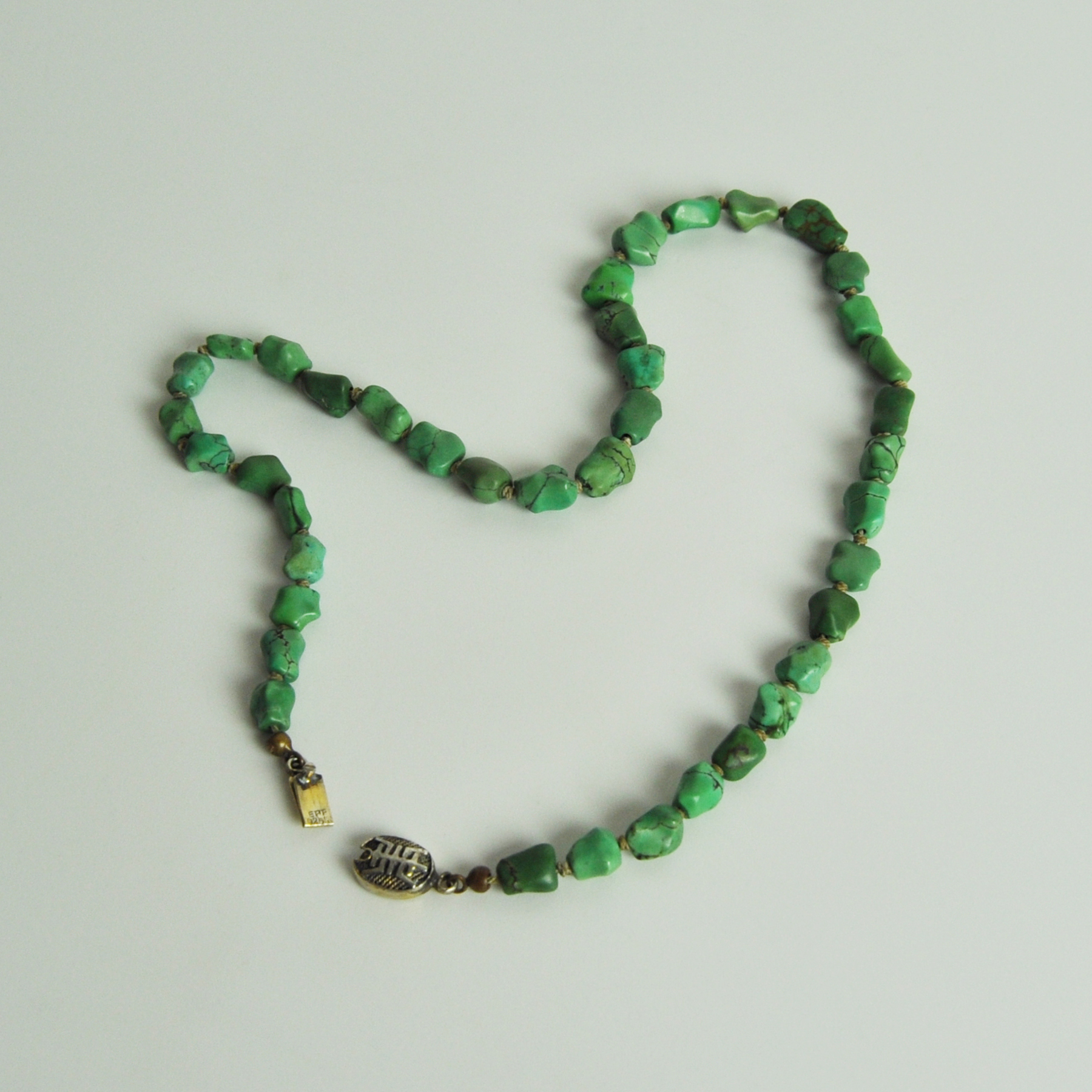 The uniform turquoises are strung on a strong silk cord with knots between the stones The chain is held together by a beautiful filigree clasp.