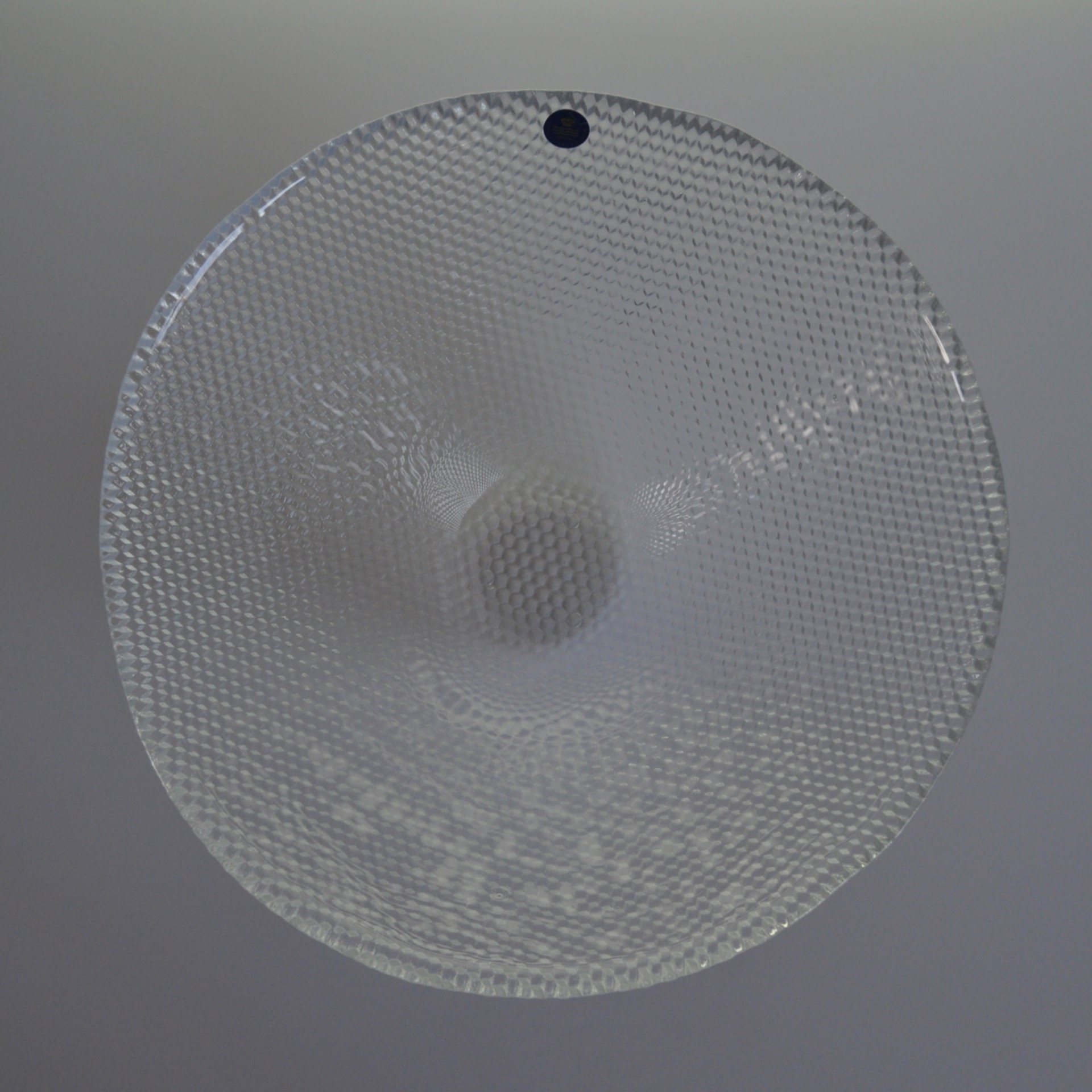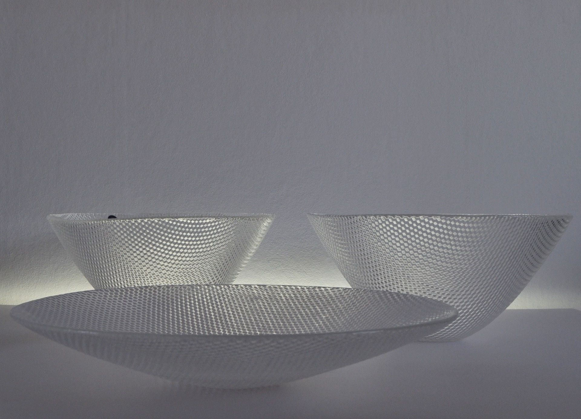Trigona is series of centrifuged clear glass with smooth inner and cube patterned outer surface. The pattern is inspired by honeycomb.