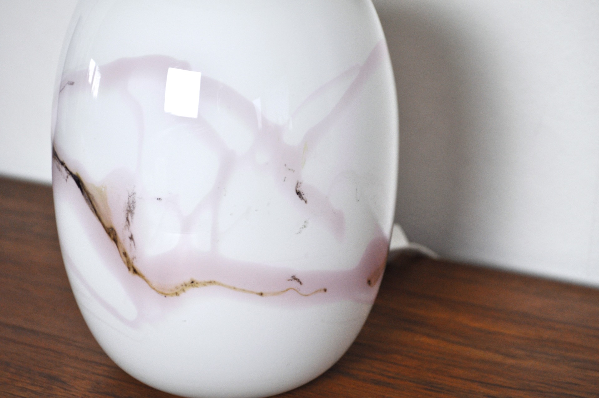 Table lamp from the series "Sakura". Sphere shape in opal white glass with pink and olive green flames. Brushed nickel rod.