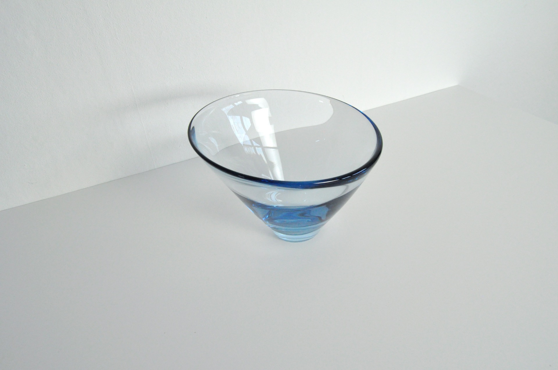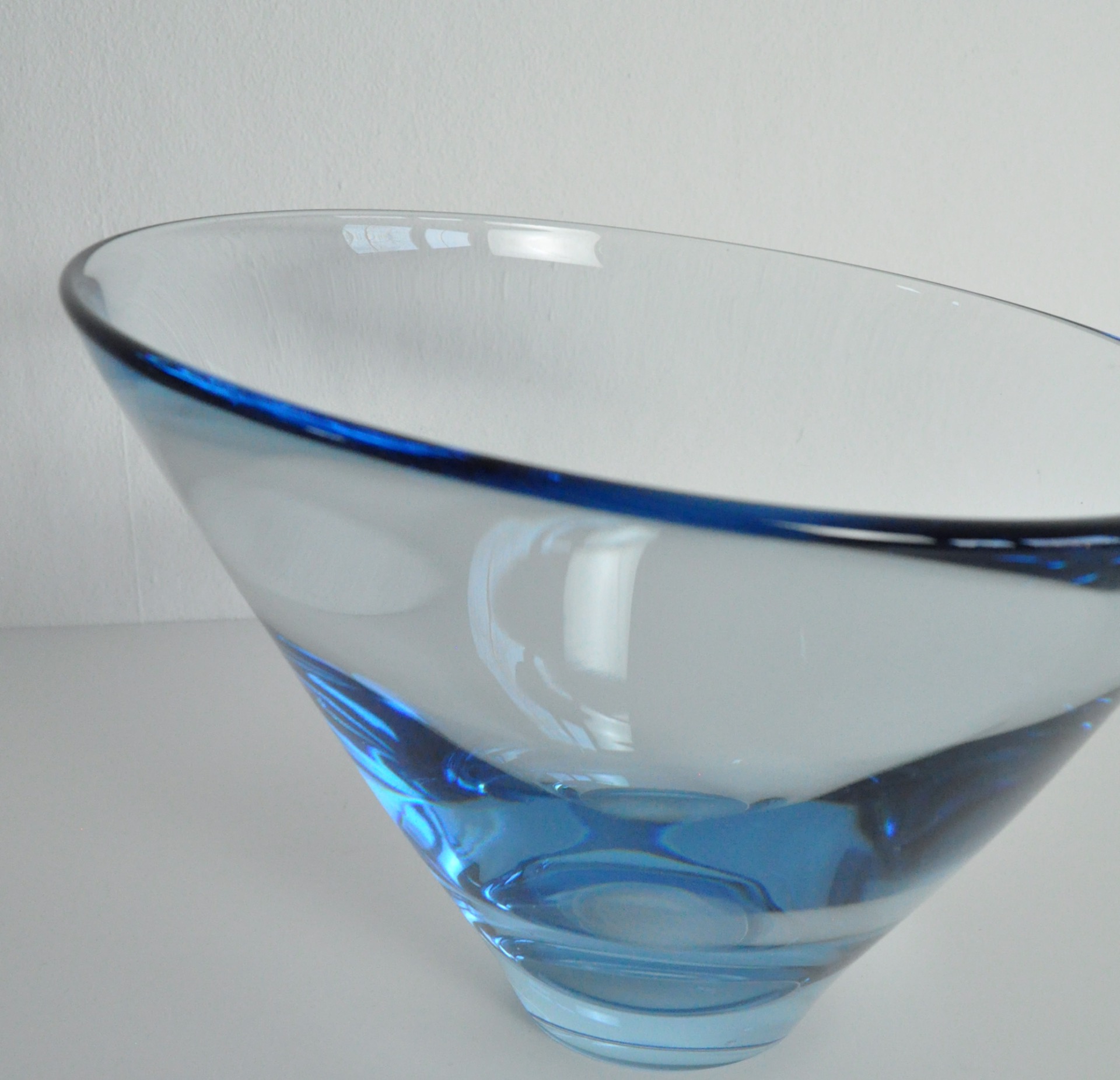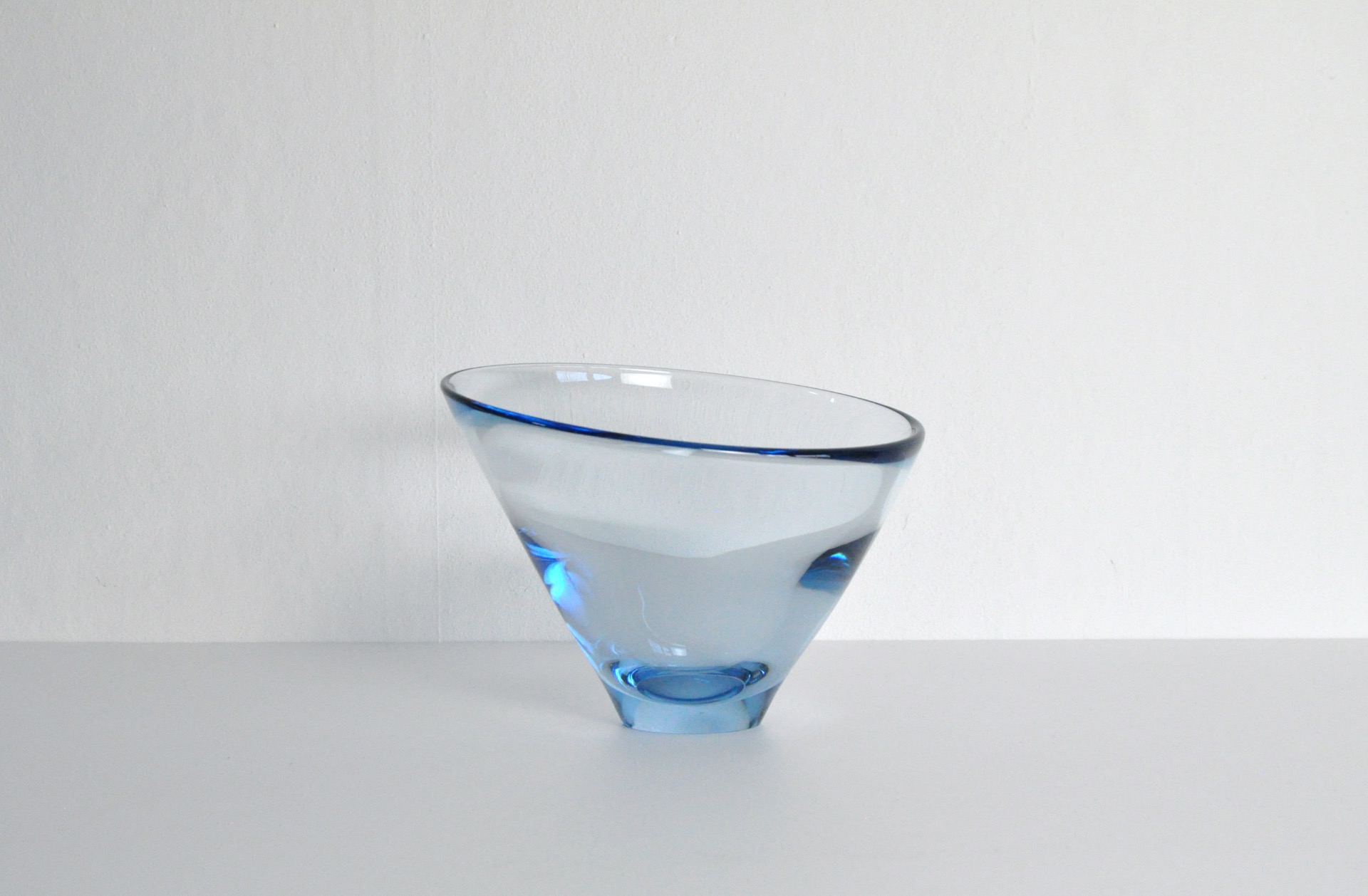 Hand blown Aqua blue "Thule" glass bowl. The shape is conical with the leading edge lower than the back edge. The piece is signed Holmegaard PL 16749.
