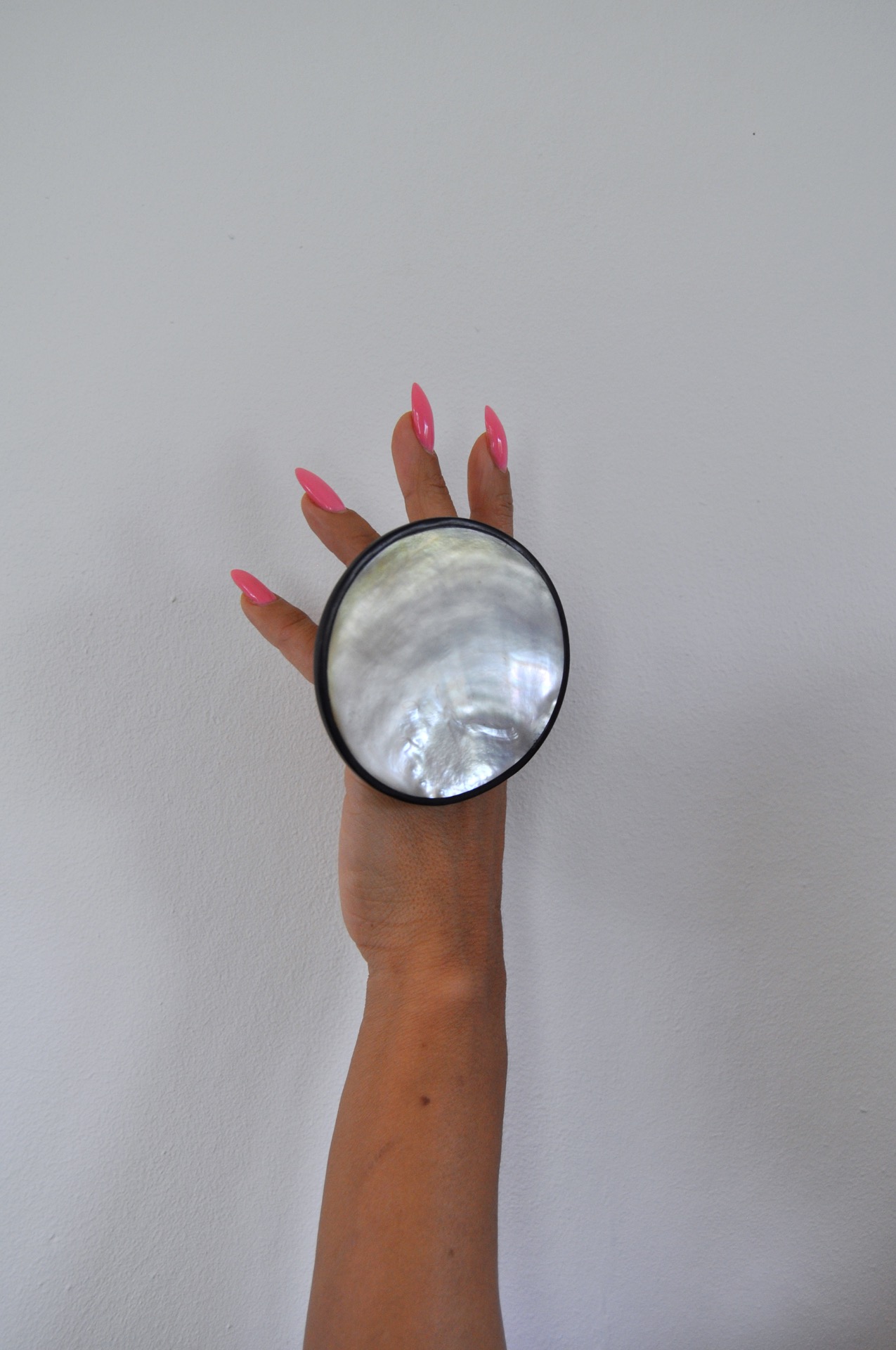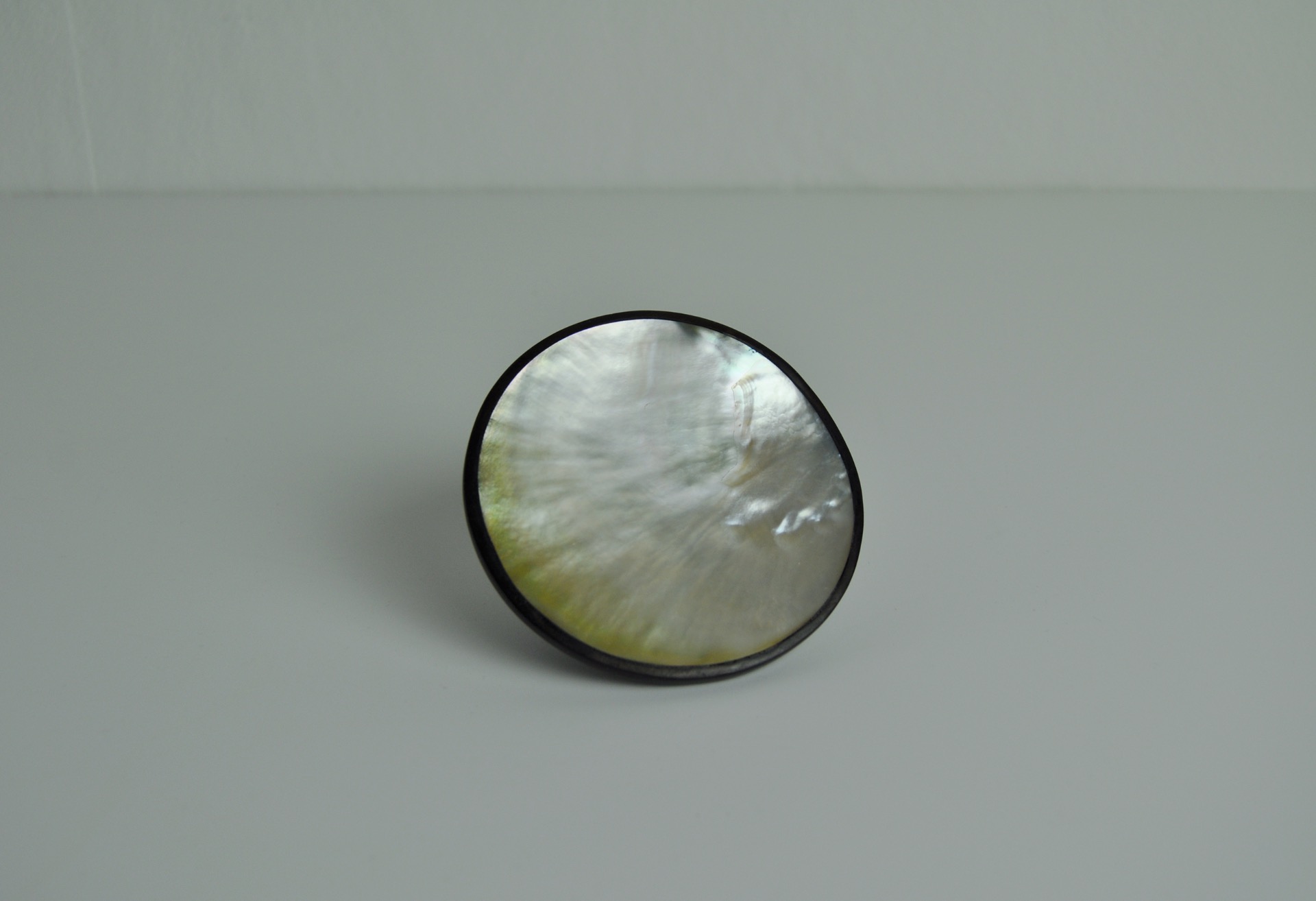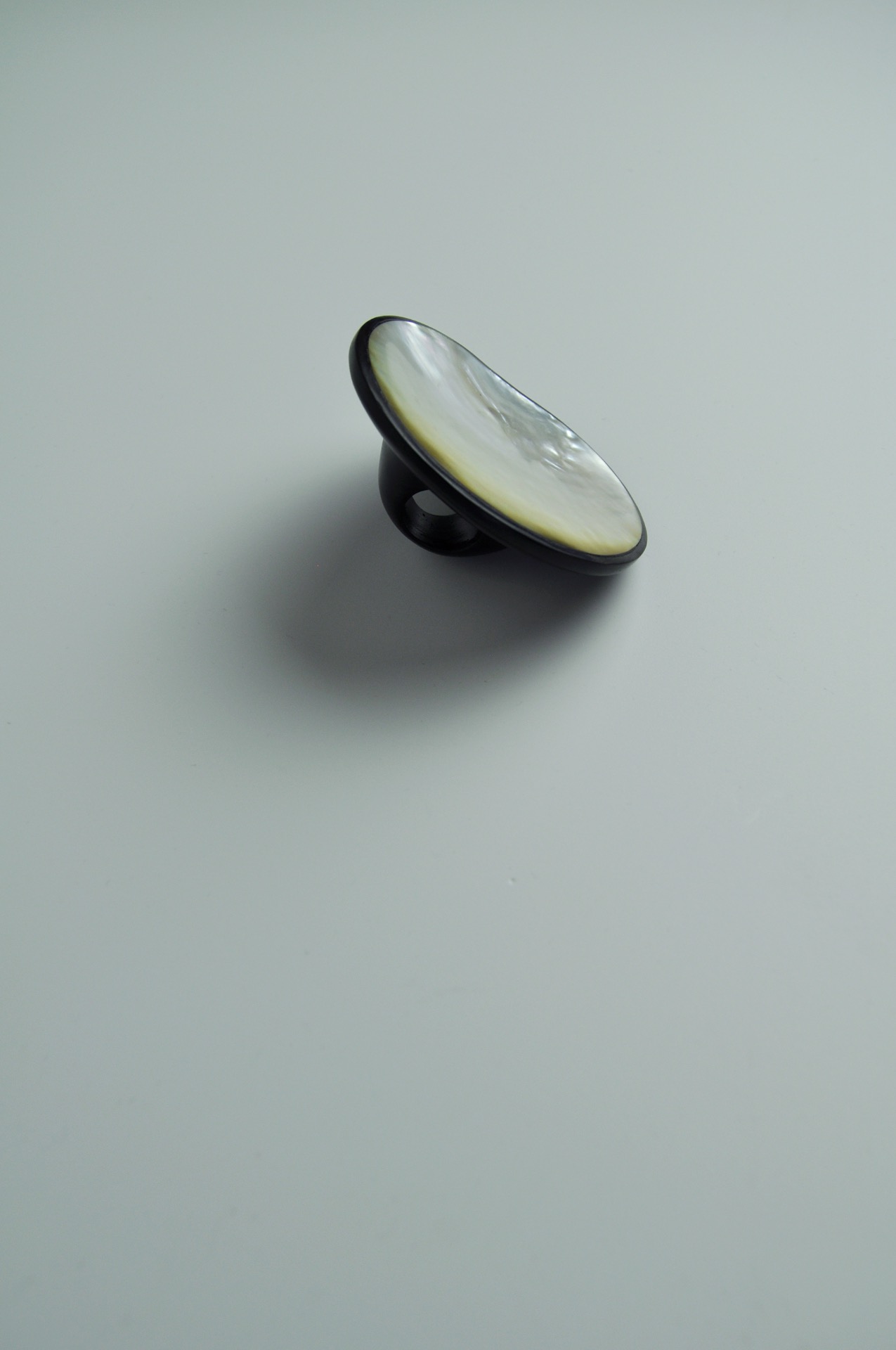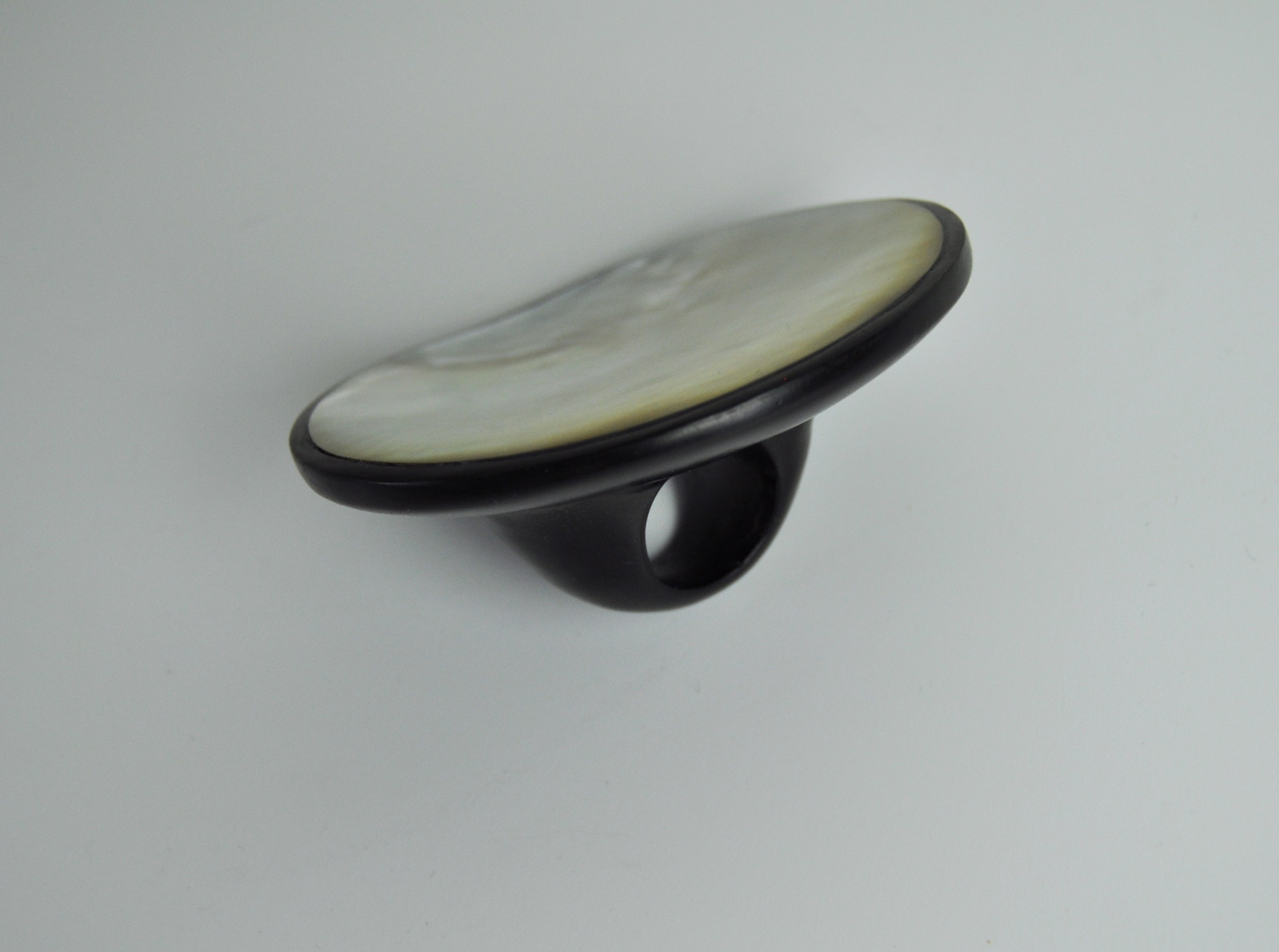 MONIES LARGE SCULPTUREL BLANCK RING MADE IN EBONY MOTHER OF PEARL, DENMARK