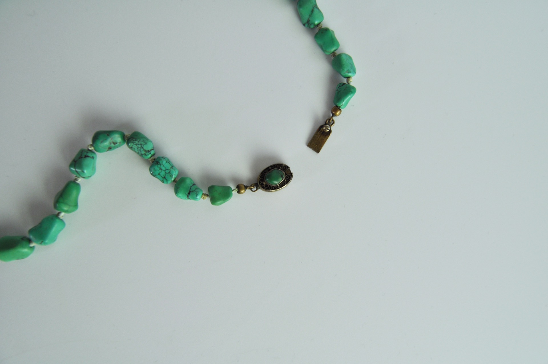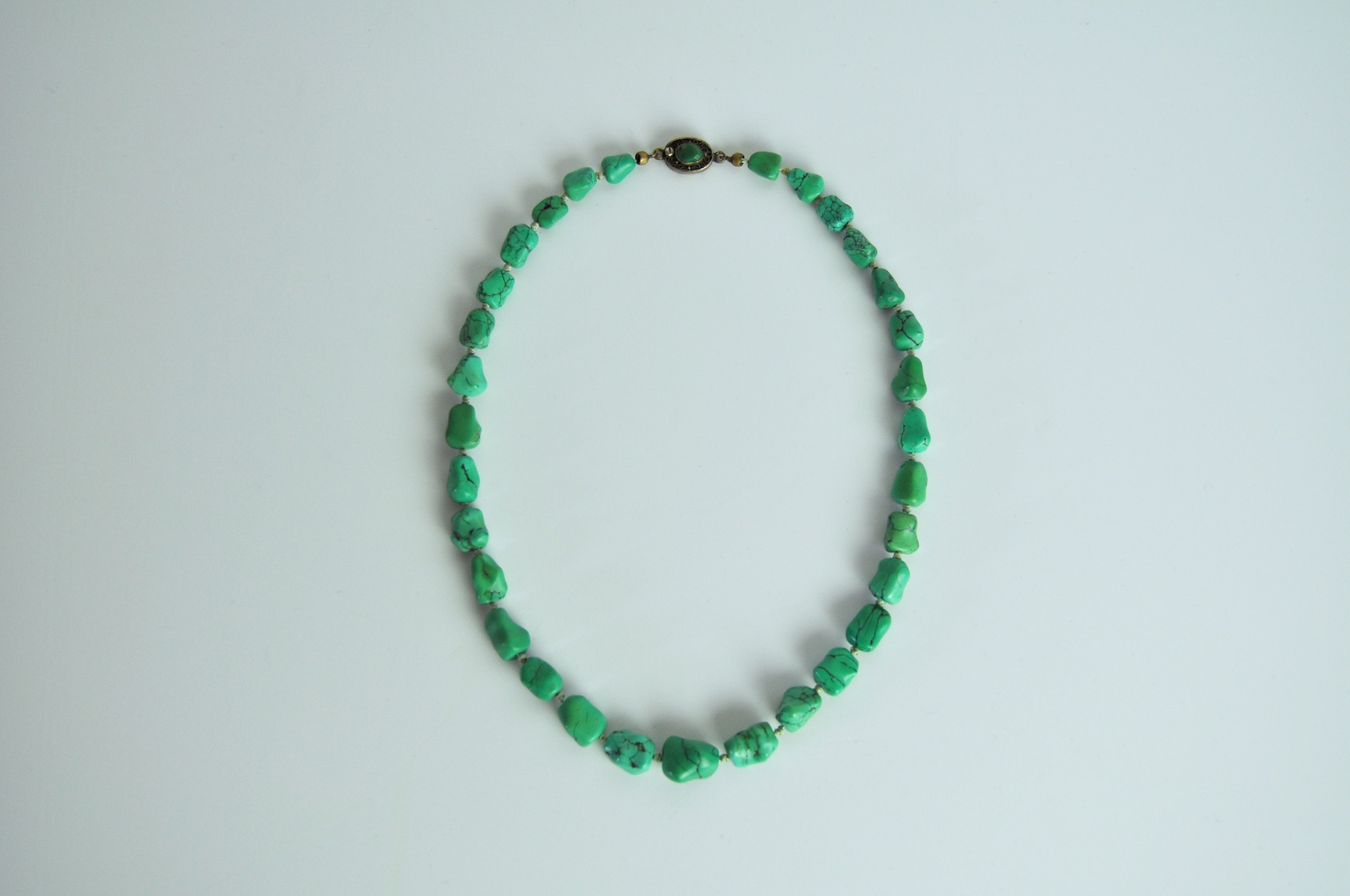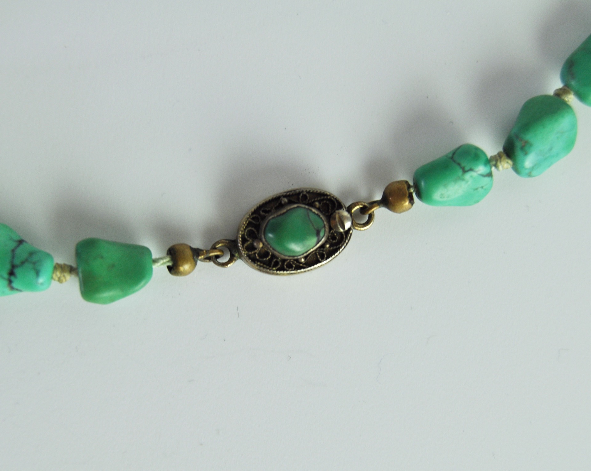 The uniform turquoises are strung on a strong silk cord with knots between the stones The chain is held together by a beautiful filigree clasp.