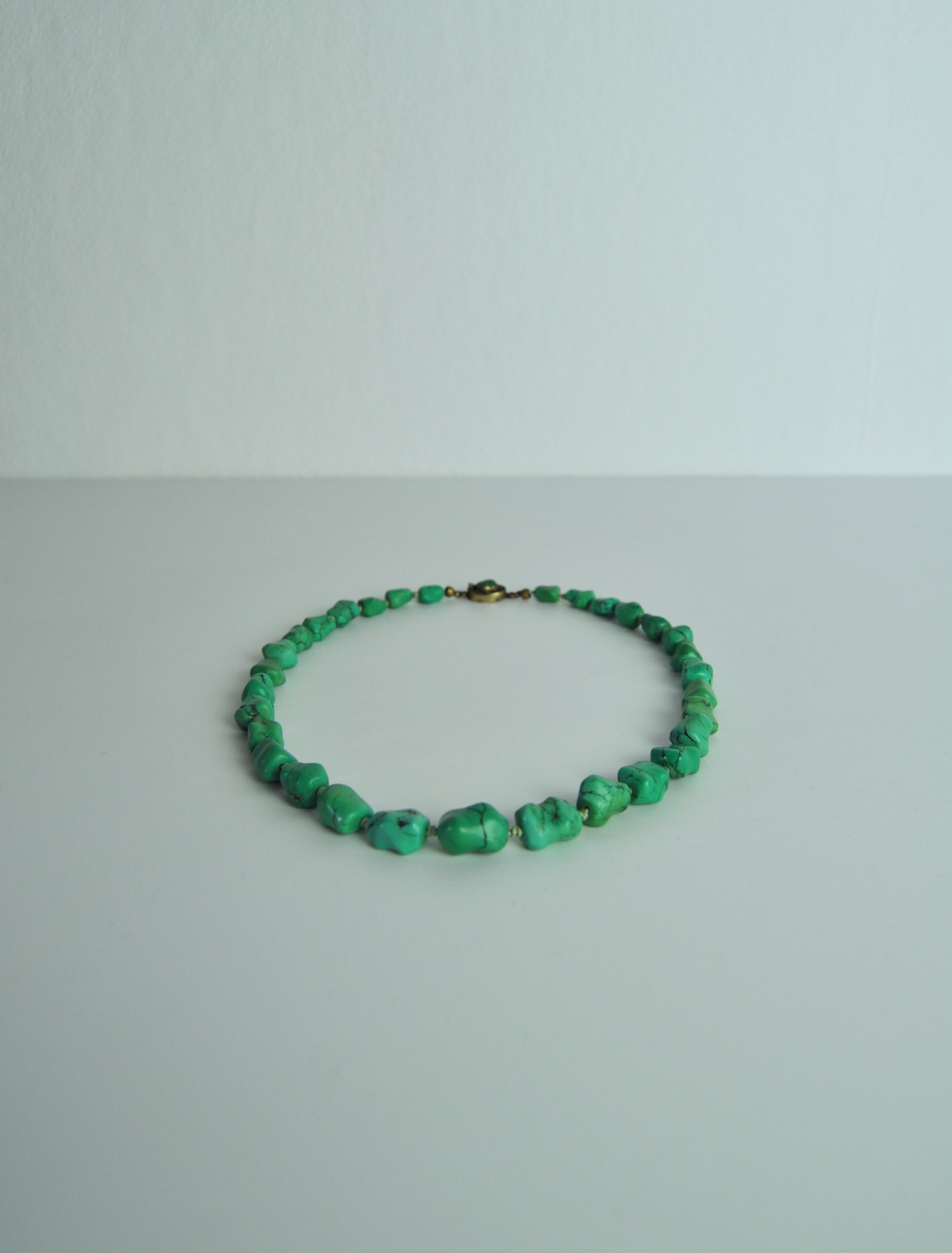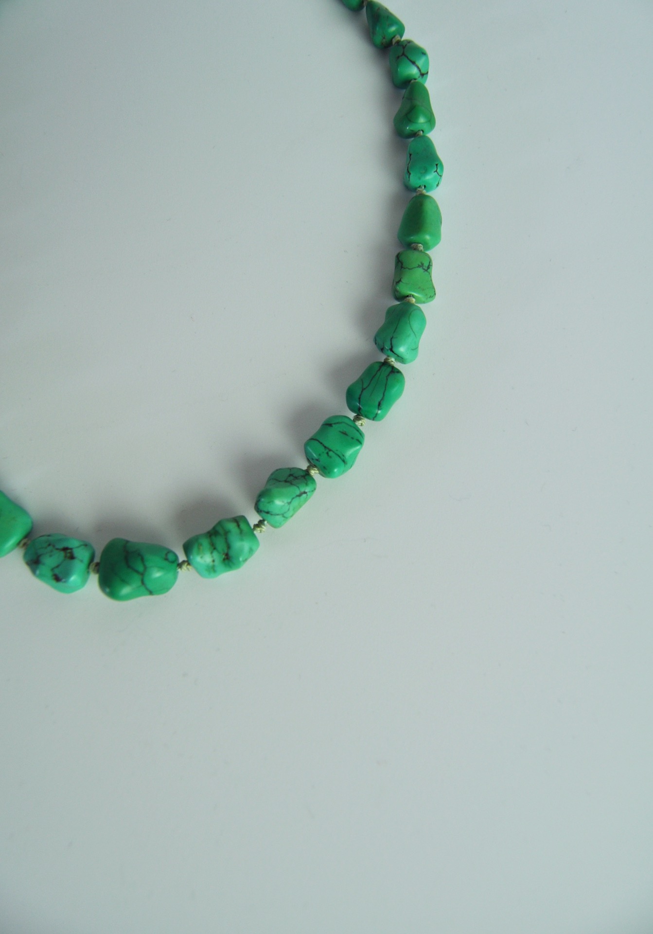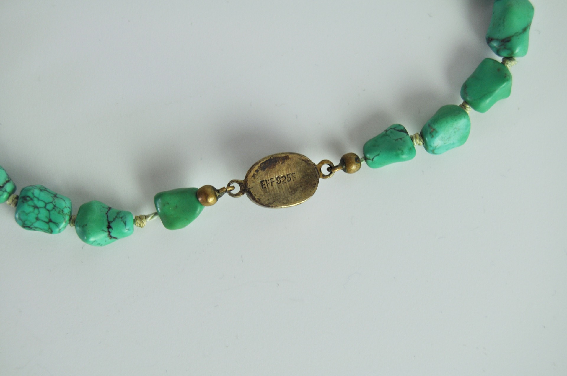 The uniform turquoises are strung on a strong silk cord with knots between the stones The chain is held together by a beautiful filigree clasp.