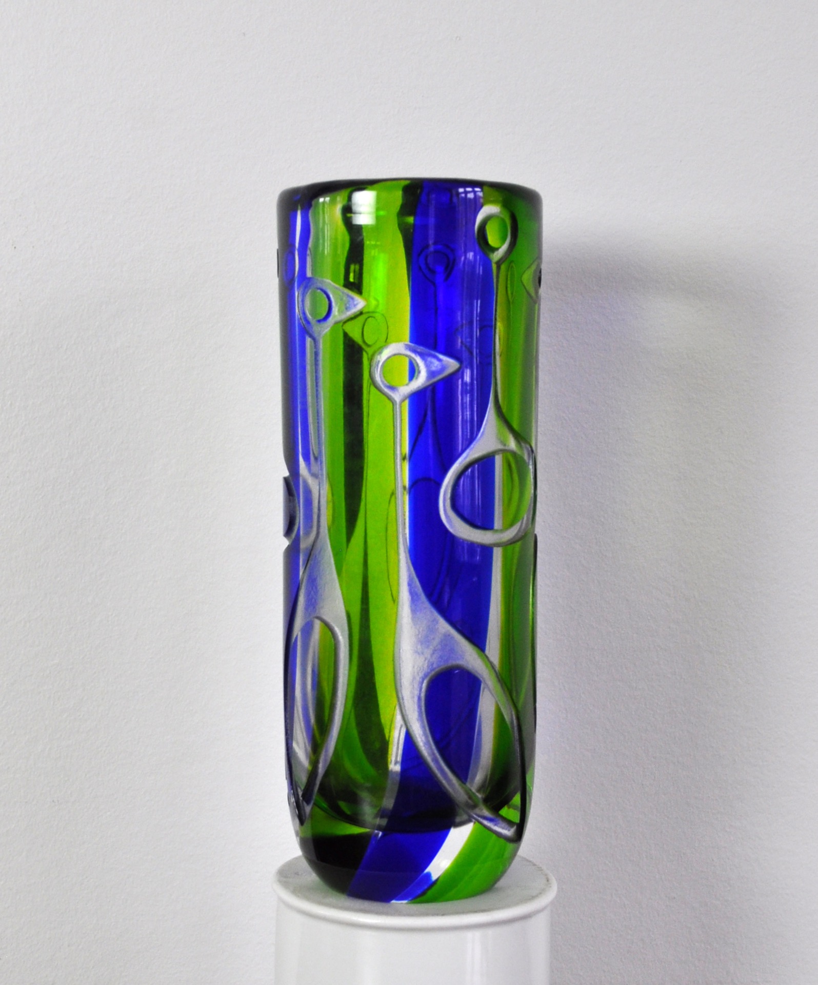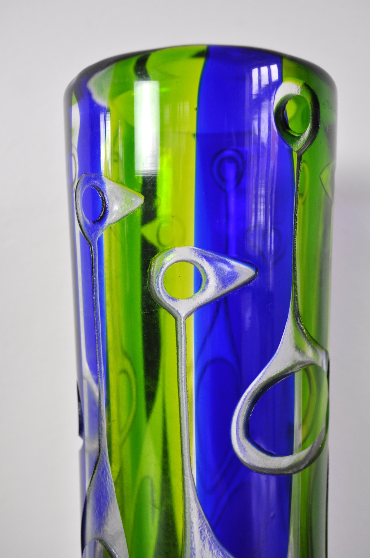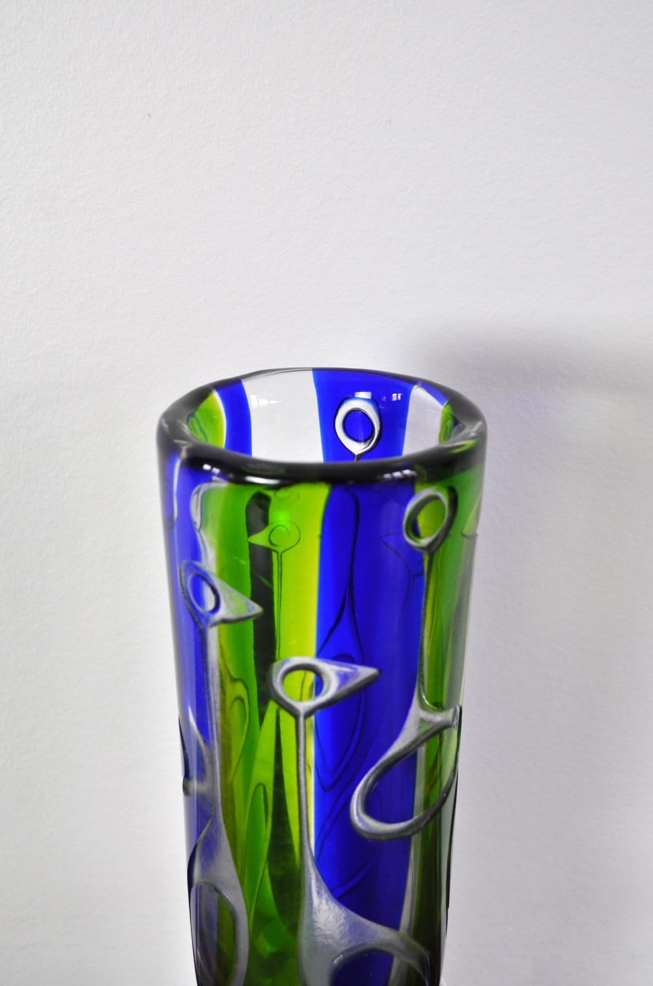Internally decorated with green and blue glass, with engraved stylized bird figures to exterior.