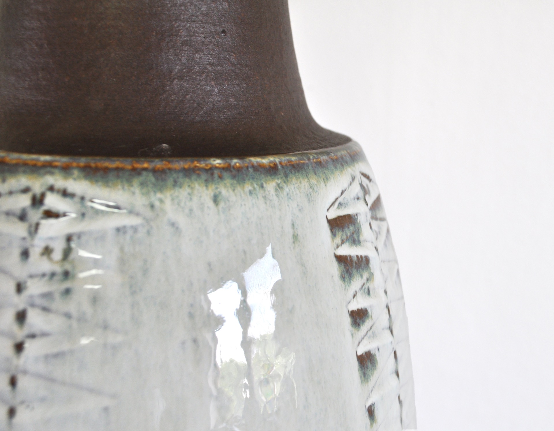 Tall table lamp made of stoneware with ceramic glazing in various tones of grey, turquis, blue and brown. Designed by Einar Johansen in 1960s for Søholm, Denmark. Signed by designer and maker. Very fine condition.