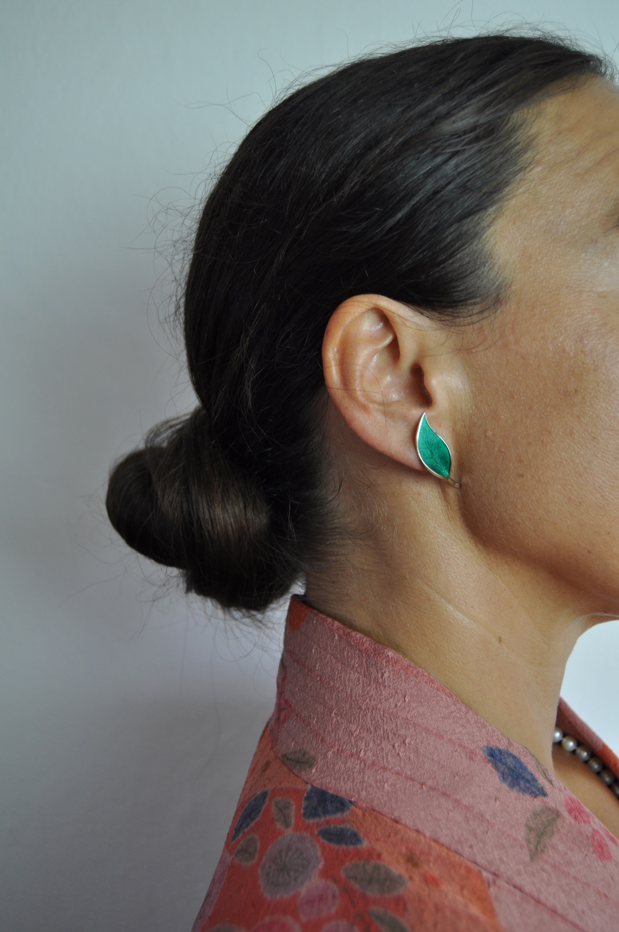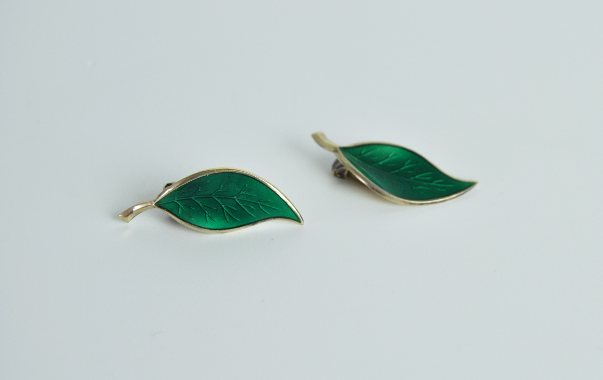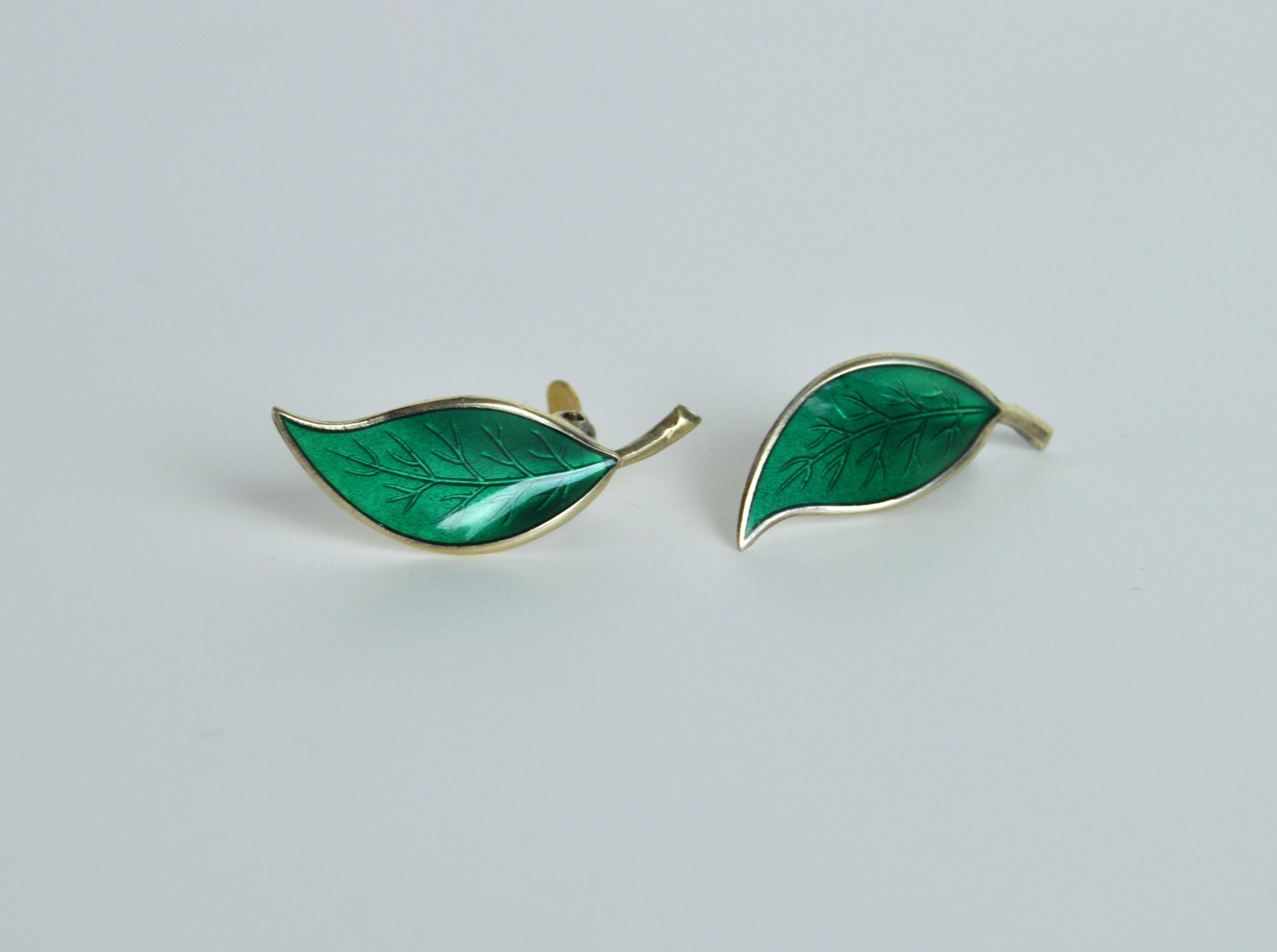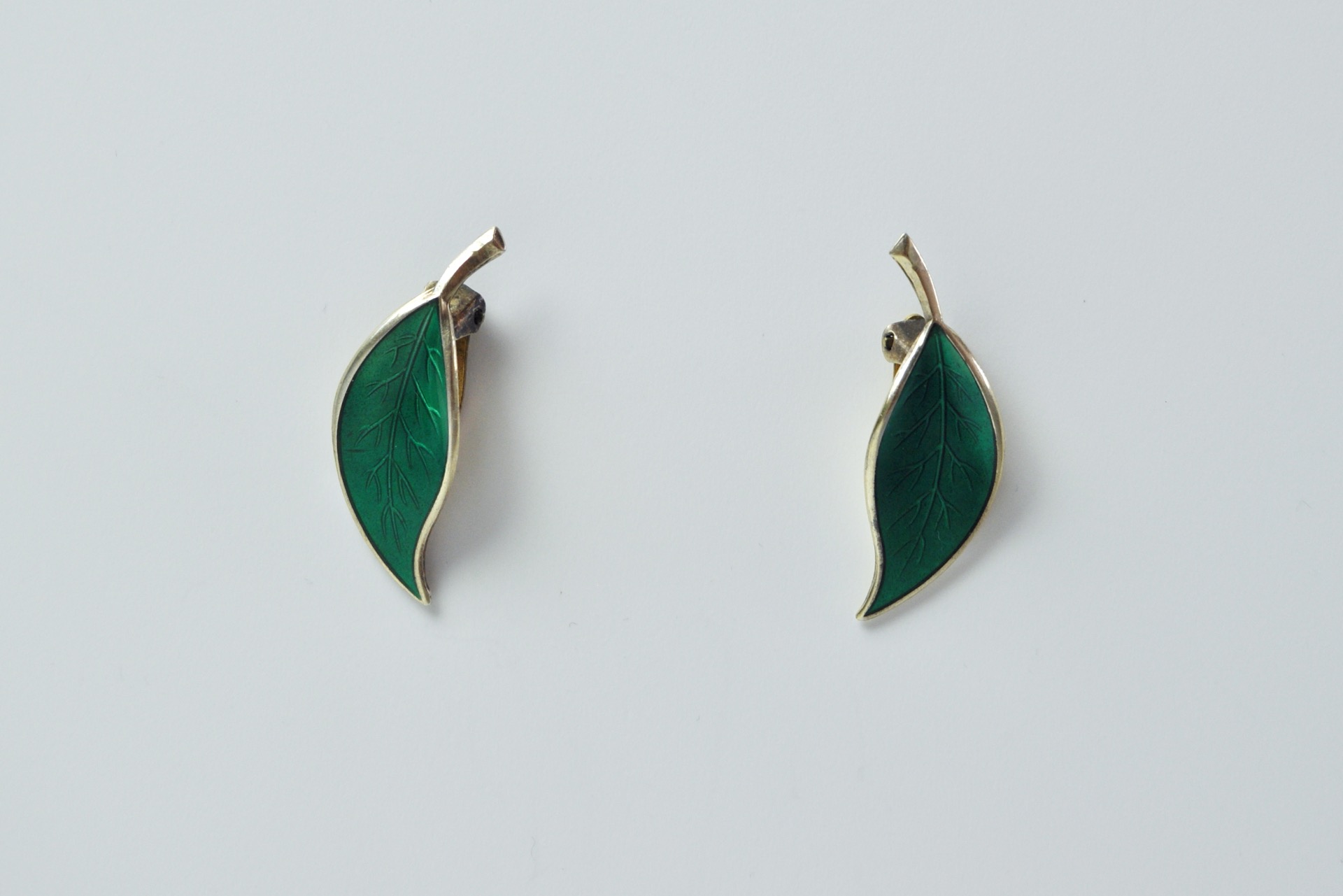 A set of Mid-century yellow enamel ear clips from the Norwegian jeweller, David Andersen. The ear clips takes the design of leafs set in solid silver and decorated with an green guilloche enamel. The enamel is complimented with gilded silver and is in an excellent condition without any flaws.