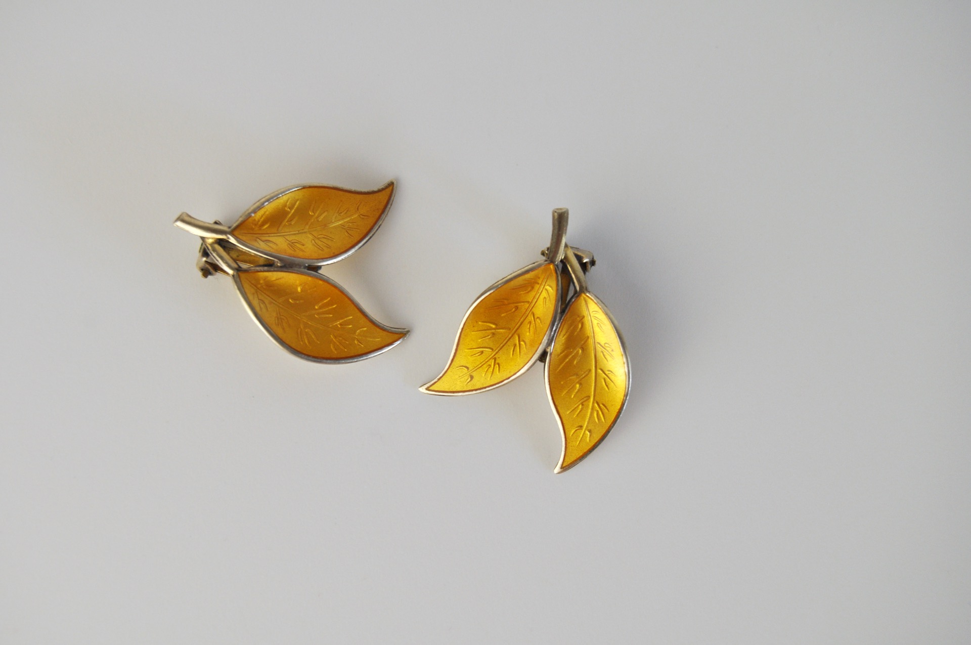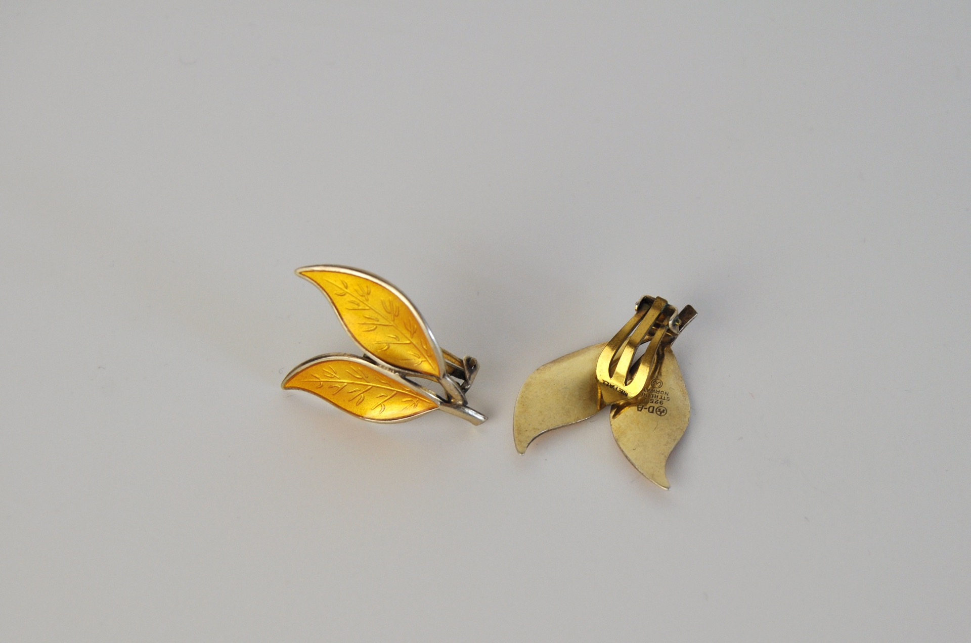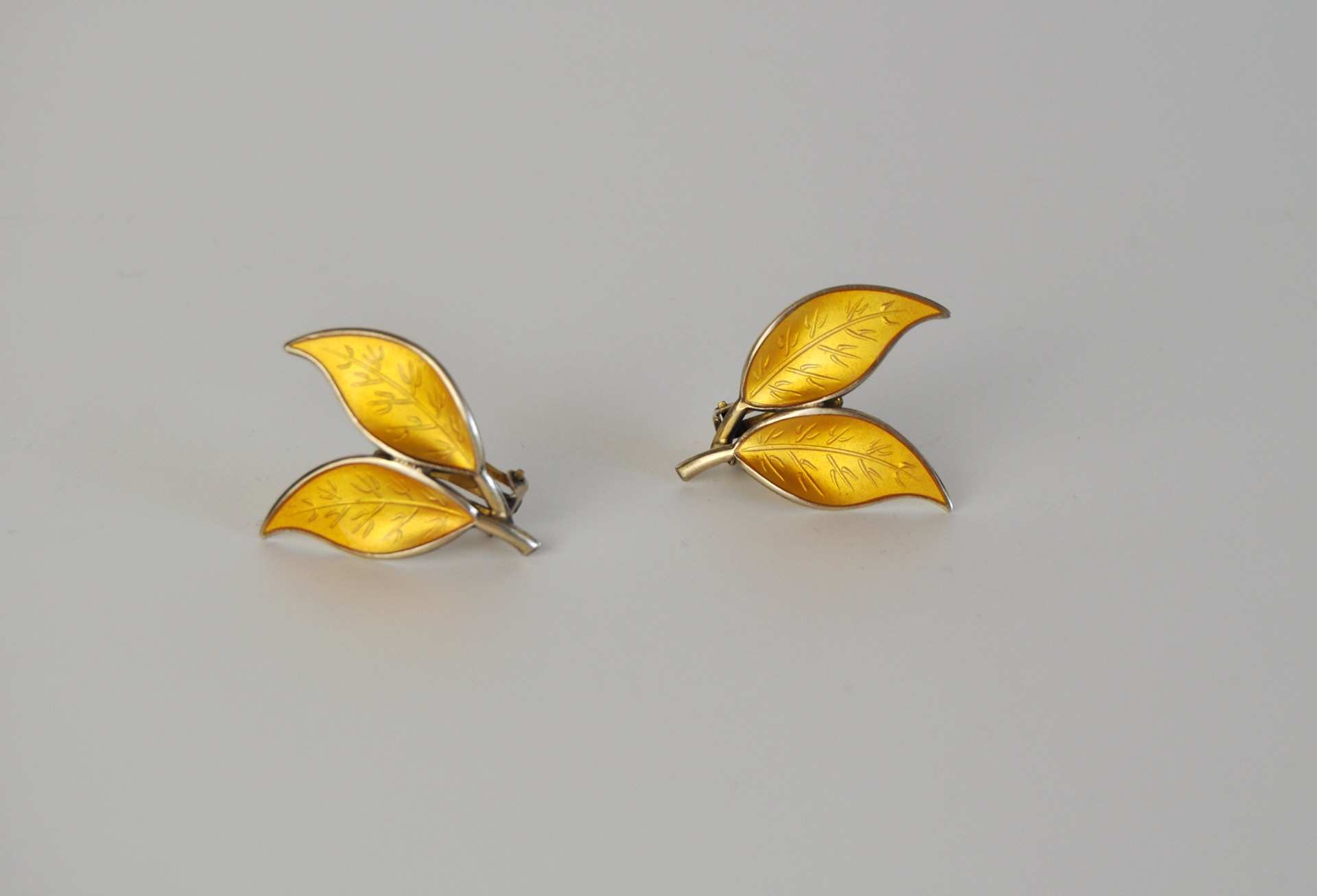 A set of Mid-century yellow enamel ear clips from the Norwegian jeweller, David Andersen. The ear clips takes the design of leafs set in solid silver and decorated with an unusual golden-yellow guilloche enamel. The enamel is complimented with gilded silver and is in an excellent condition without any flaws.