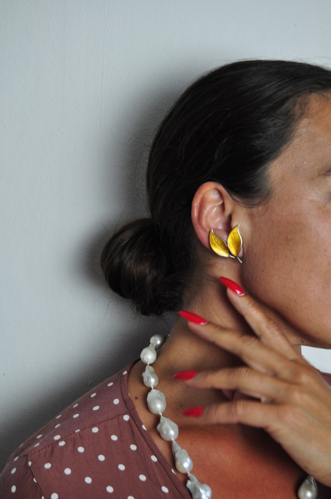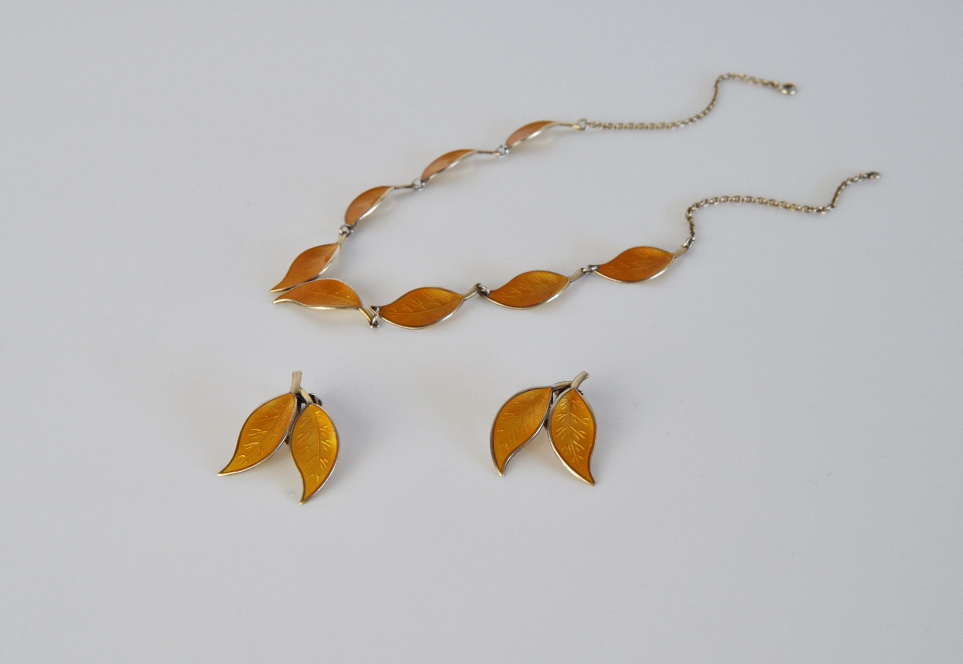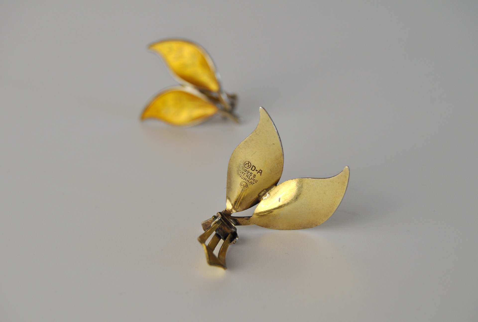 A set of Mid-century yellow enamel ear clips from the Norwegian jeweller, David Andersen. The ear clips takes the design of leafs set in solid silver and decorated with an unusual golden-yellow guilloche enamel. The enamel is complimented with gilded silver and is in an excellent condition without any flaws.
