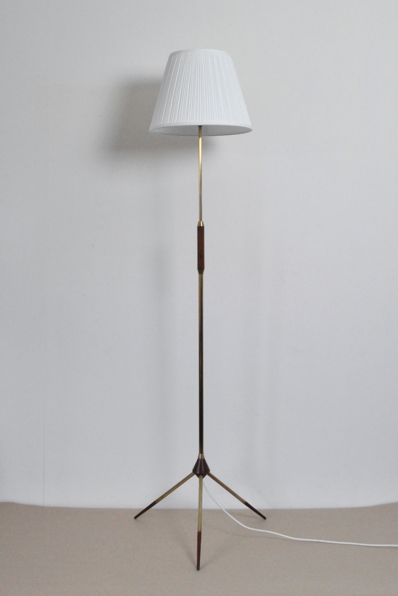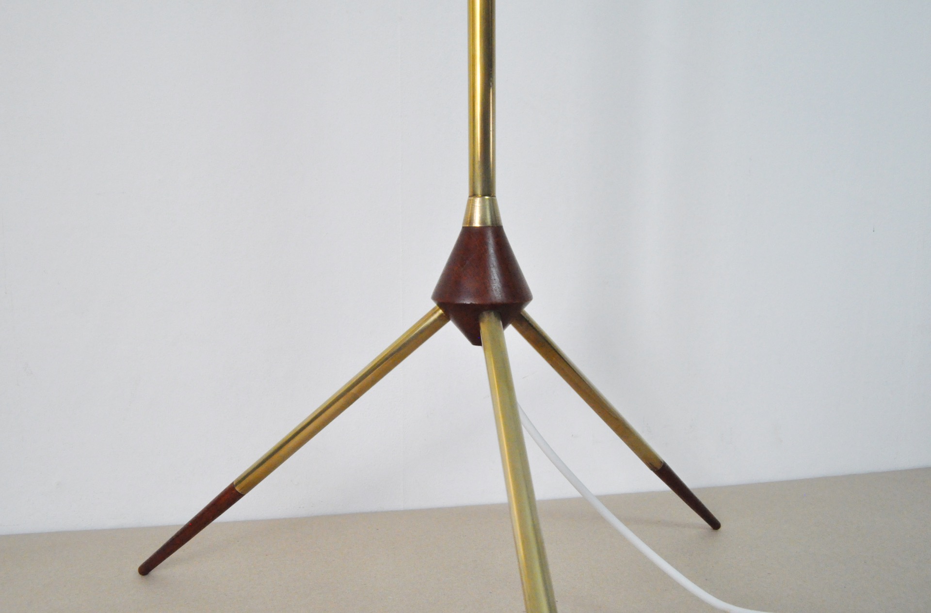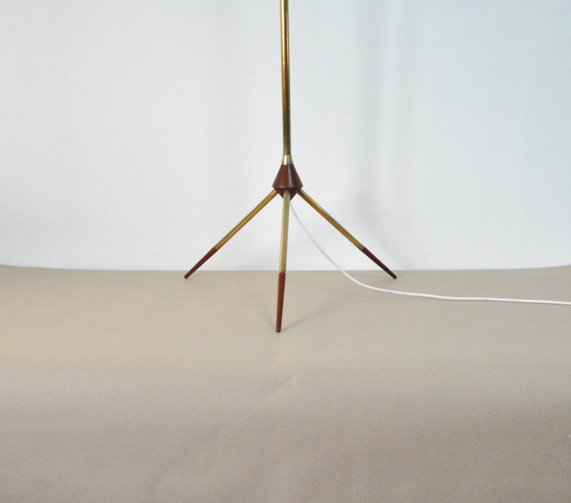MID-CENTURY MODERN TRIPOD FLOOR LAMP IN BRASS AND TEAK