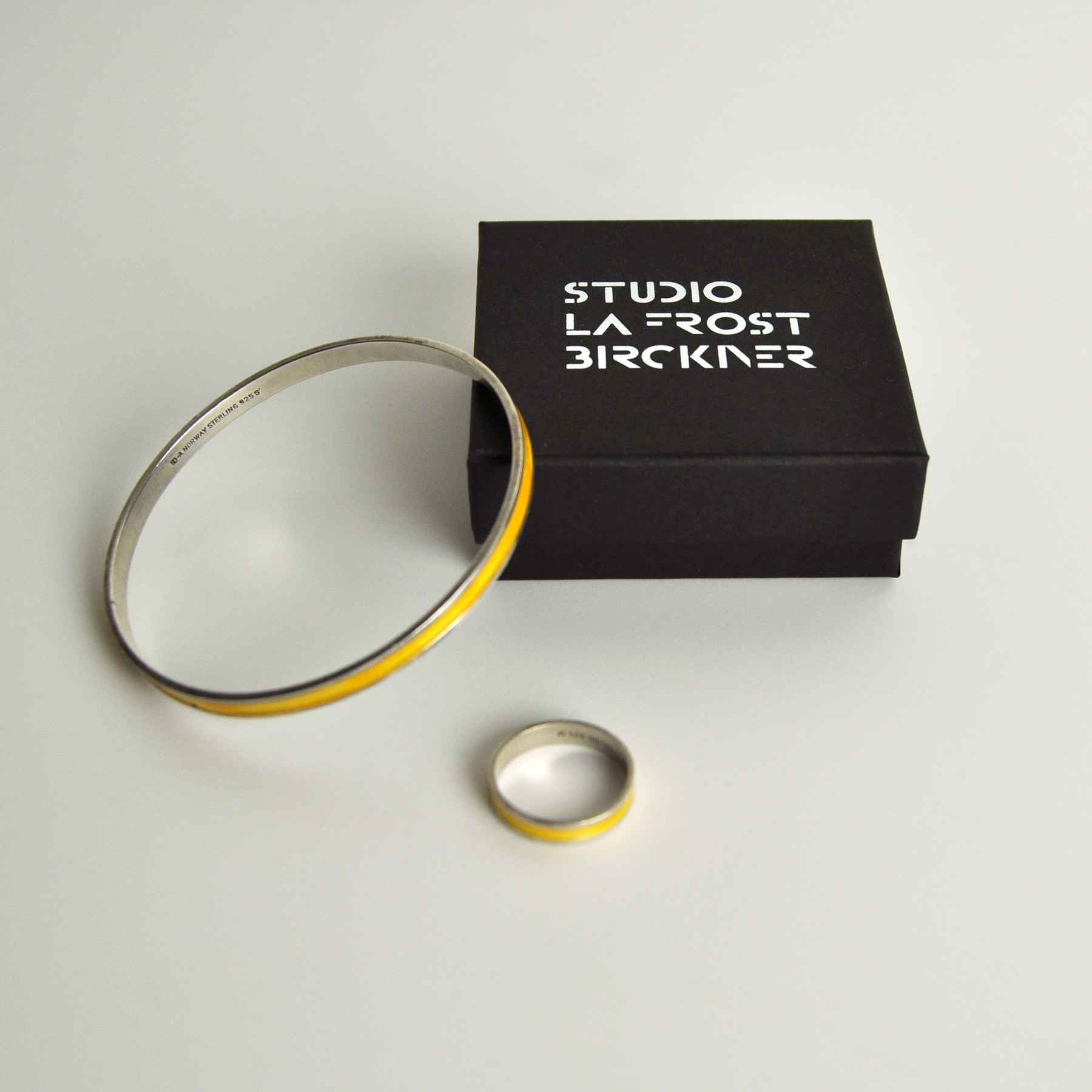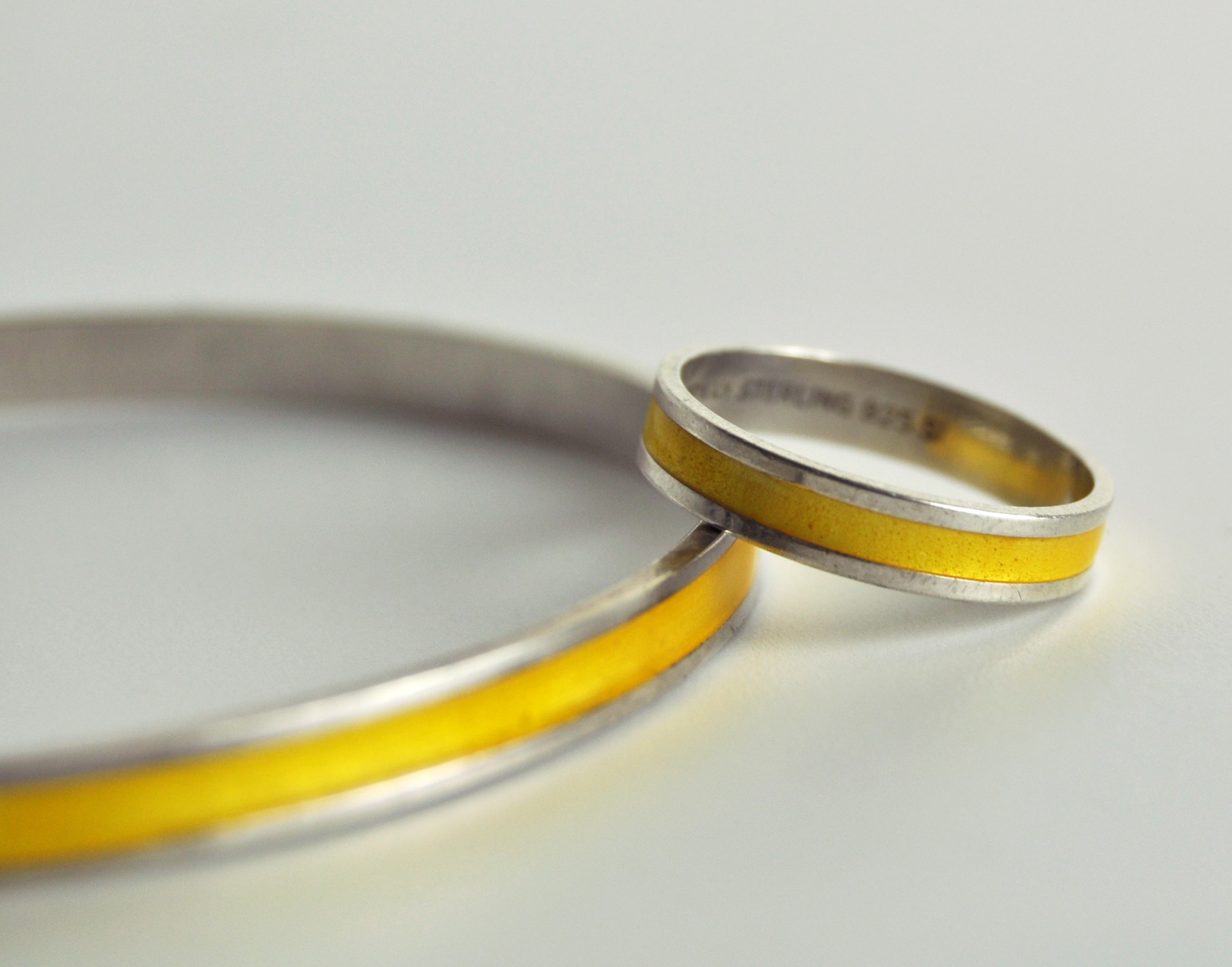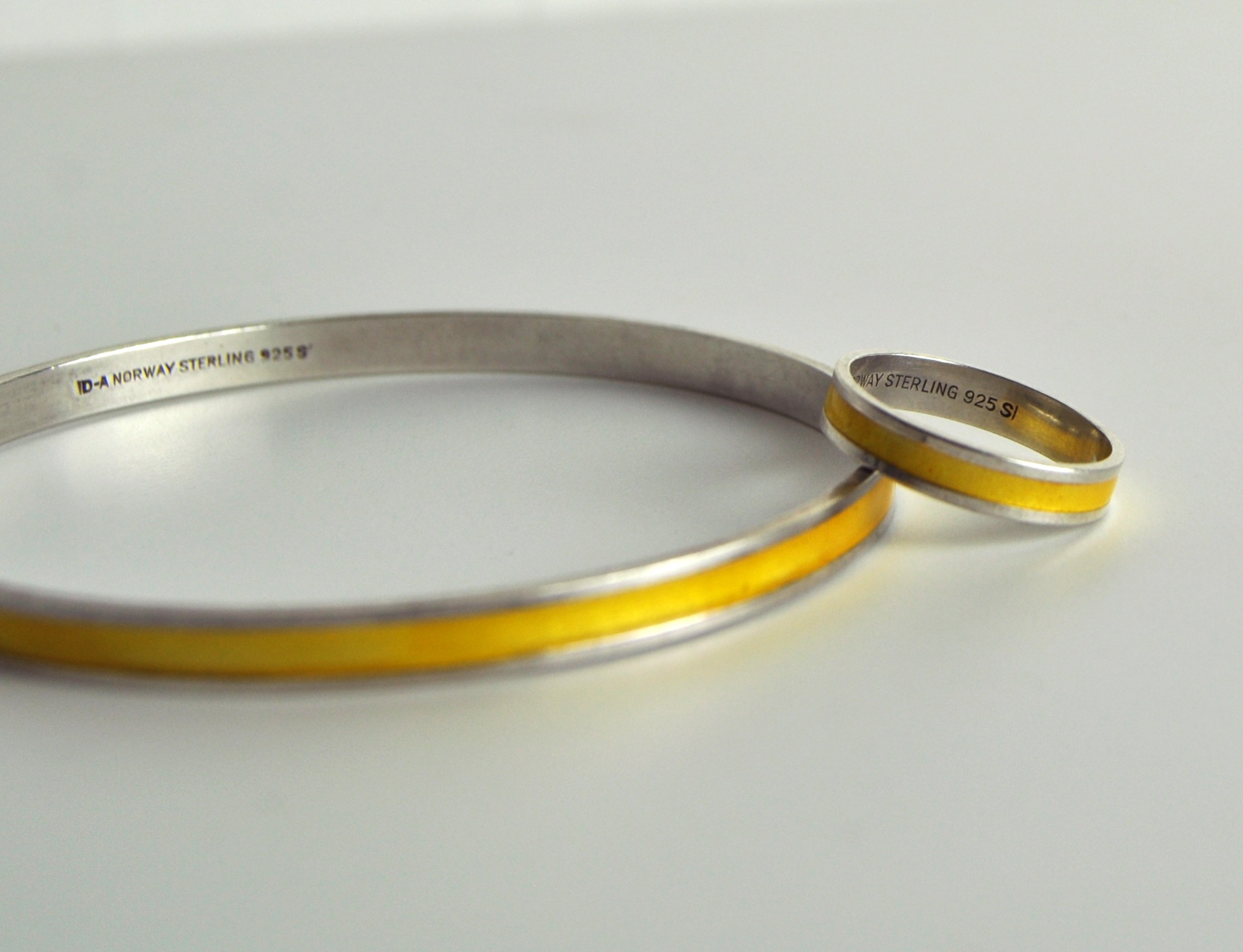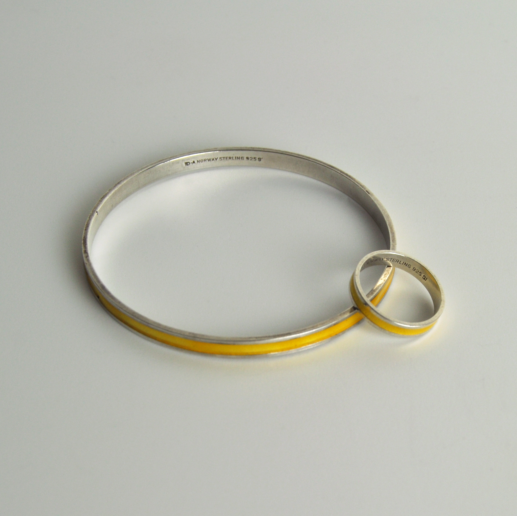 A set of a Mid-century ring and bracelet from the Norwegian jeweller, David Andersen. The set takes a nordic and minimalistic design, and is made of yellow enamel and sterling silver. Excellent condition without any flaws.