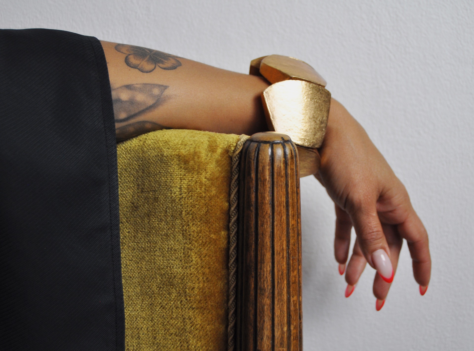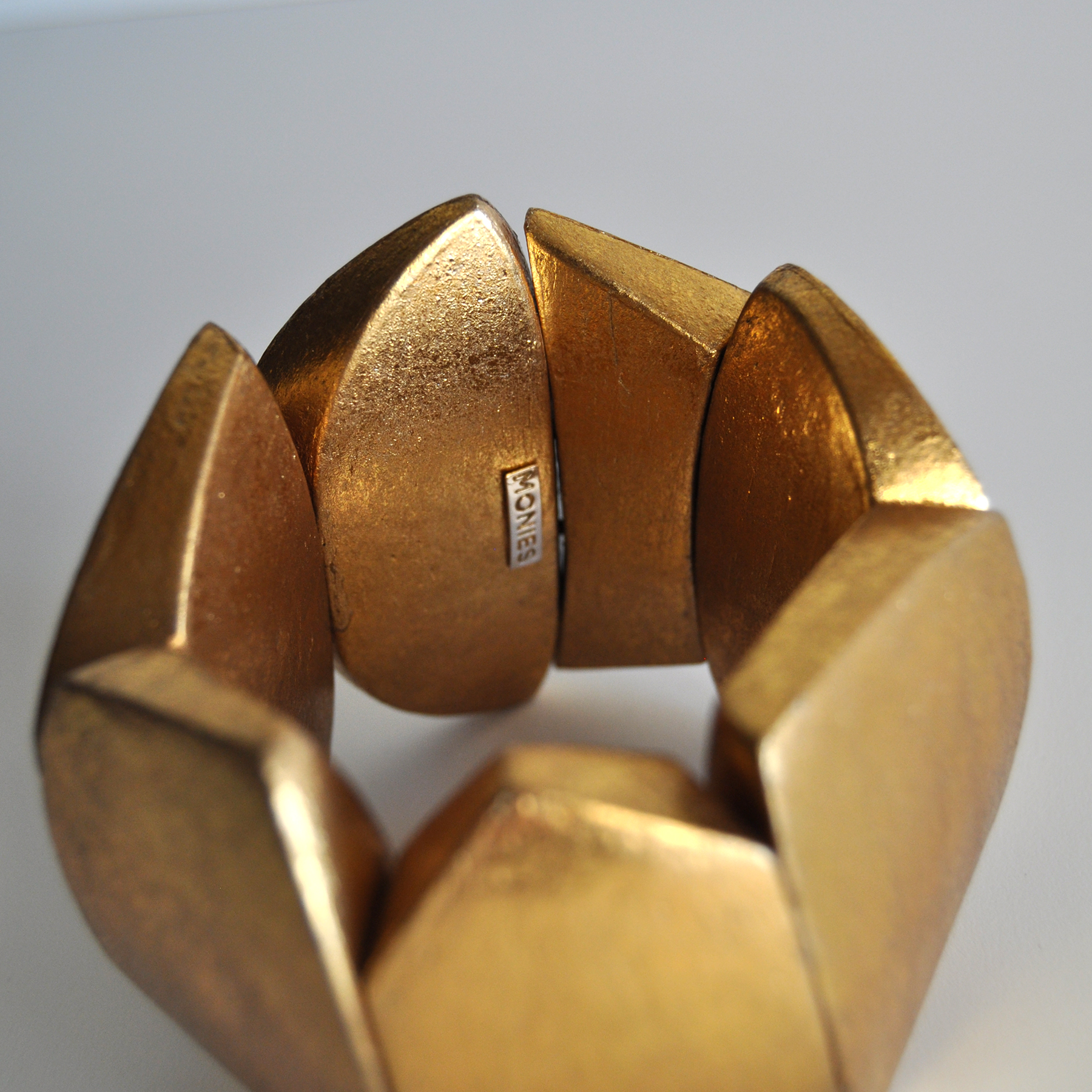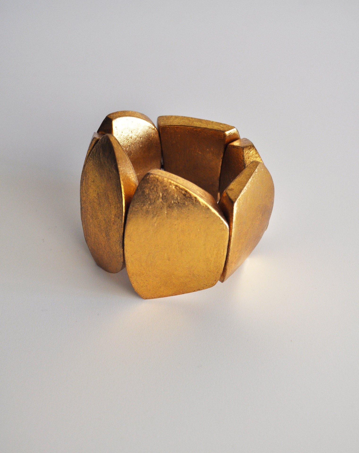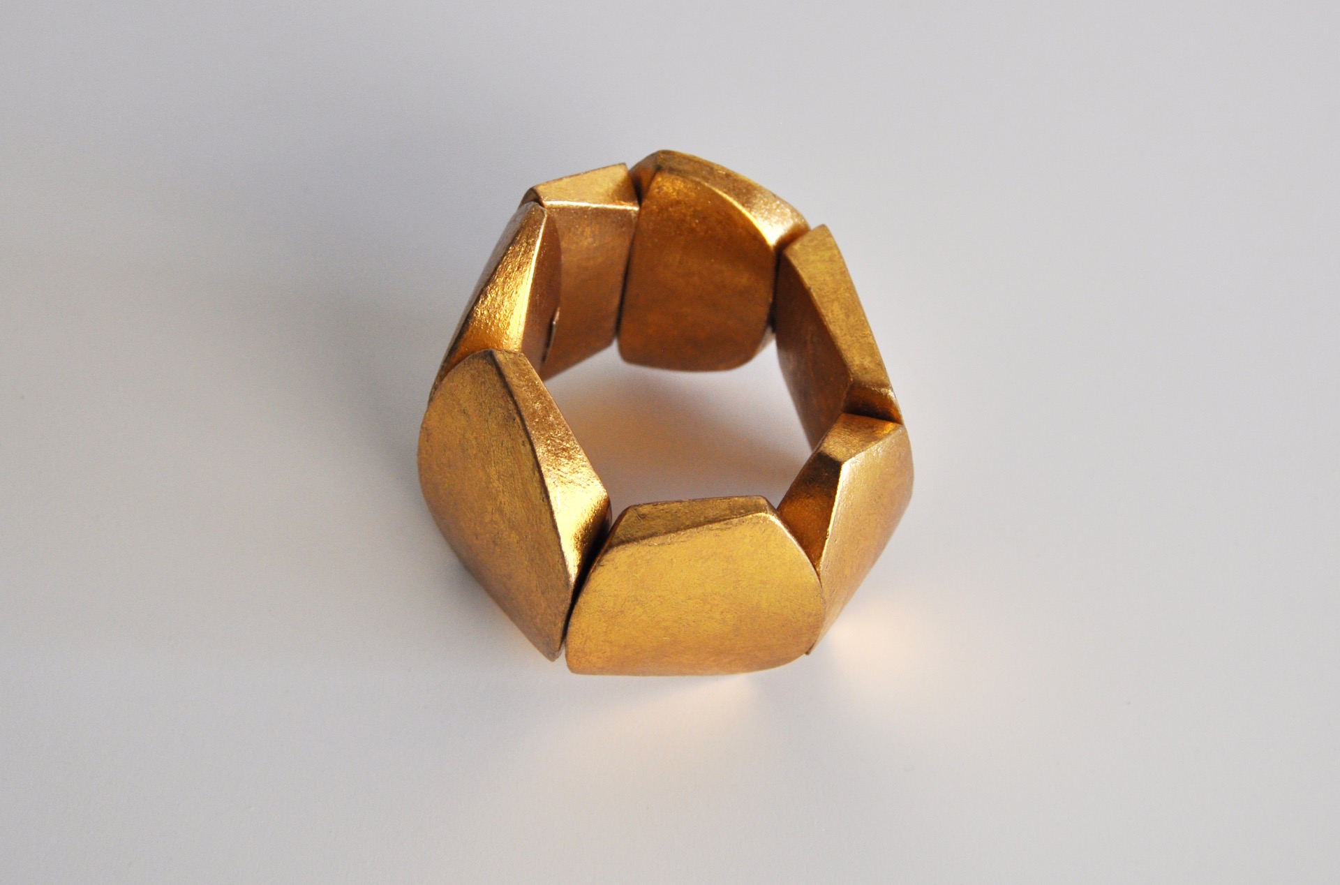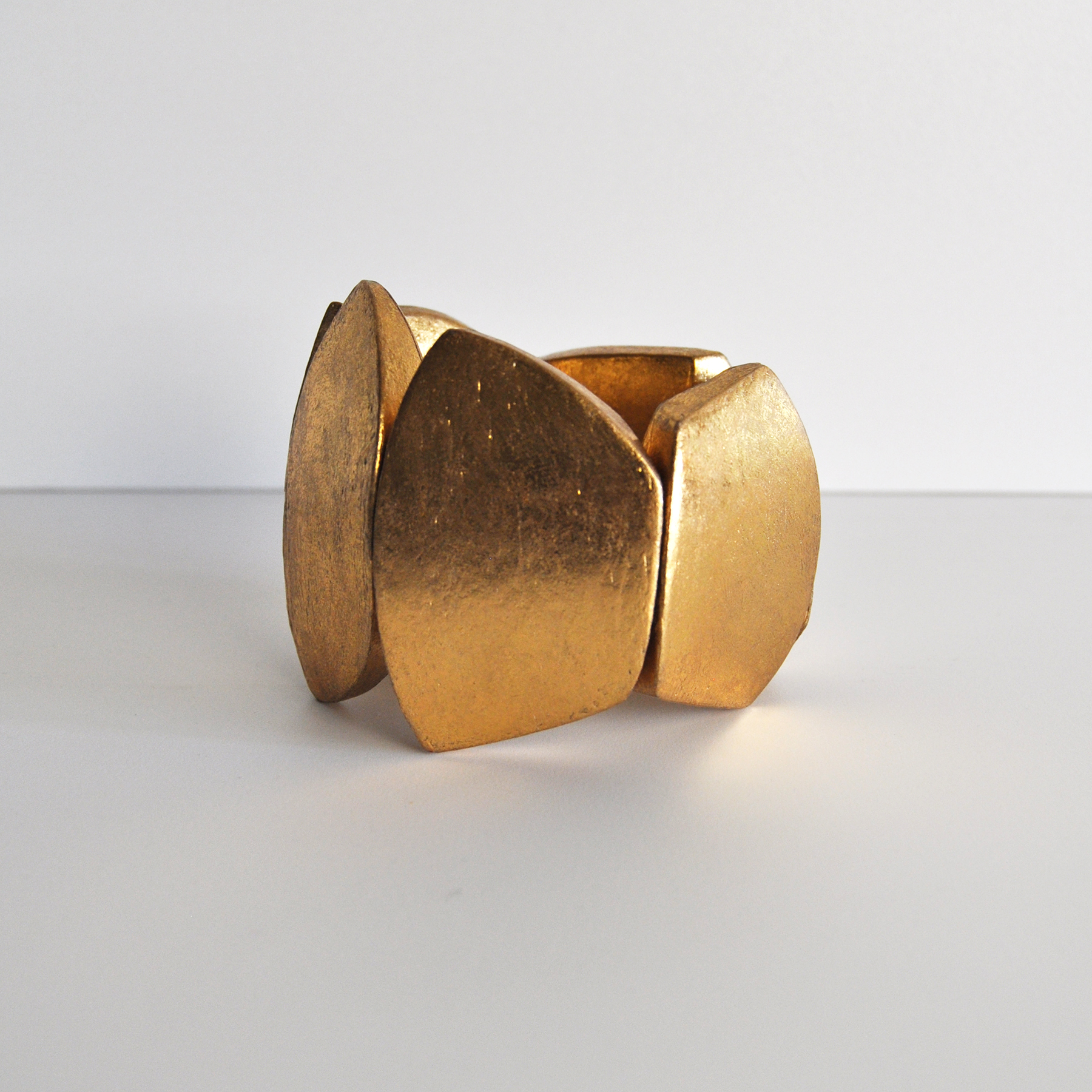 Sculptural goldfoil bracelet by Monies, Denmark. The Quinn bracelet is made from acacia pieces in a stretch design.