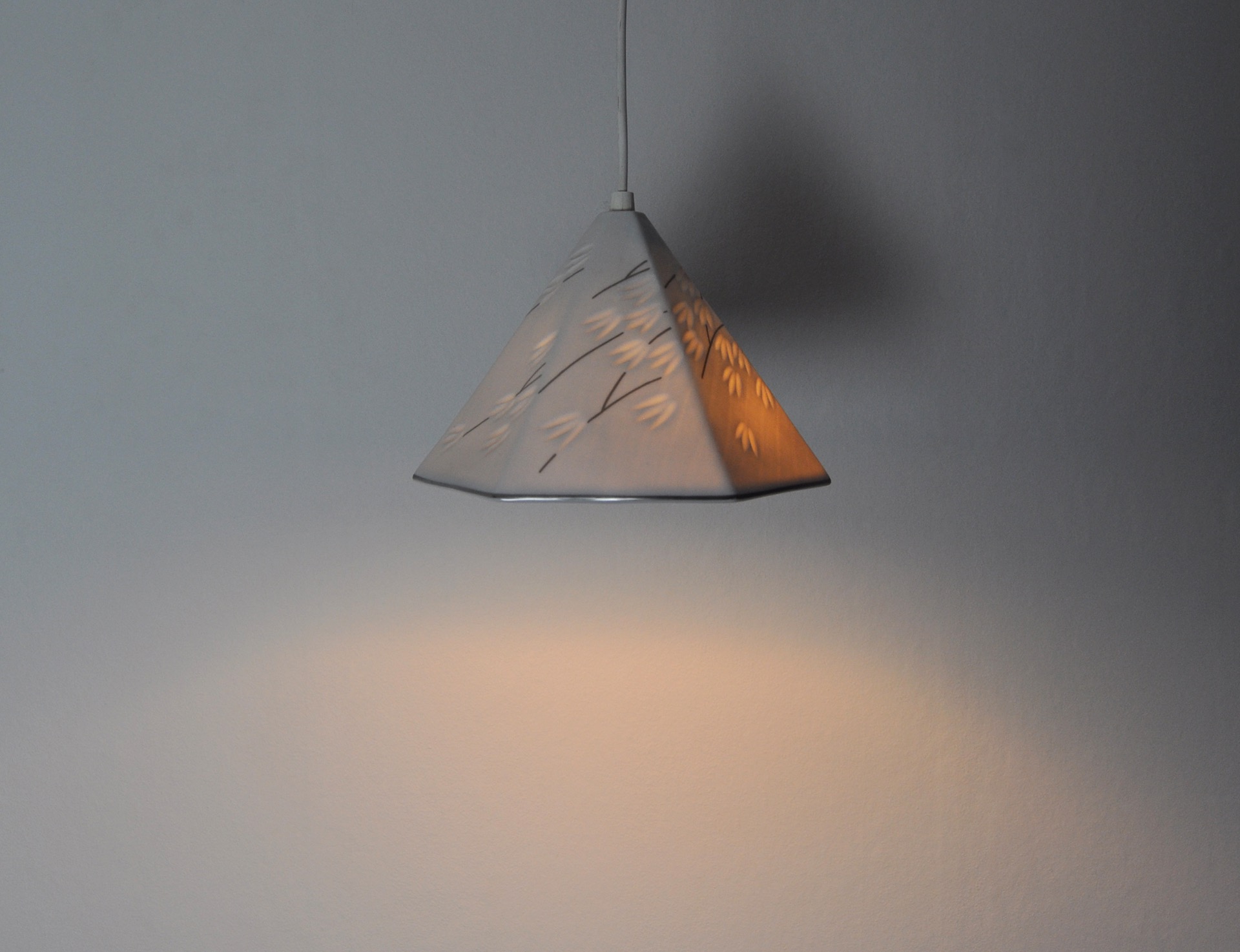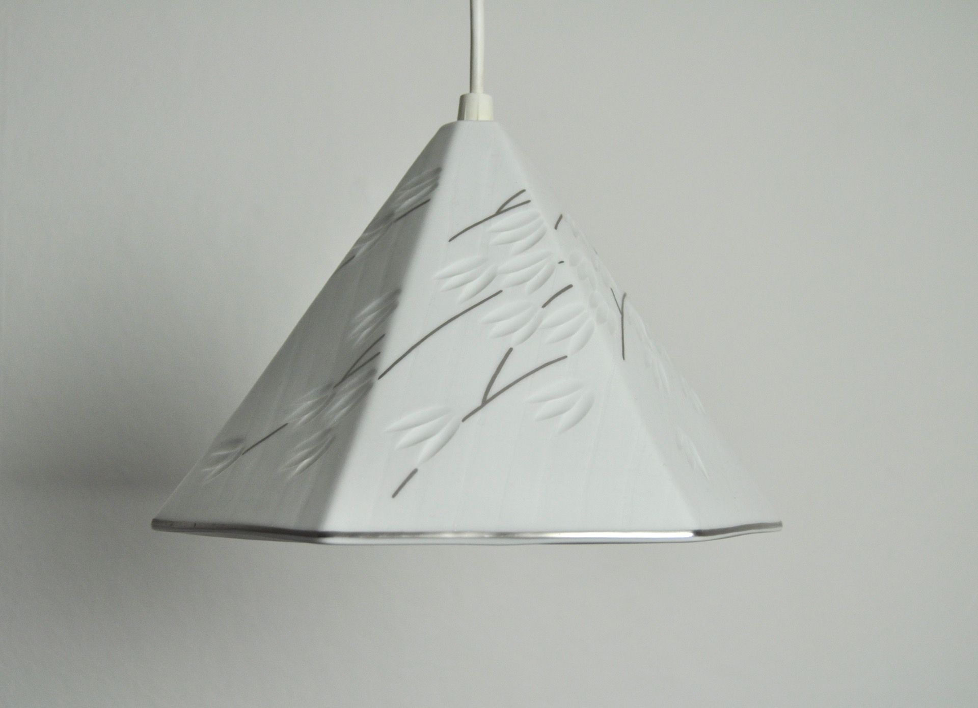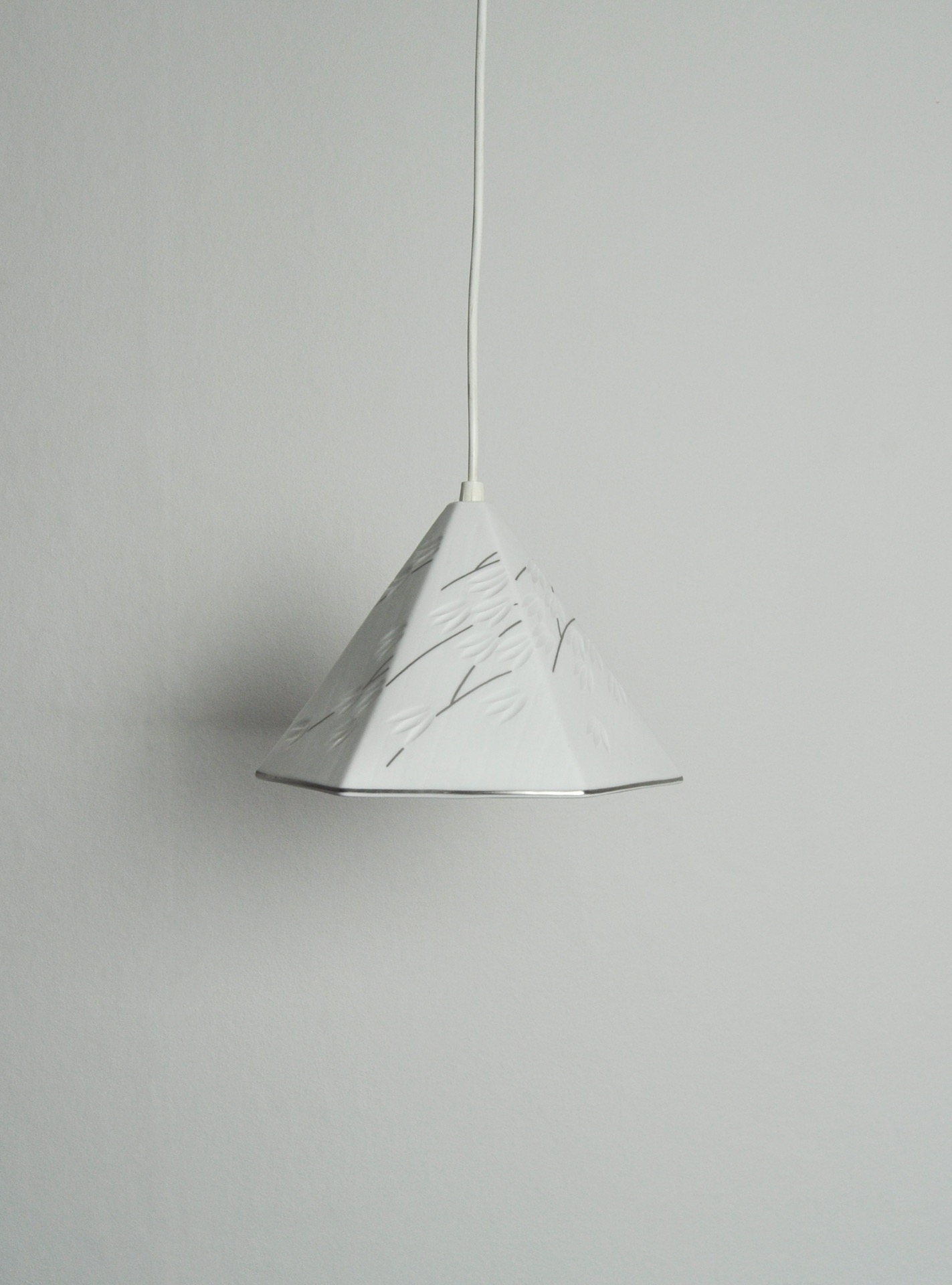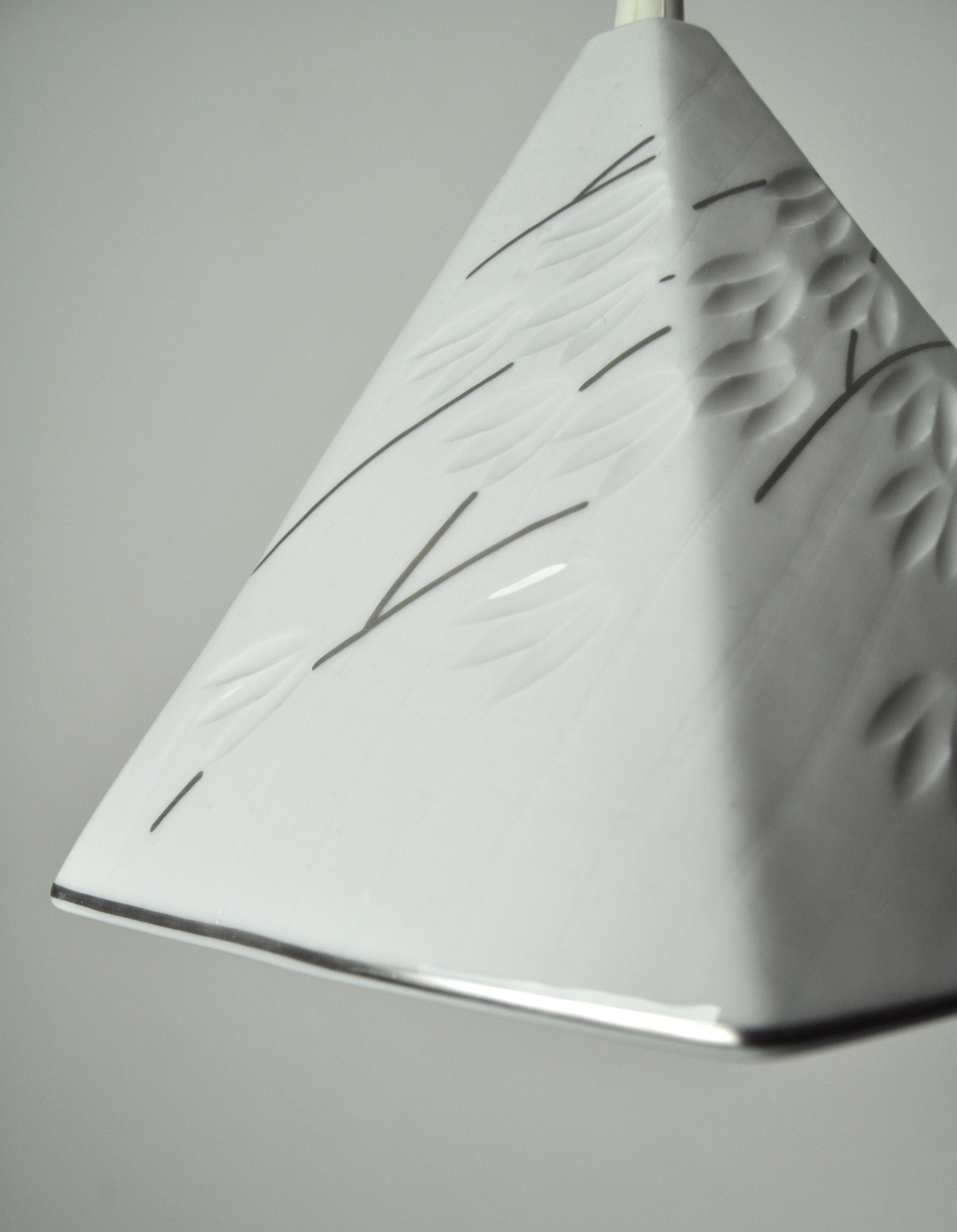 Blanc de chine porcelain 6-sided pendant with impressed leave motif and silver paint.