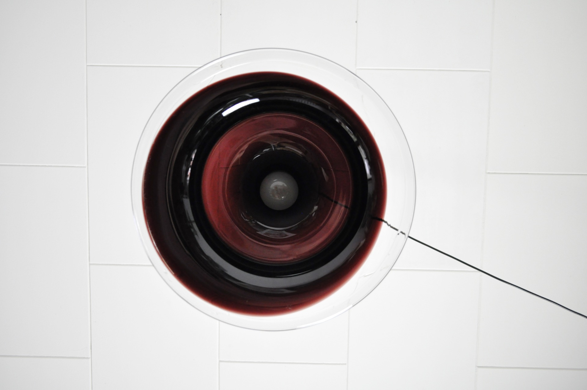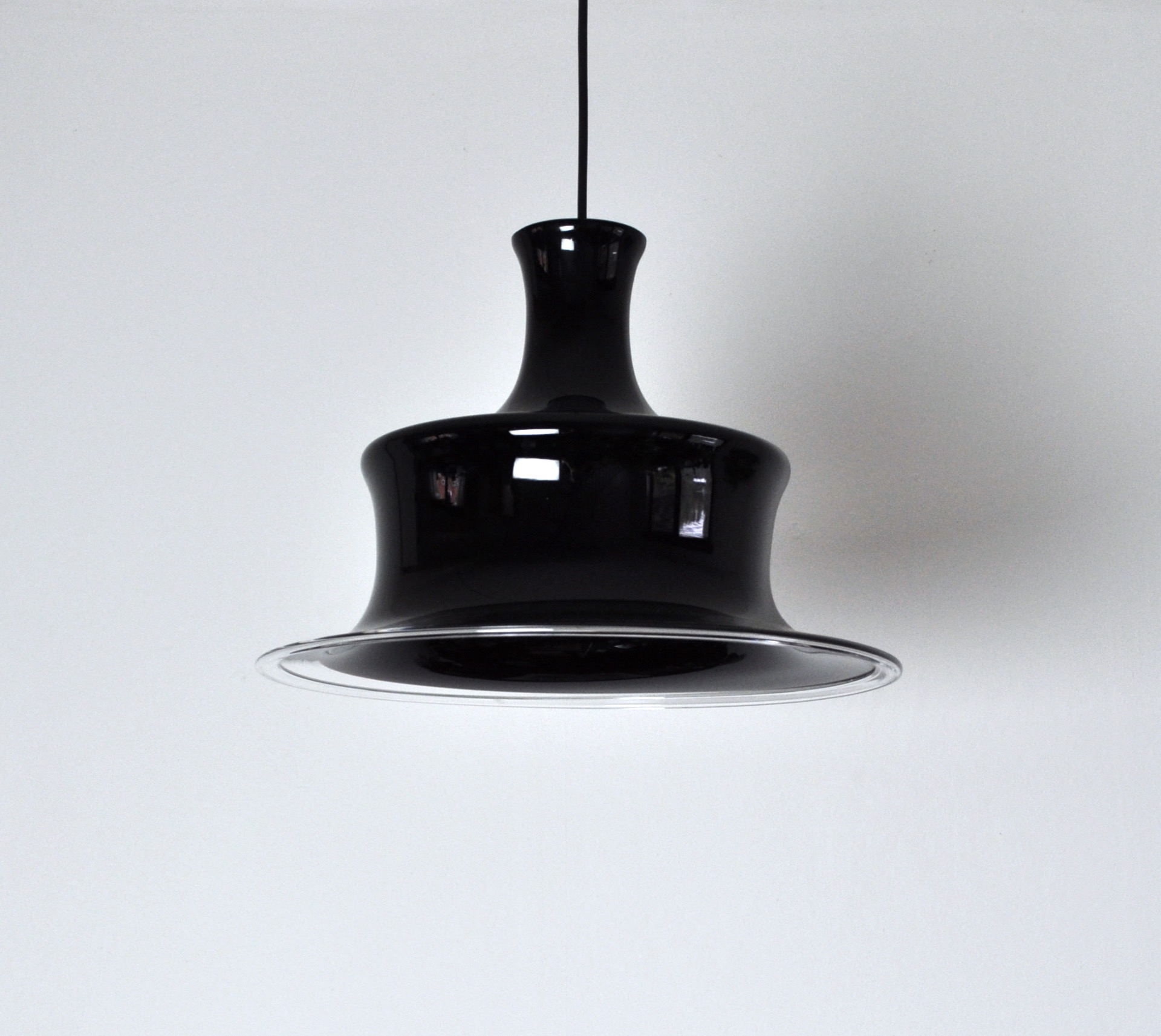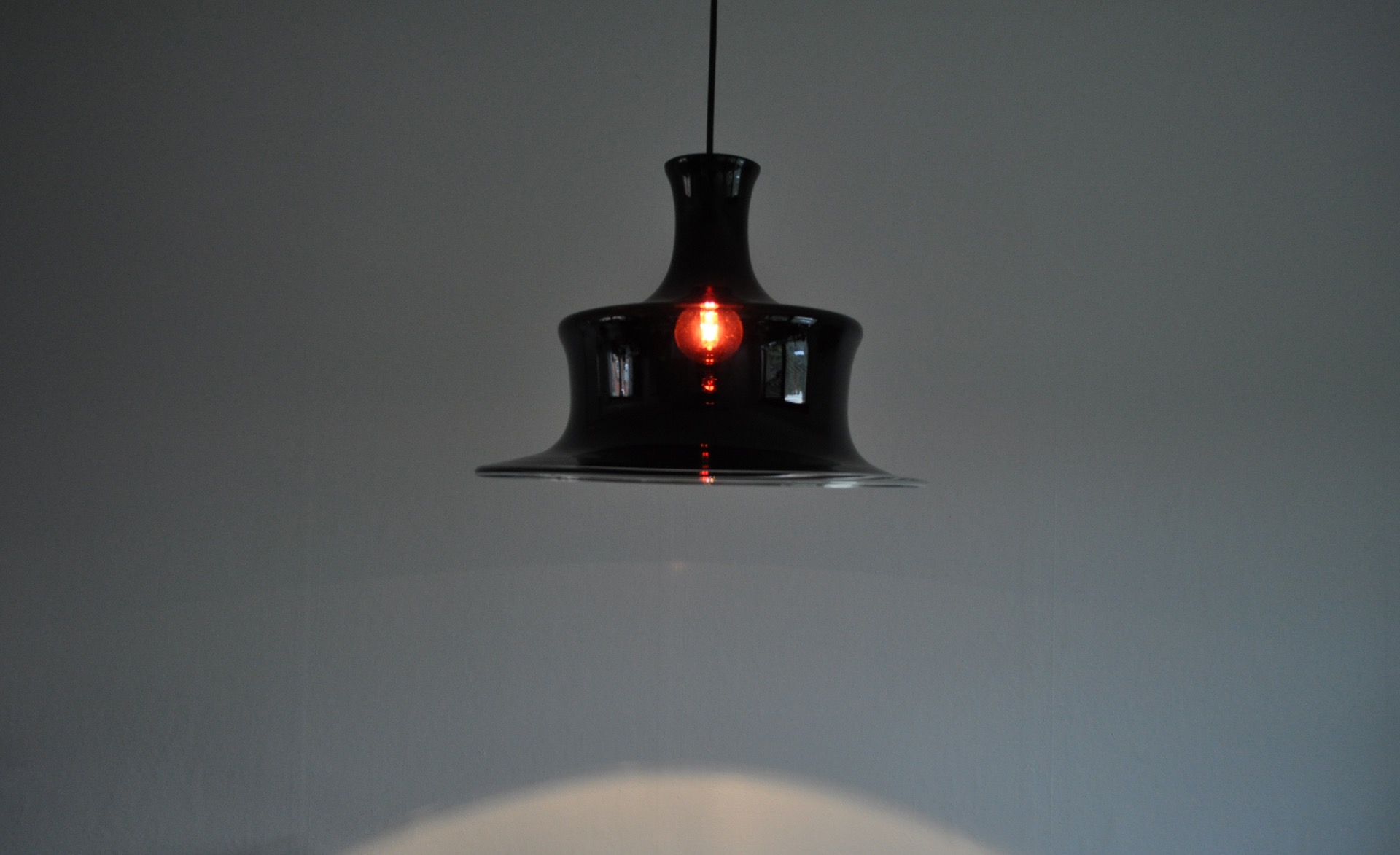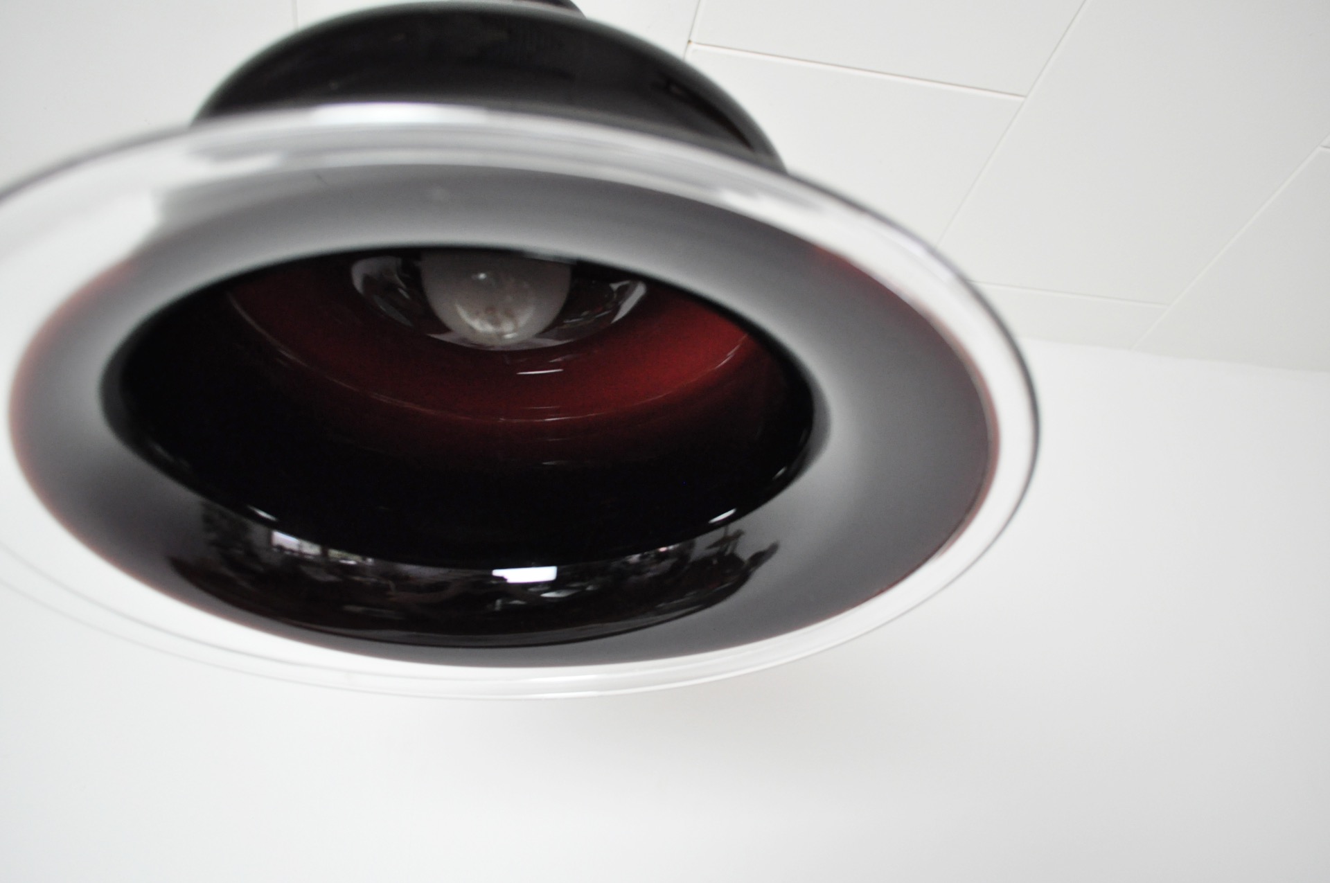 Ruby mouth blown opaline glass pendant "Sonate" designed by Michael Bang for Holmegaard (later Royal Copenhagen). Excellent condition, labeled by maker and rewired.
