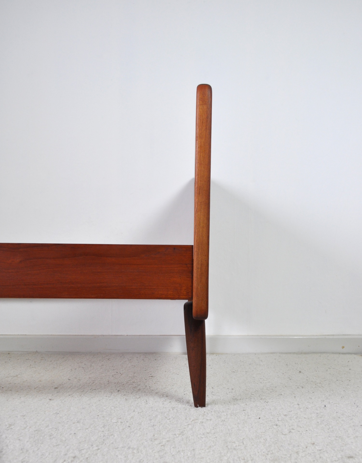 Beautiful curved midcentury teak bed with woven cane head and footboard. Fine craftsmanship by Horsnæs, Denmark.