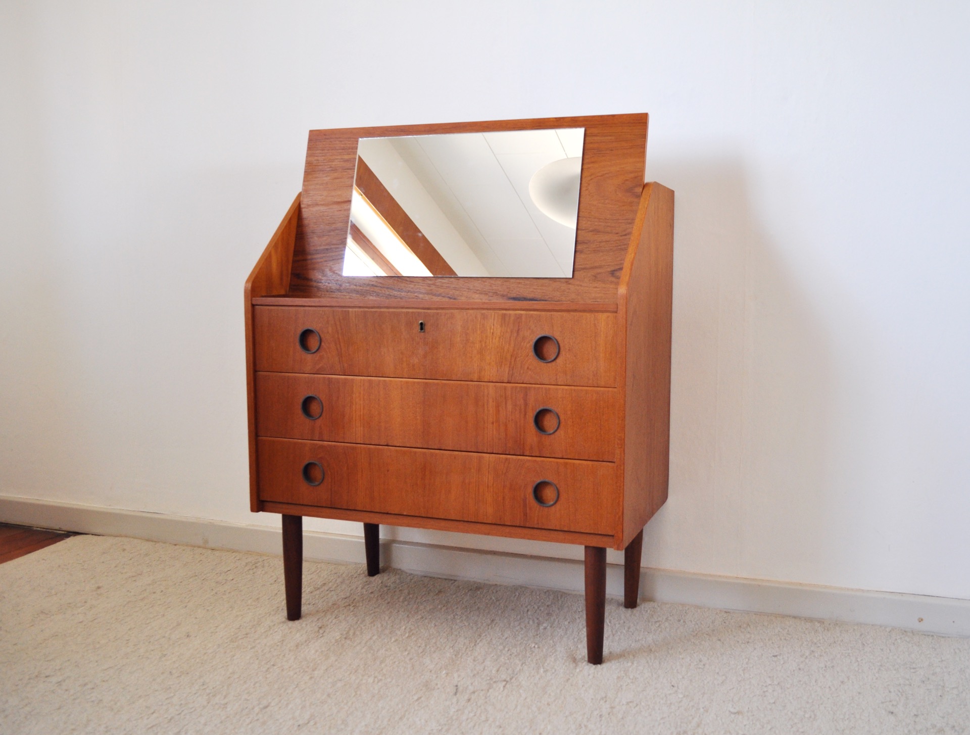 Swedish Secretaire or chest of drawers, 1970s. Teak veneer and legs made of solid teak. The top has cubby holes and 2 small drawers. Lower section has three large drawers with round plastic handles. One divided and painted. The desk can be pulled out and/or raised to reveal a mounted mirror.