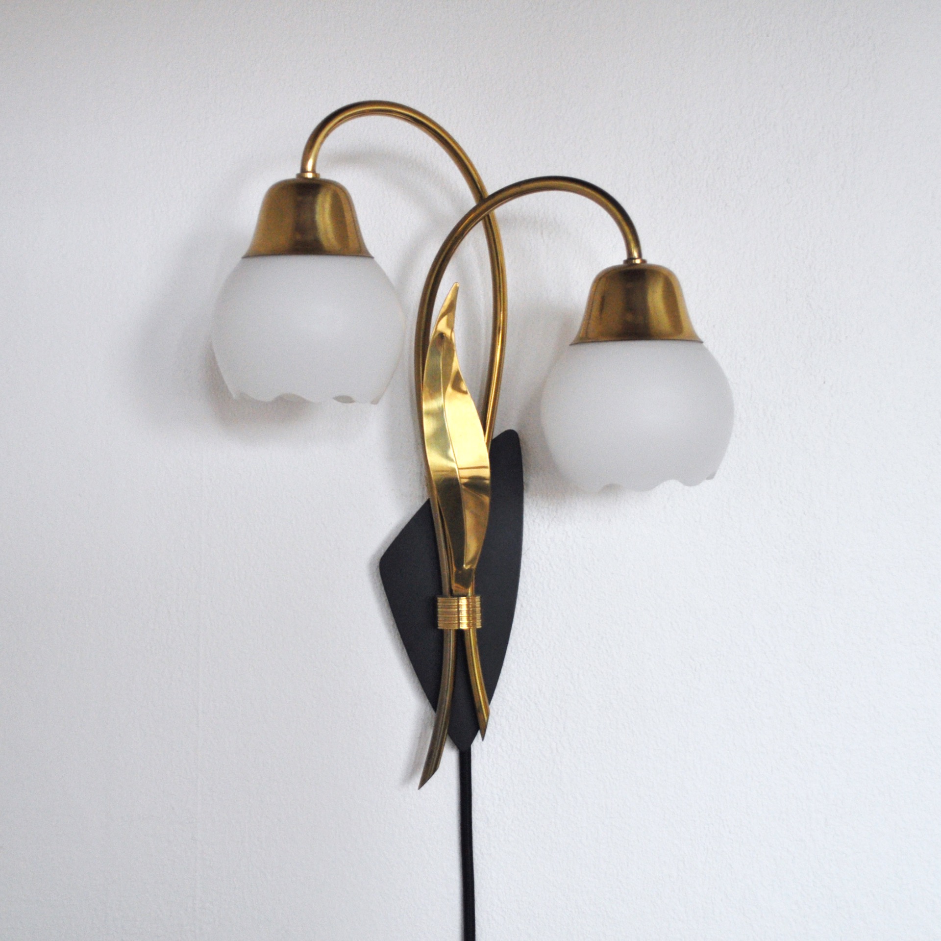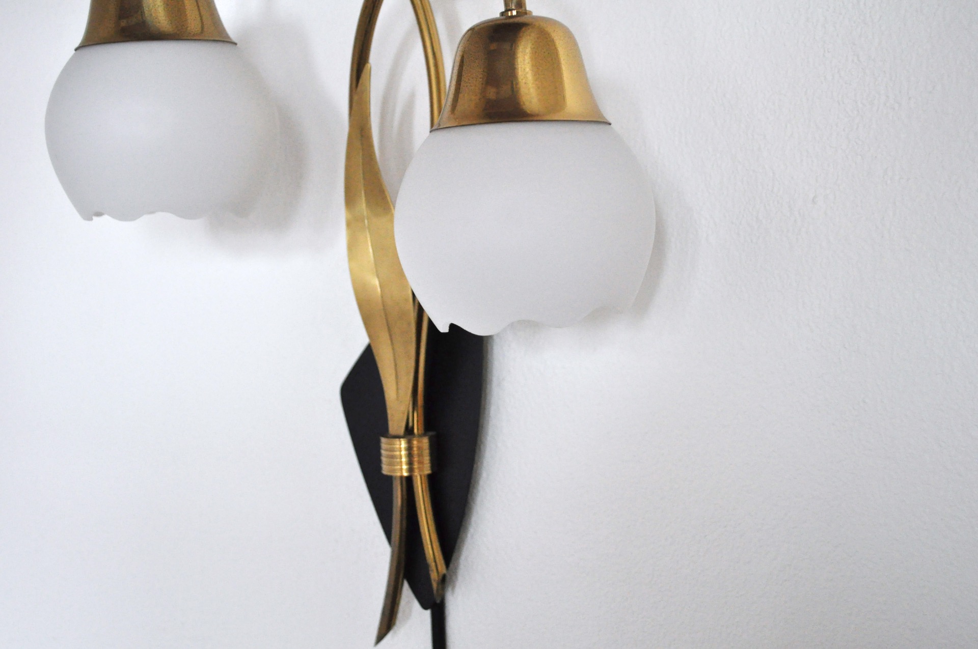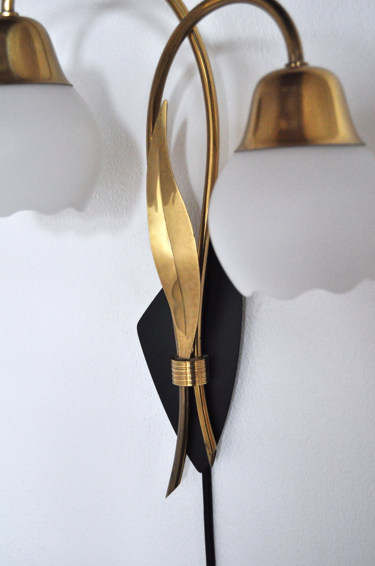 The wall light has a stylized organic design with two arms and a leave in brass on a black metal plate. Shades in opaline glass.
