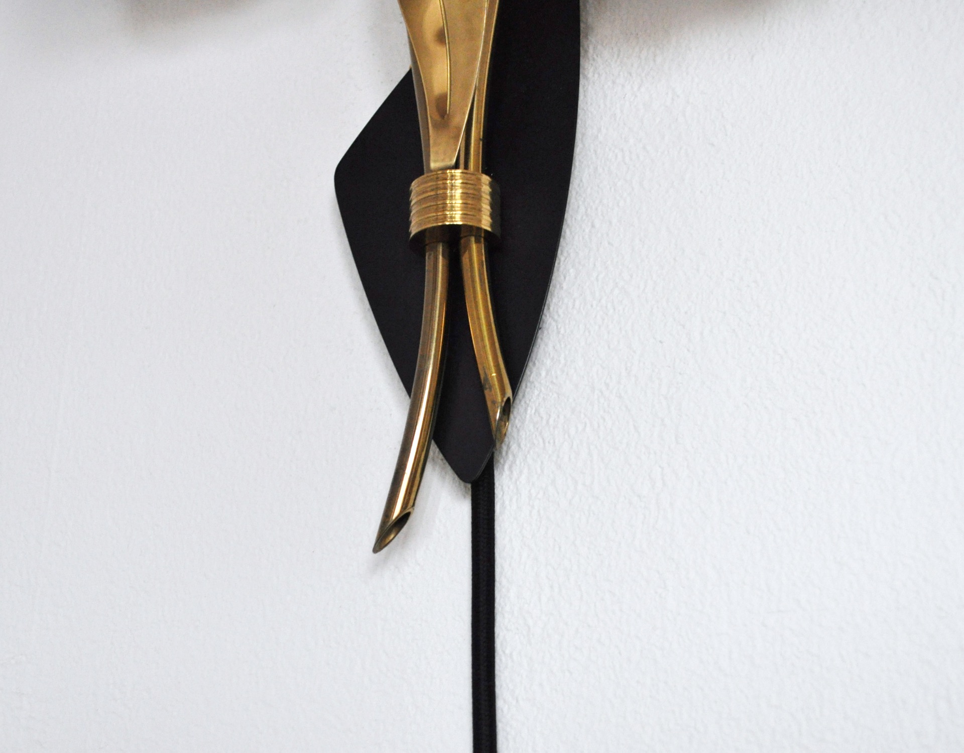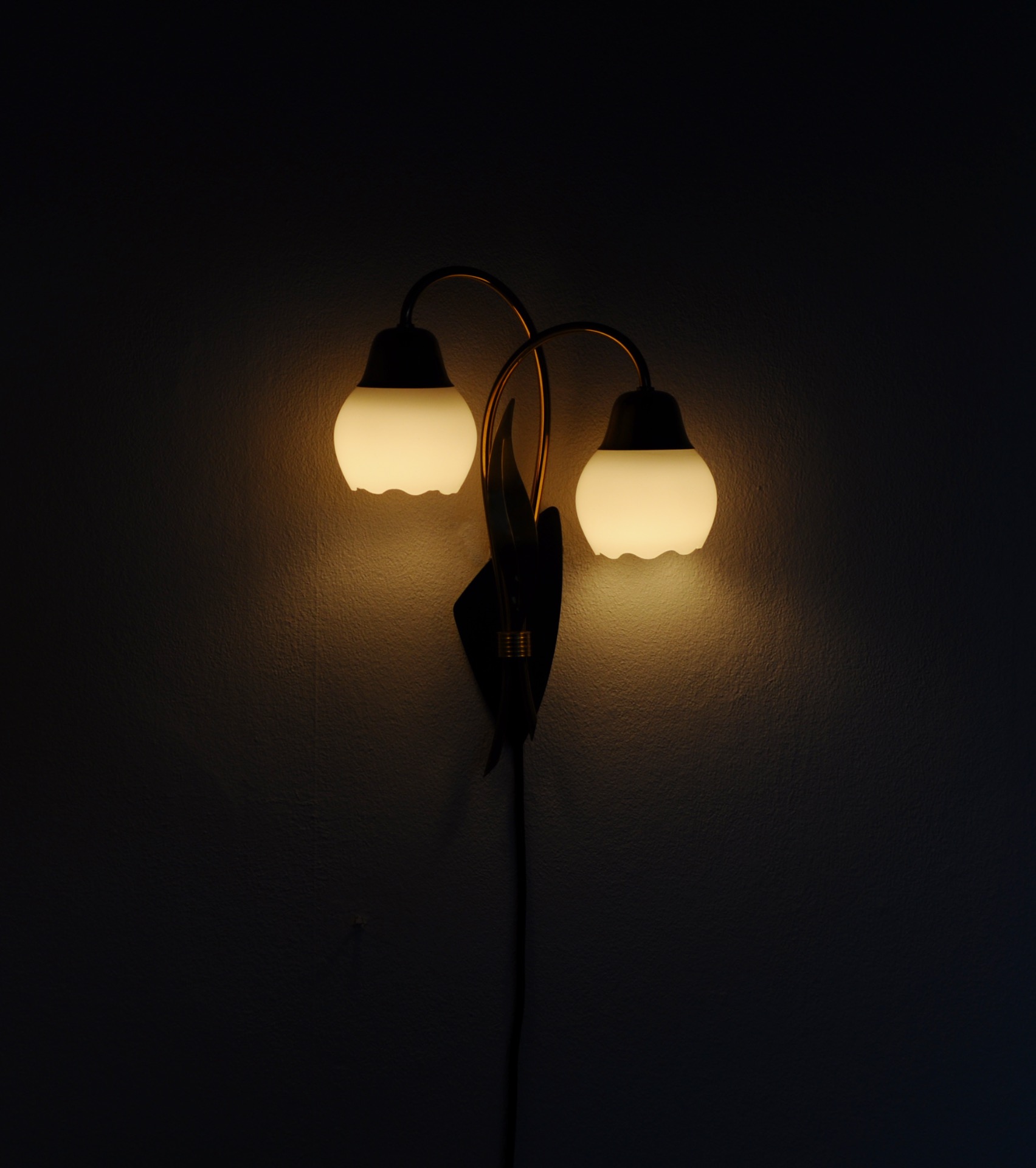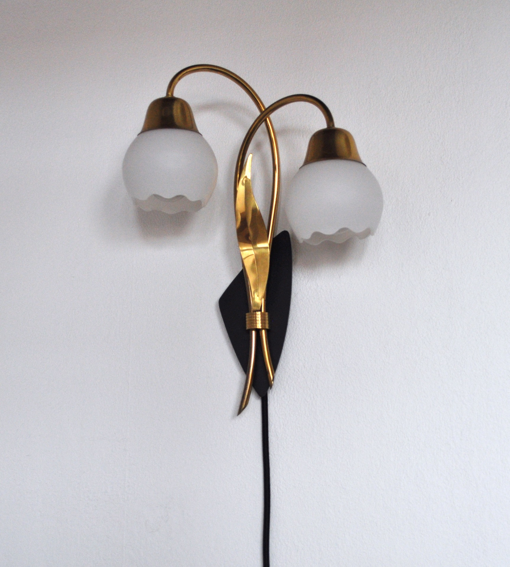 The wall light has a stylized organic design with two arms and a leave in brass on a black metal plate. Shades in opaline glass.
